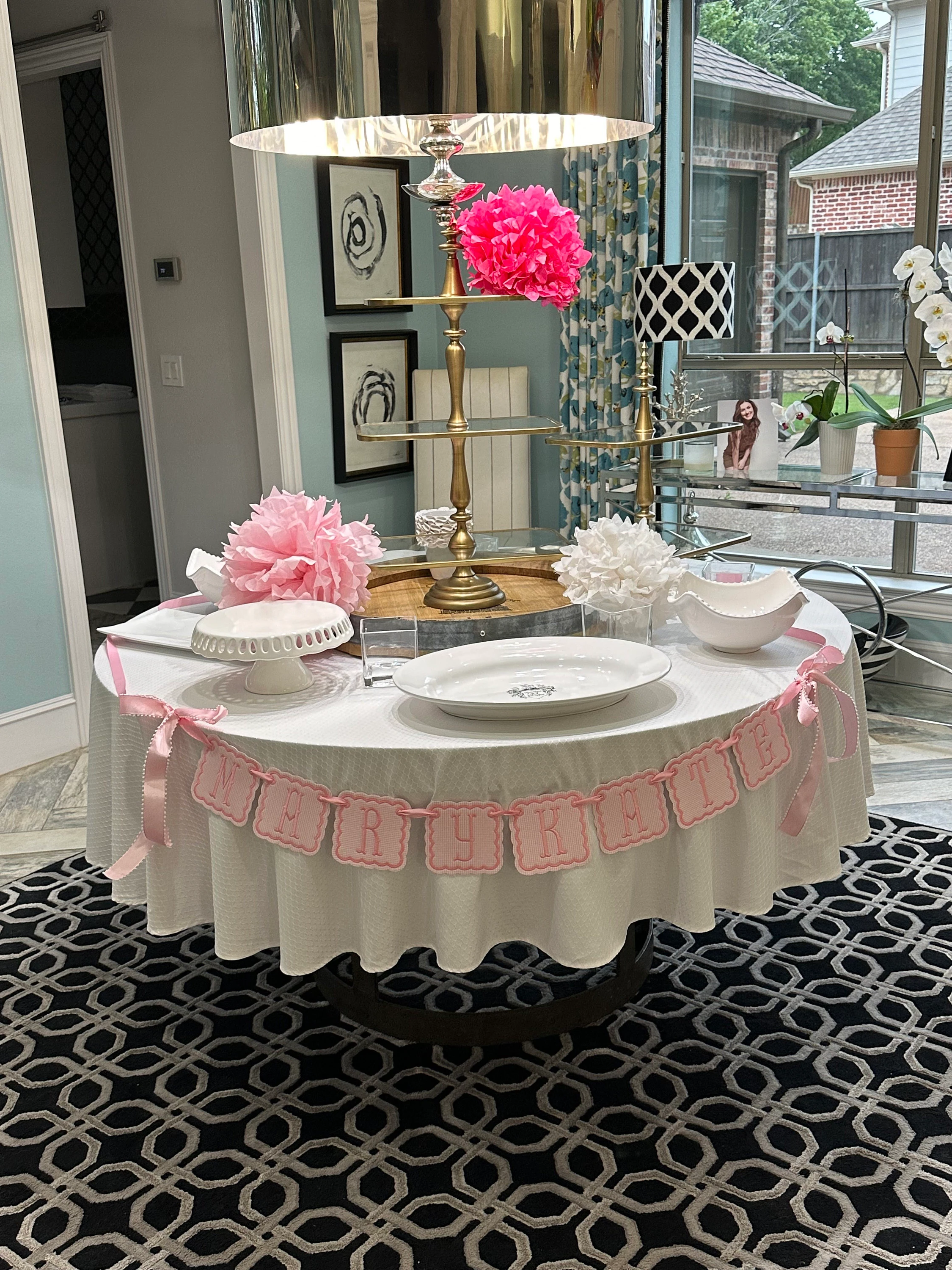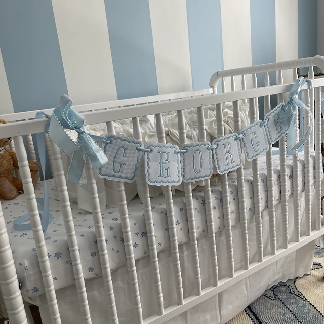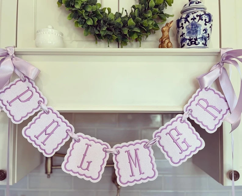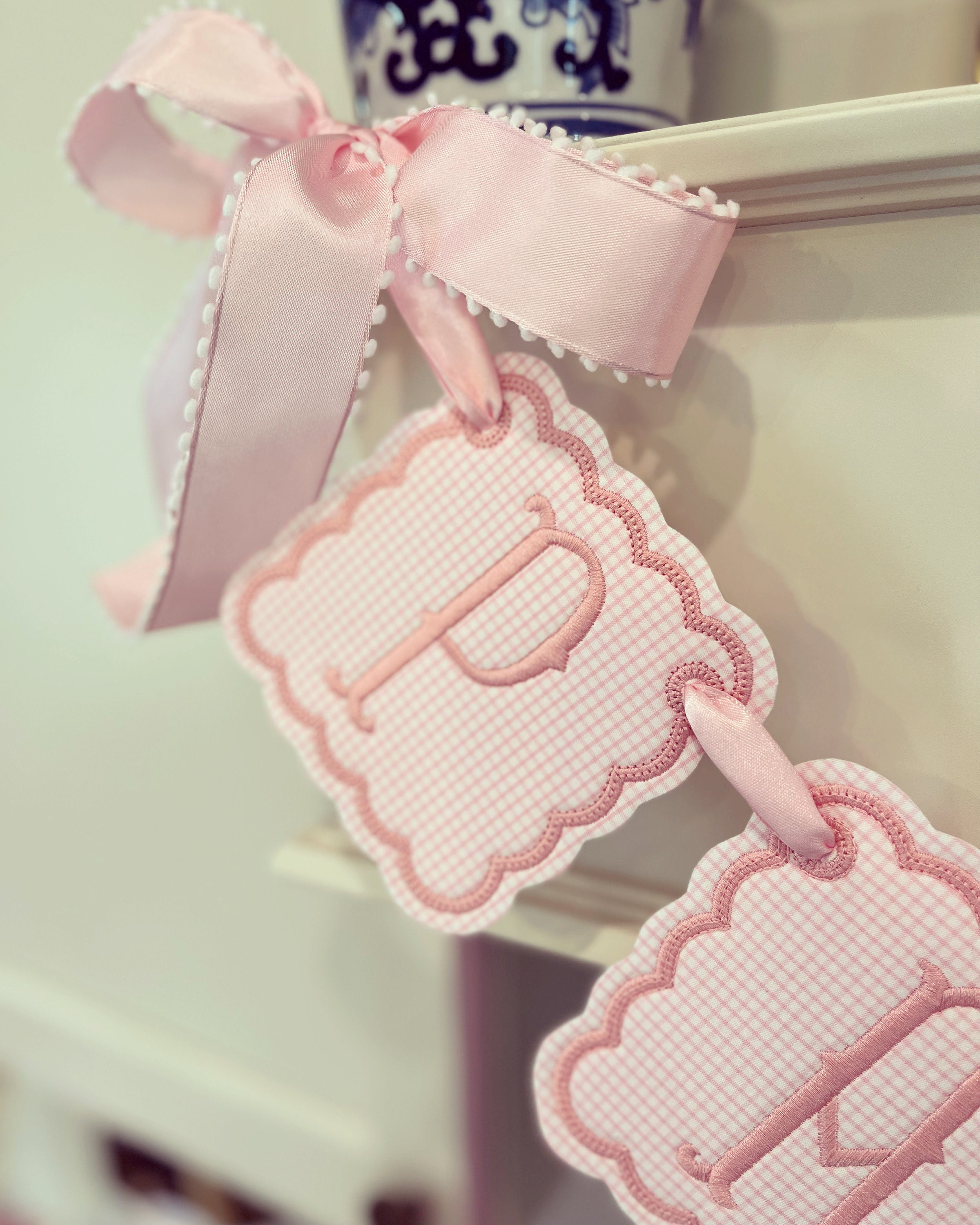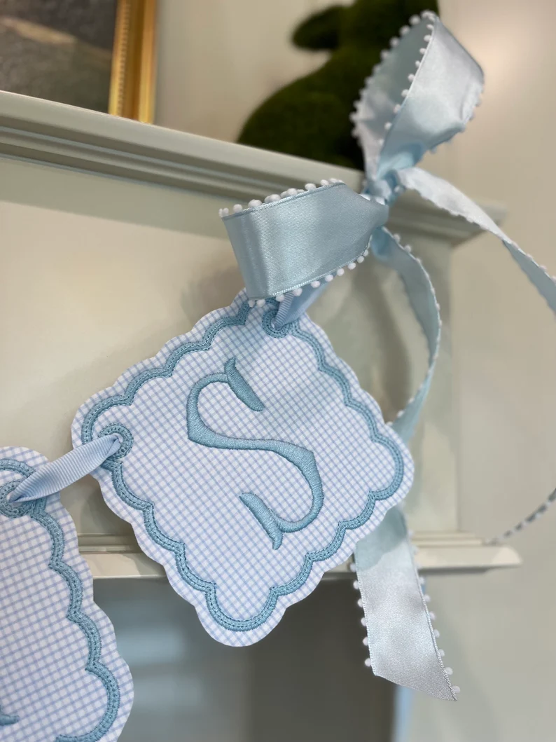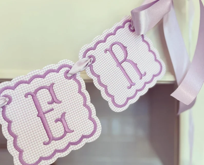 Pink/Blue/Lavender windowpane embroidered baby name banner.