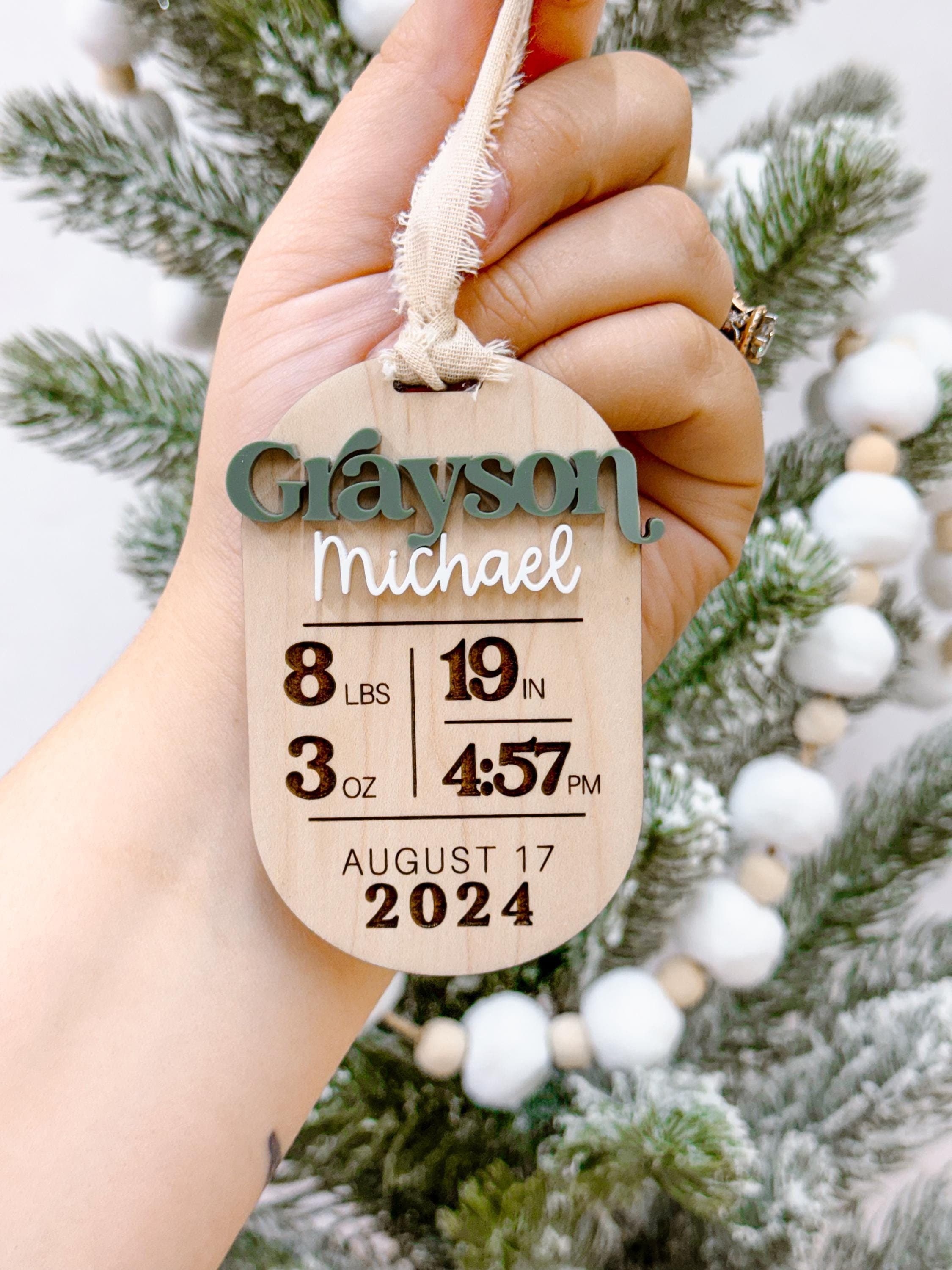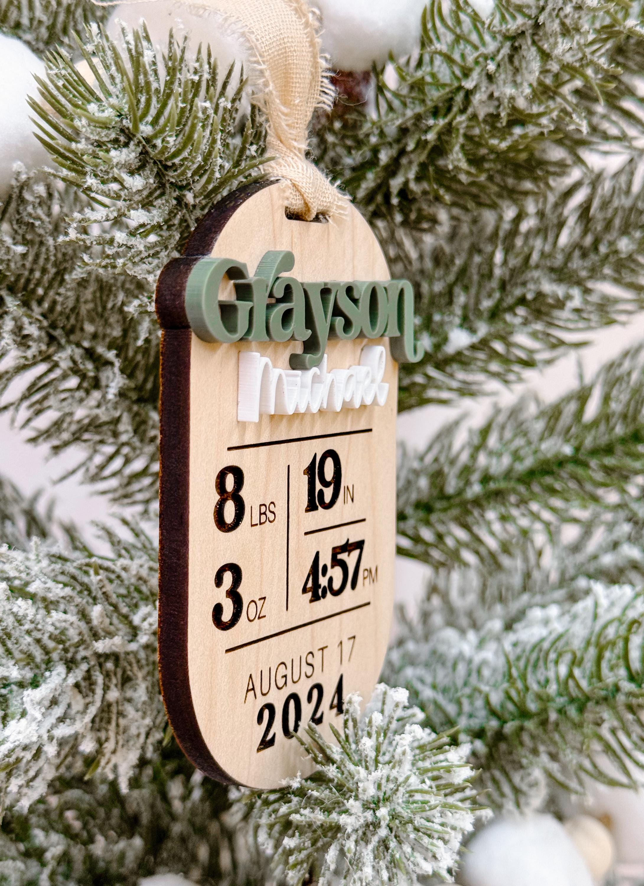 Celebrate the joy of your little one's arrival with our Personalized Birth Stat Ornament! Crafted from high-quality maple and acrylic, this keepsake combines natural beauty with a modern touch, making it the perfect addition to your holiday decor or a thoughtful gift for new parents.