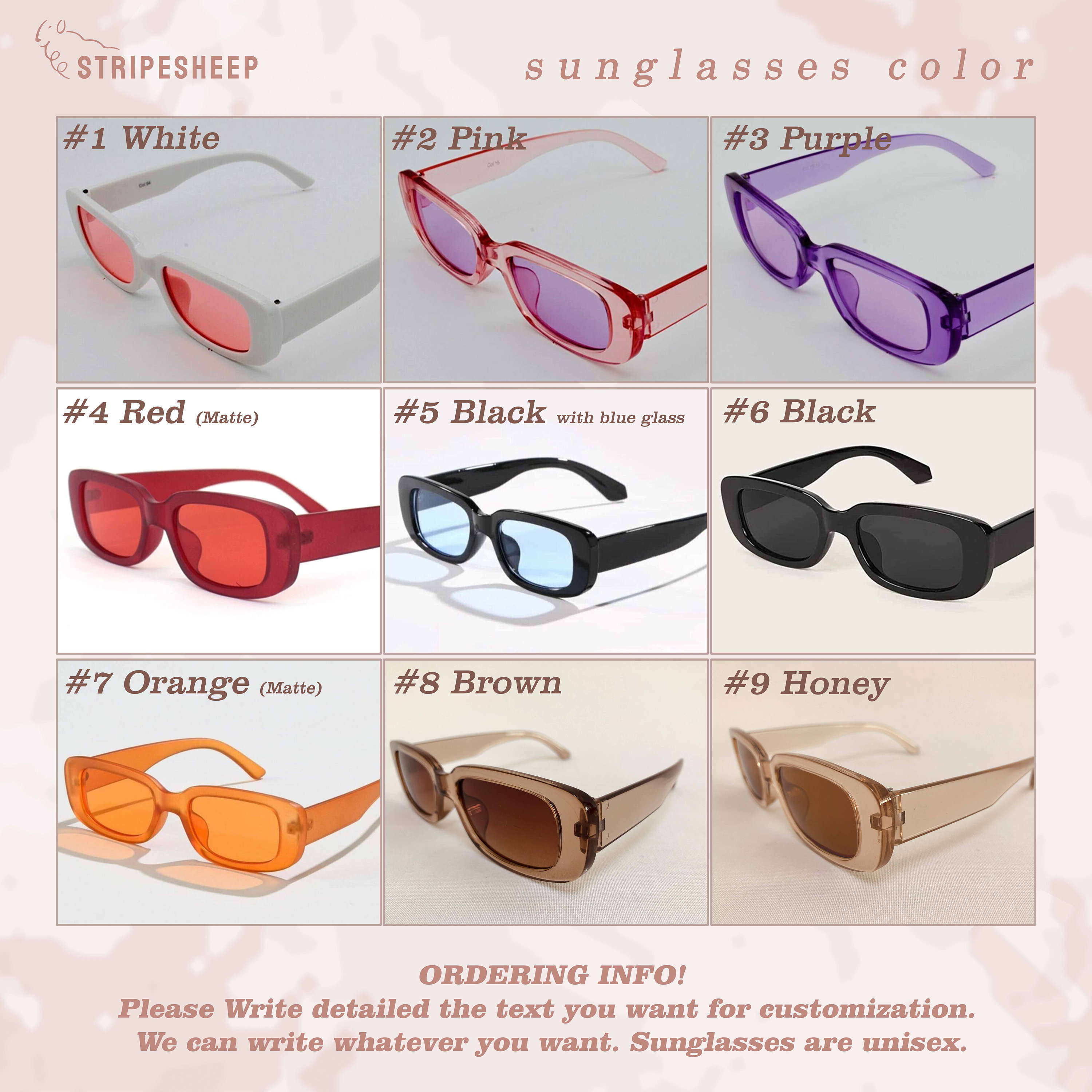 Our Sunglasses are customizable with your own text. You can also add a logo if you would like to.