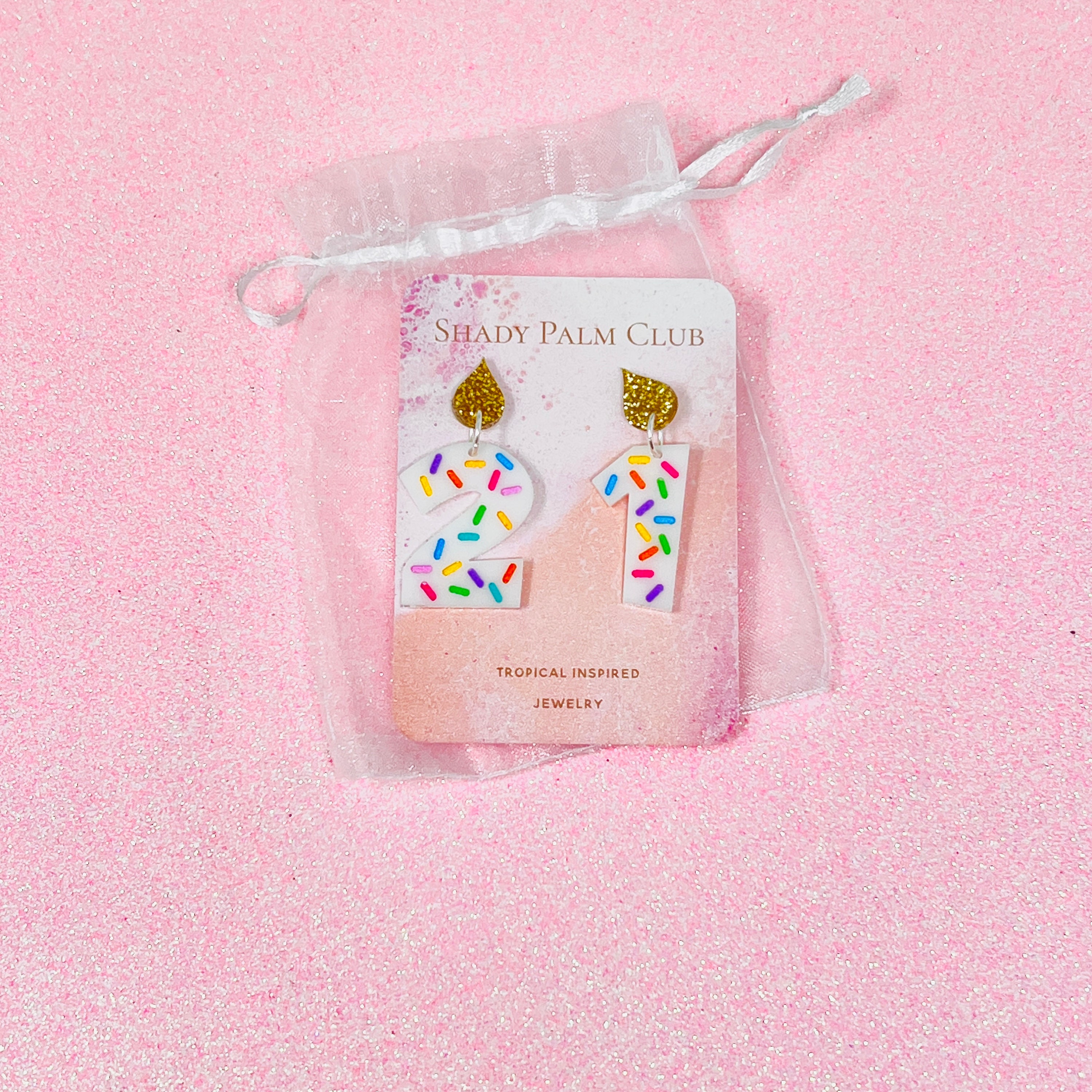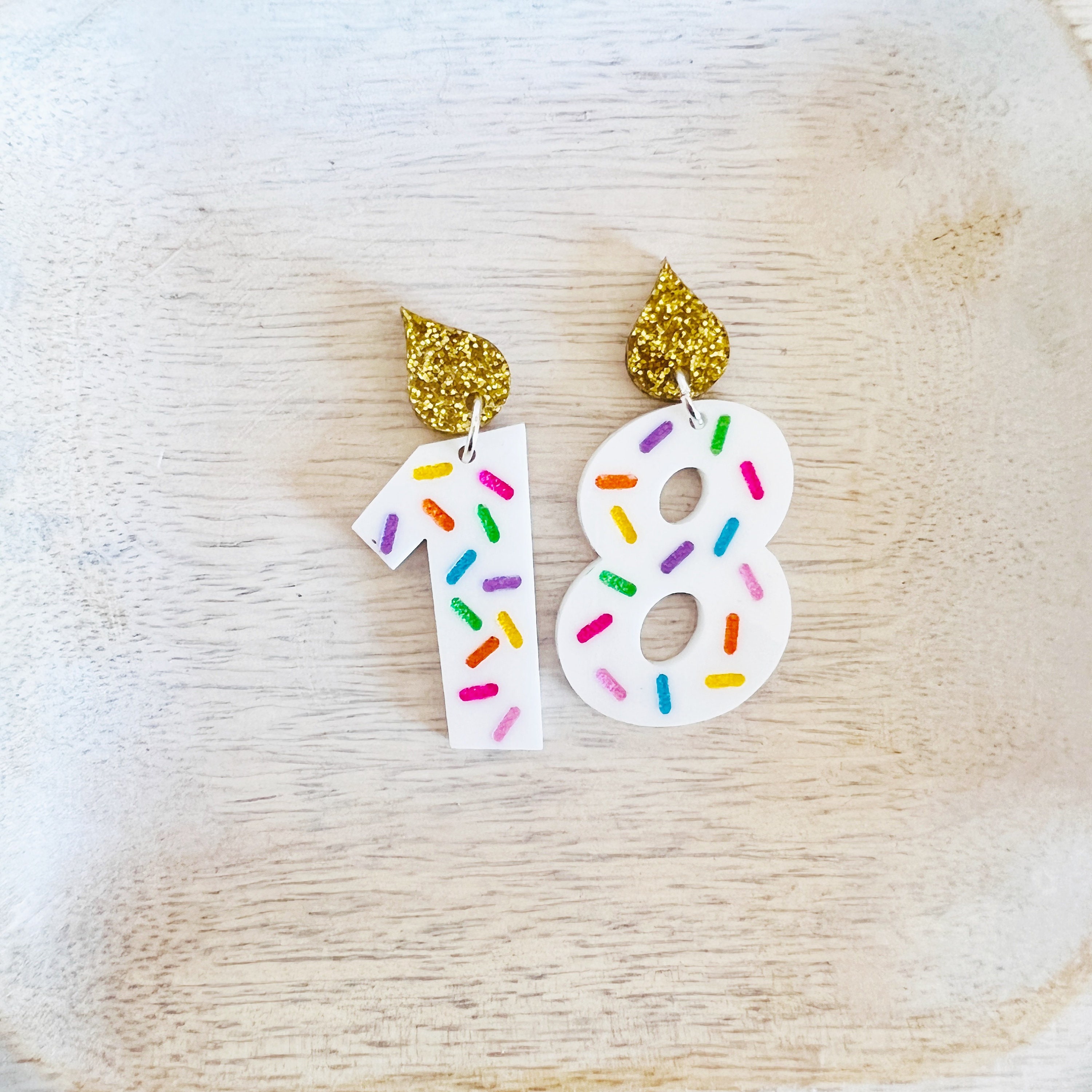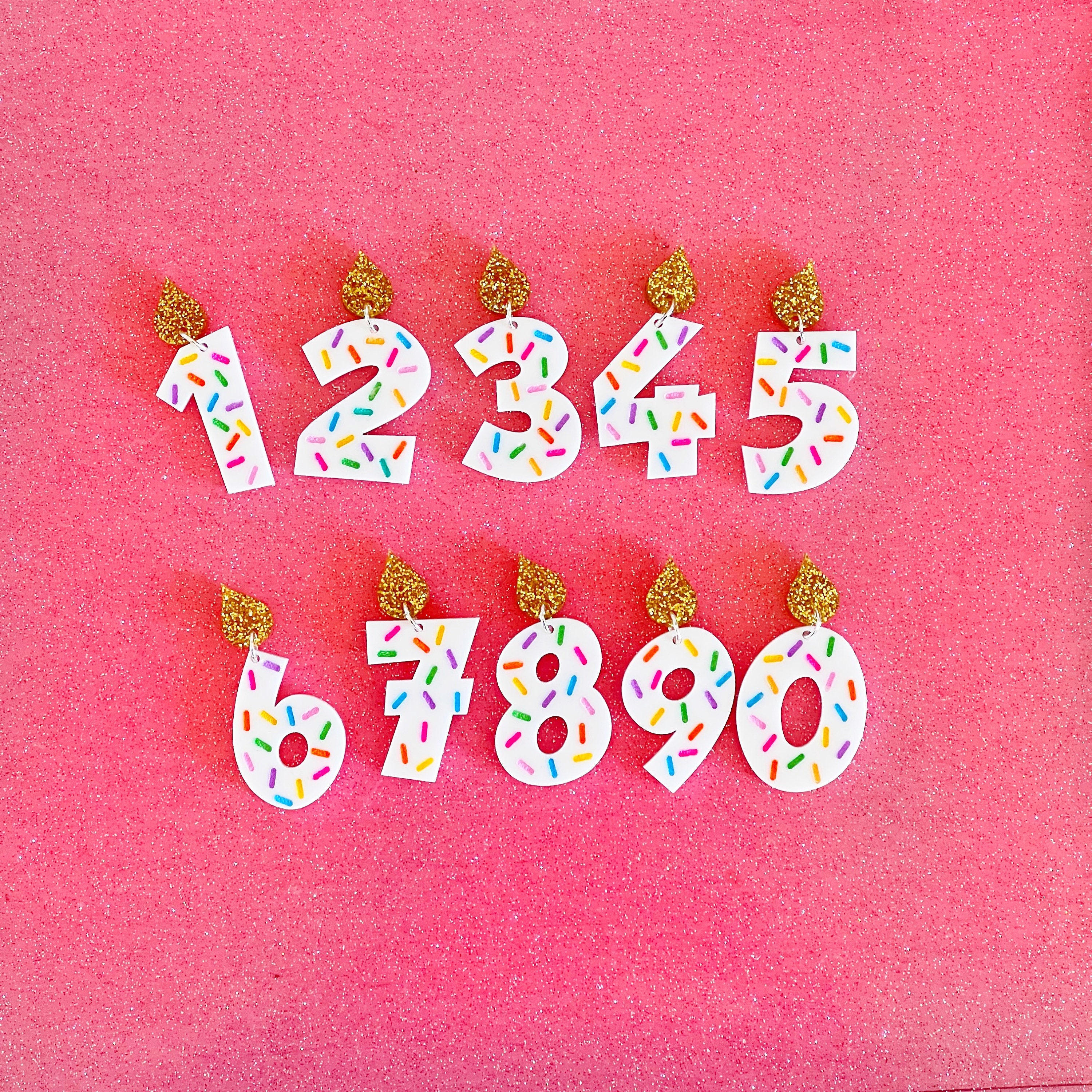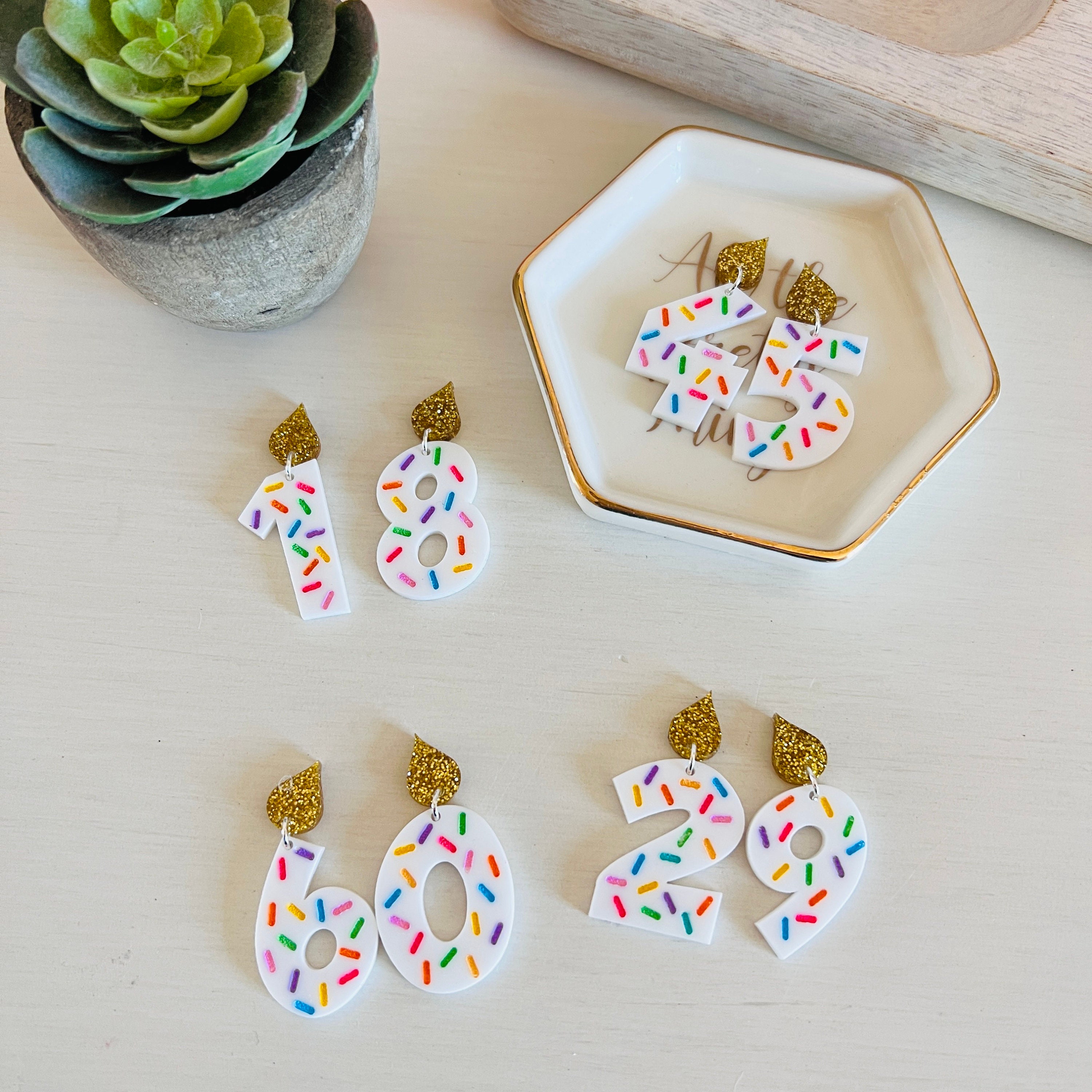 The birthday candle earring sets are such a fun way to celebrate! The earrings are made to order with white acrylic and then the sprinkles are hand painted. They are dangle style and feature a post earring that looks like a flame in a candle. Choose your personalized milestone number, and wear or give as a birthday or anniversary gift!