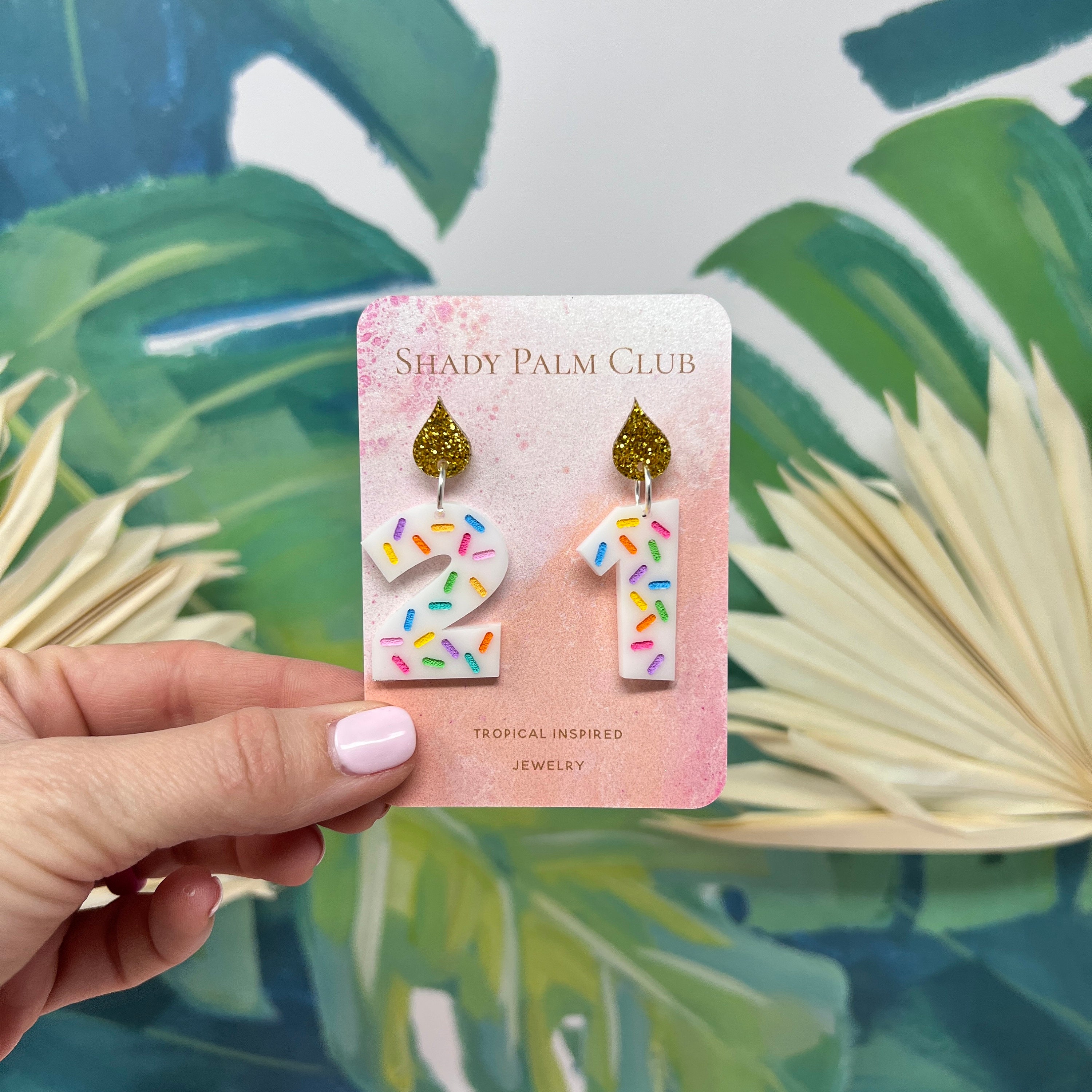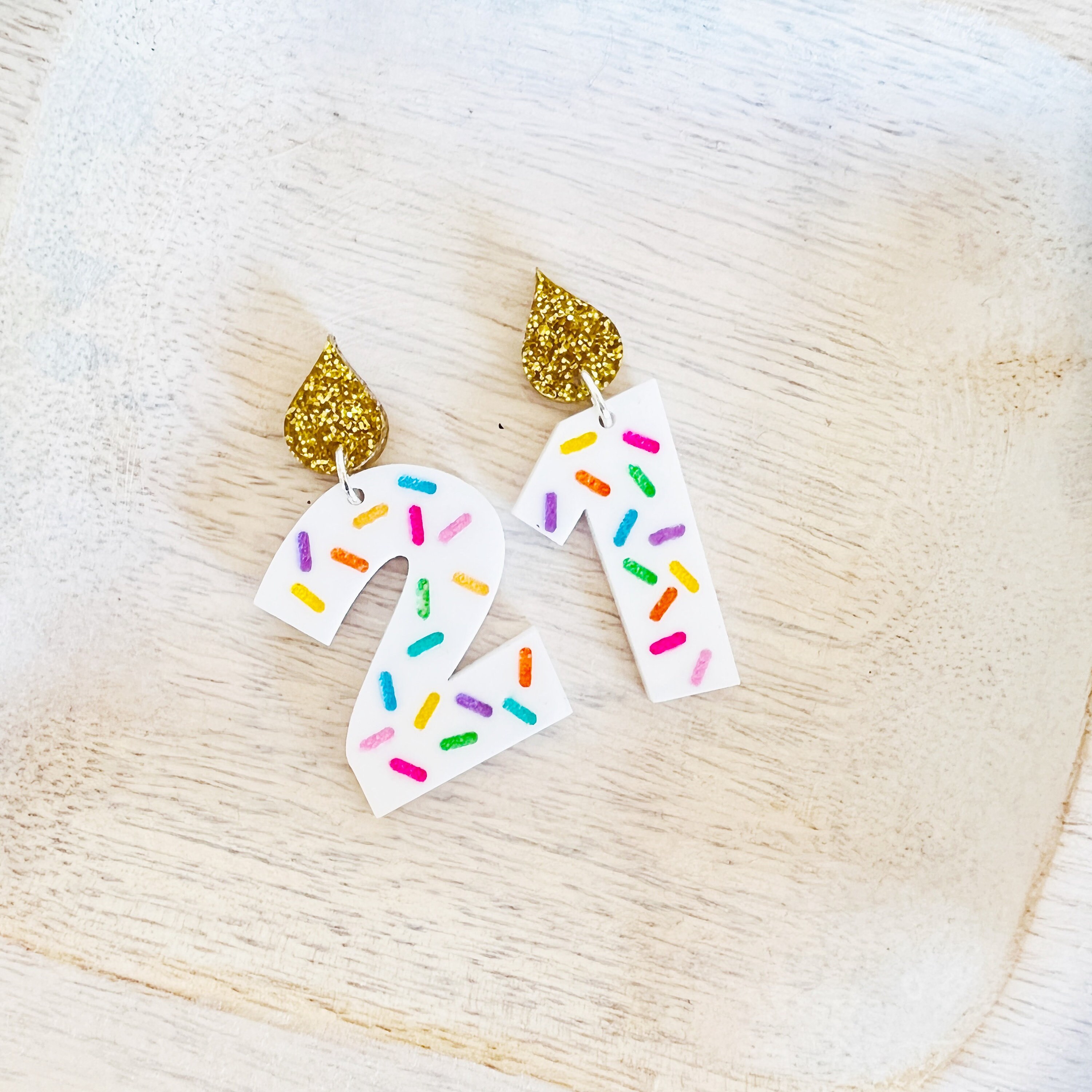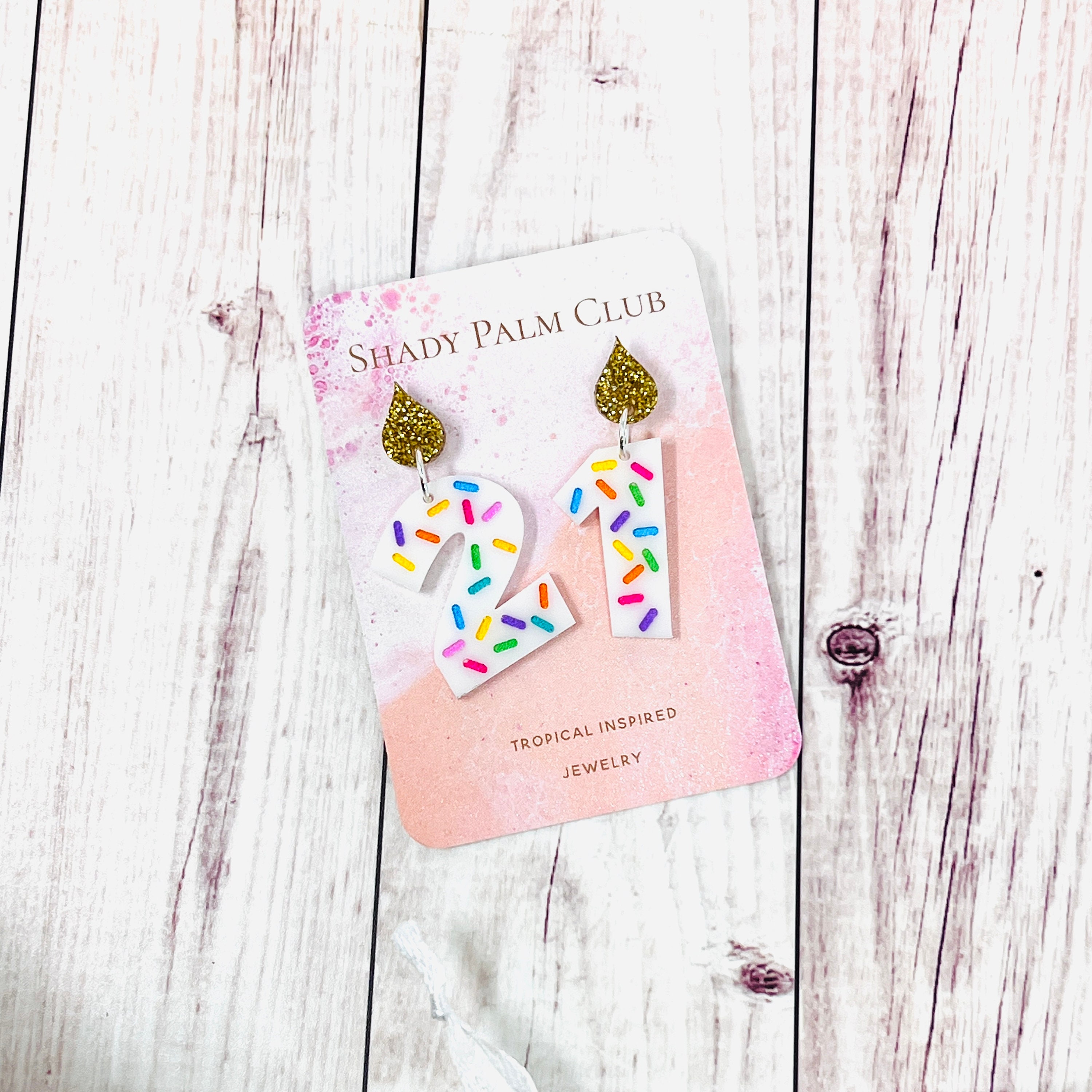 The birthday candle earring sets are such a fun way to celebrate! The earrings are made to order with white acrylic and then the sprinkles are hand painted. They are dangle style and feature a post earring that looks like a flame in a candle. Choose your personalized milestone number, and wear or give as a birthday or anniversary gift!