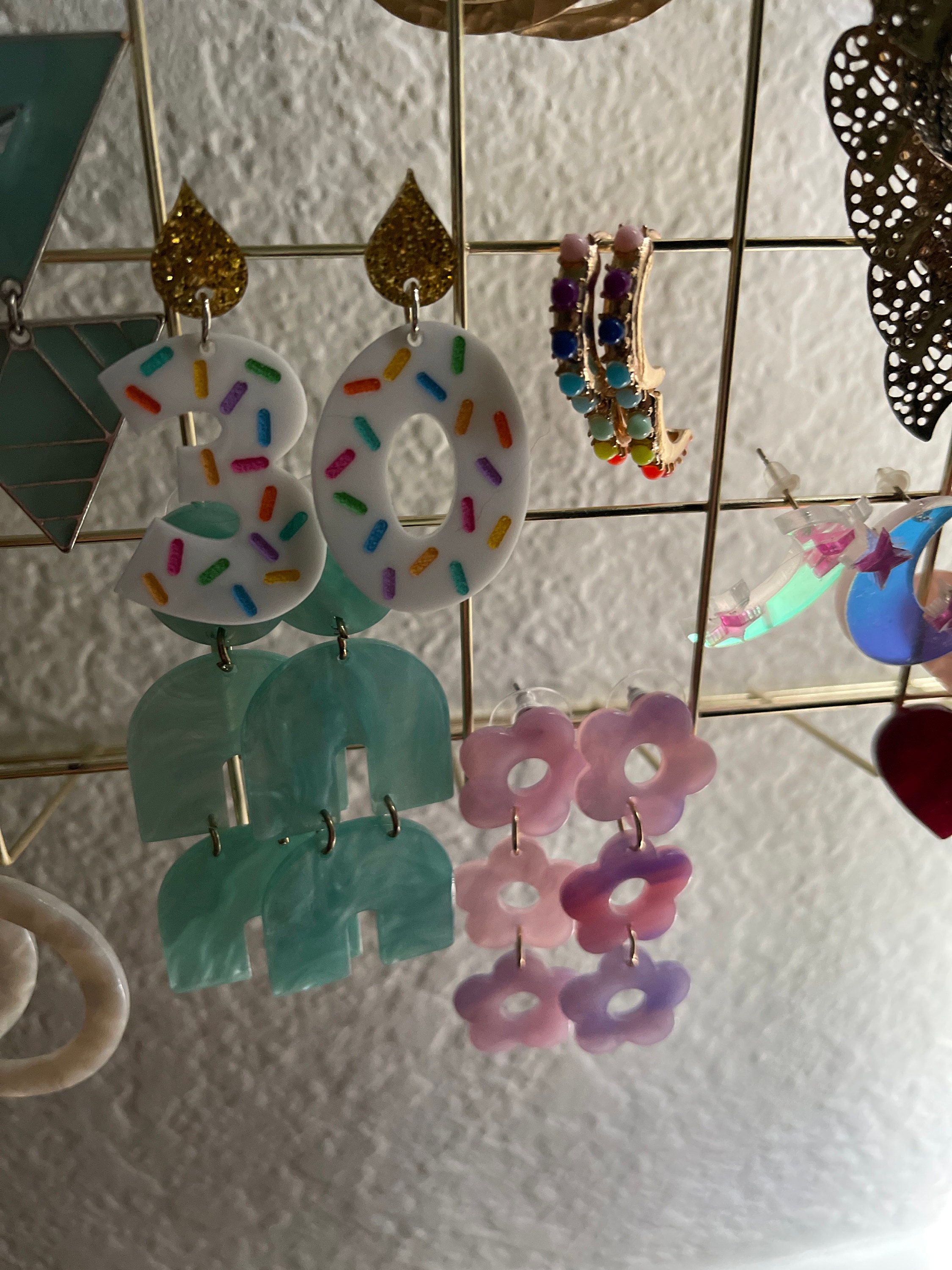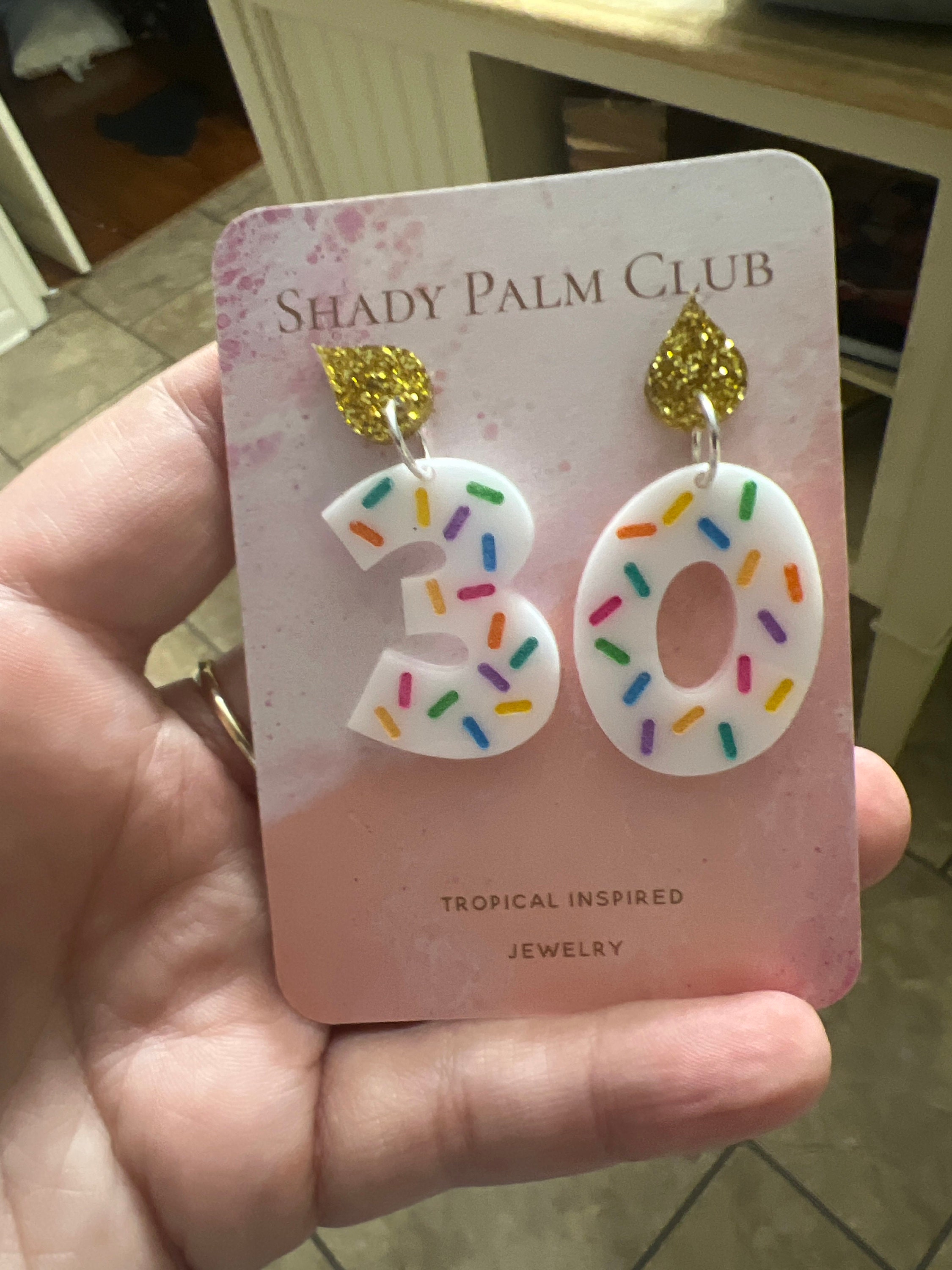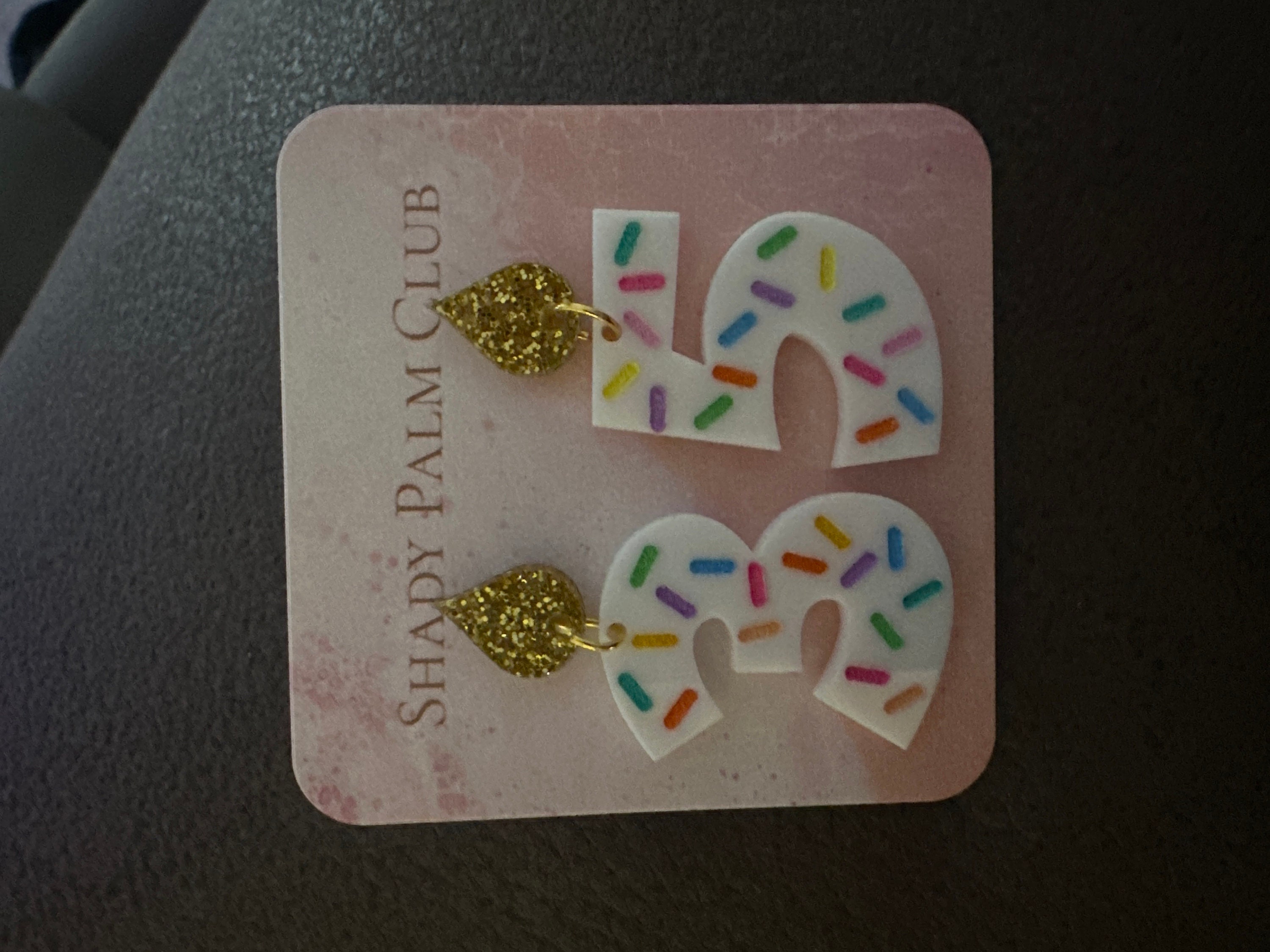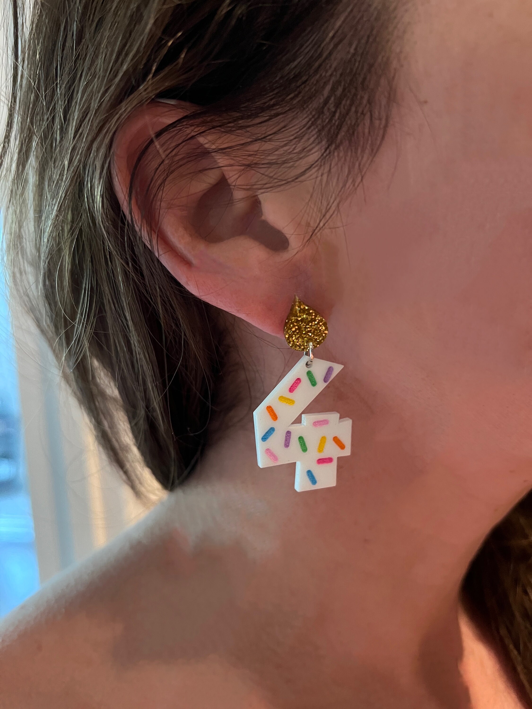 The birthday candle earring sets are such a fun way to celebrate! The earrings are made to order with white acrylic and then the sprinkles are hand painted. They are dangle style and feature a post earring that looks like a flame in a candle. Choose your personalized milestone number, and wear or give as a birthday or anniversary gift!