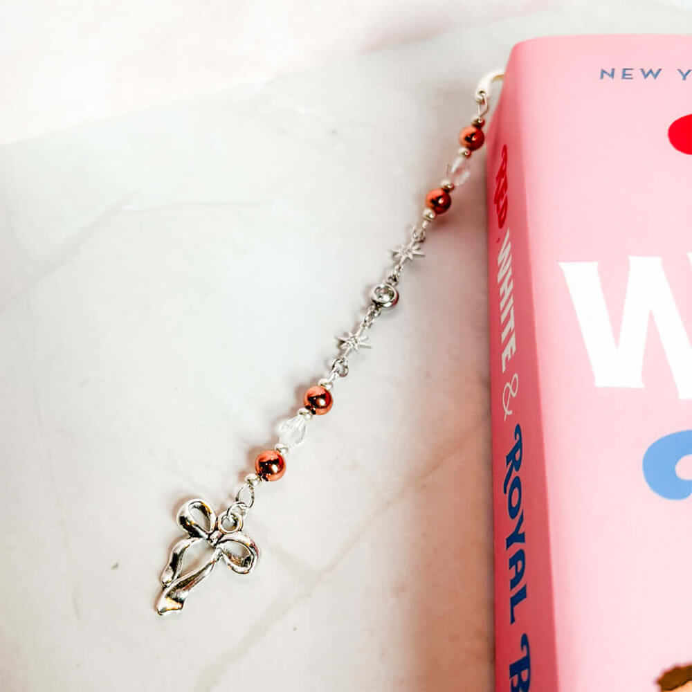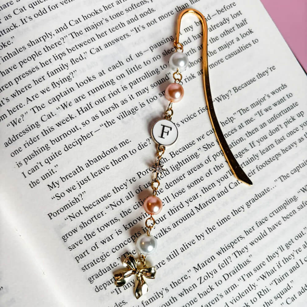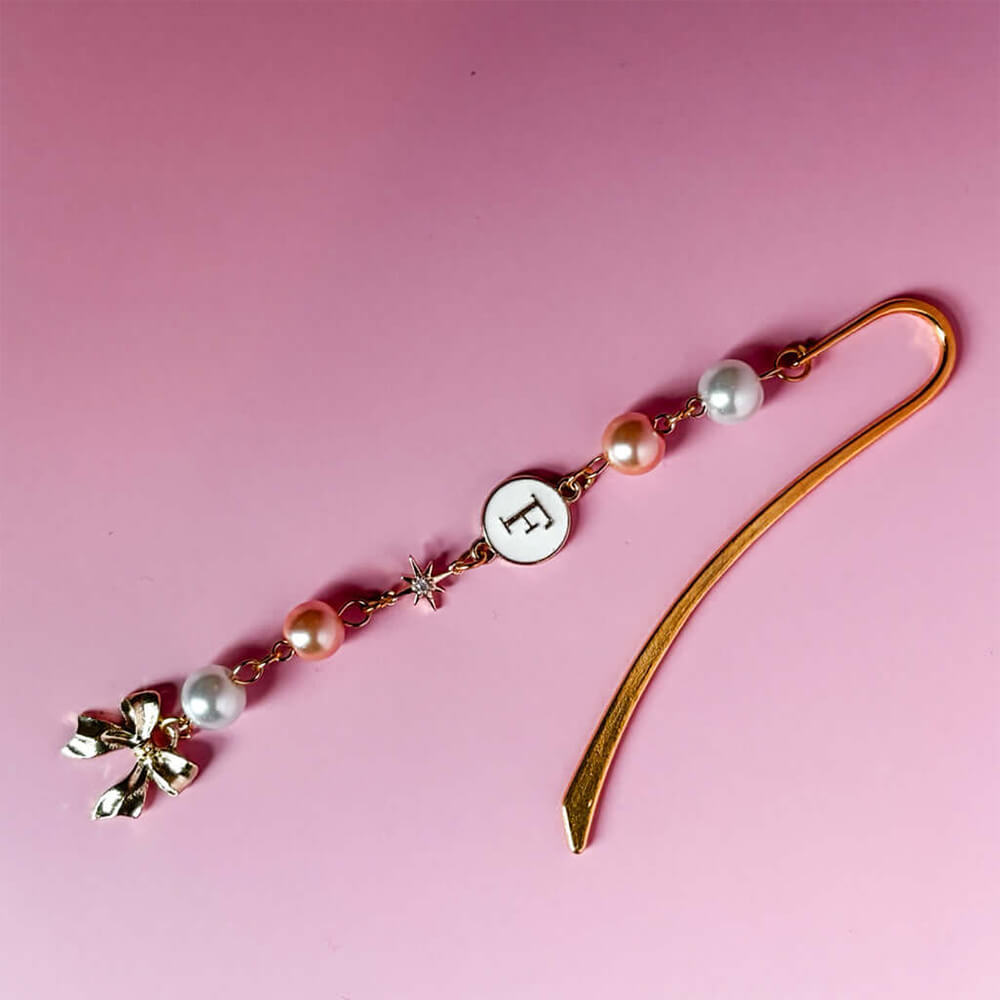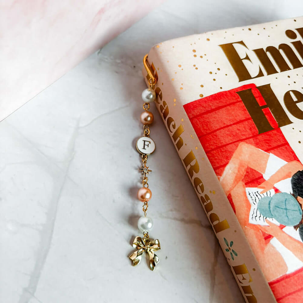 Mark your pages in style or decorate your book shelf with this adorable Bow Bookmark Charm, a personalized beaded pearl bookmark perfect for all book lovers. This is a handmade custom bookmark, a cute bookshelf décor accessory and a thoughtful gift with an initial charm.