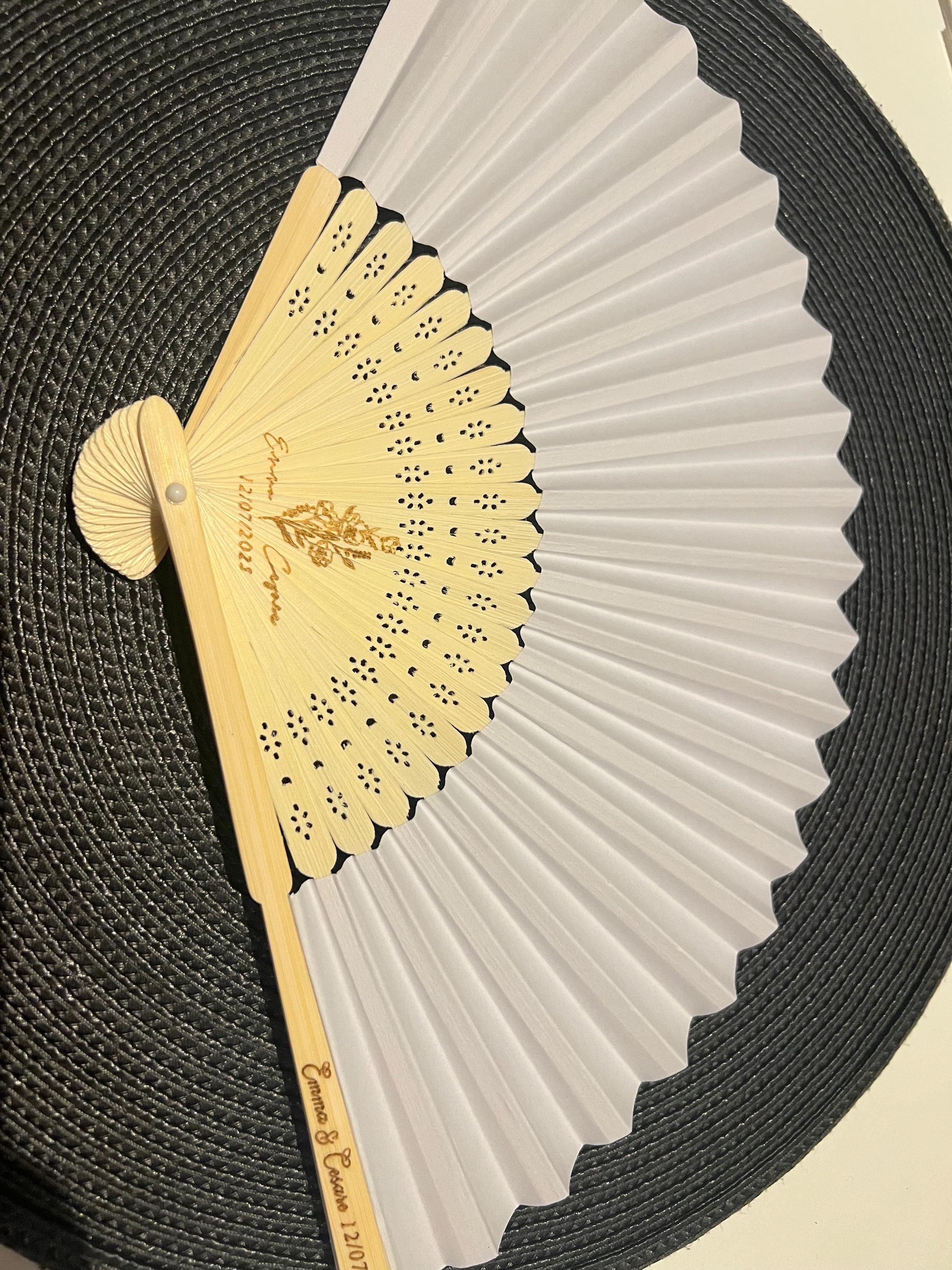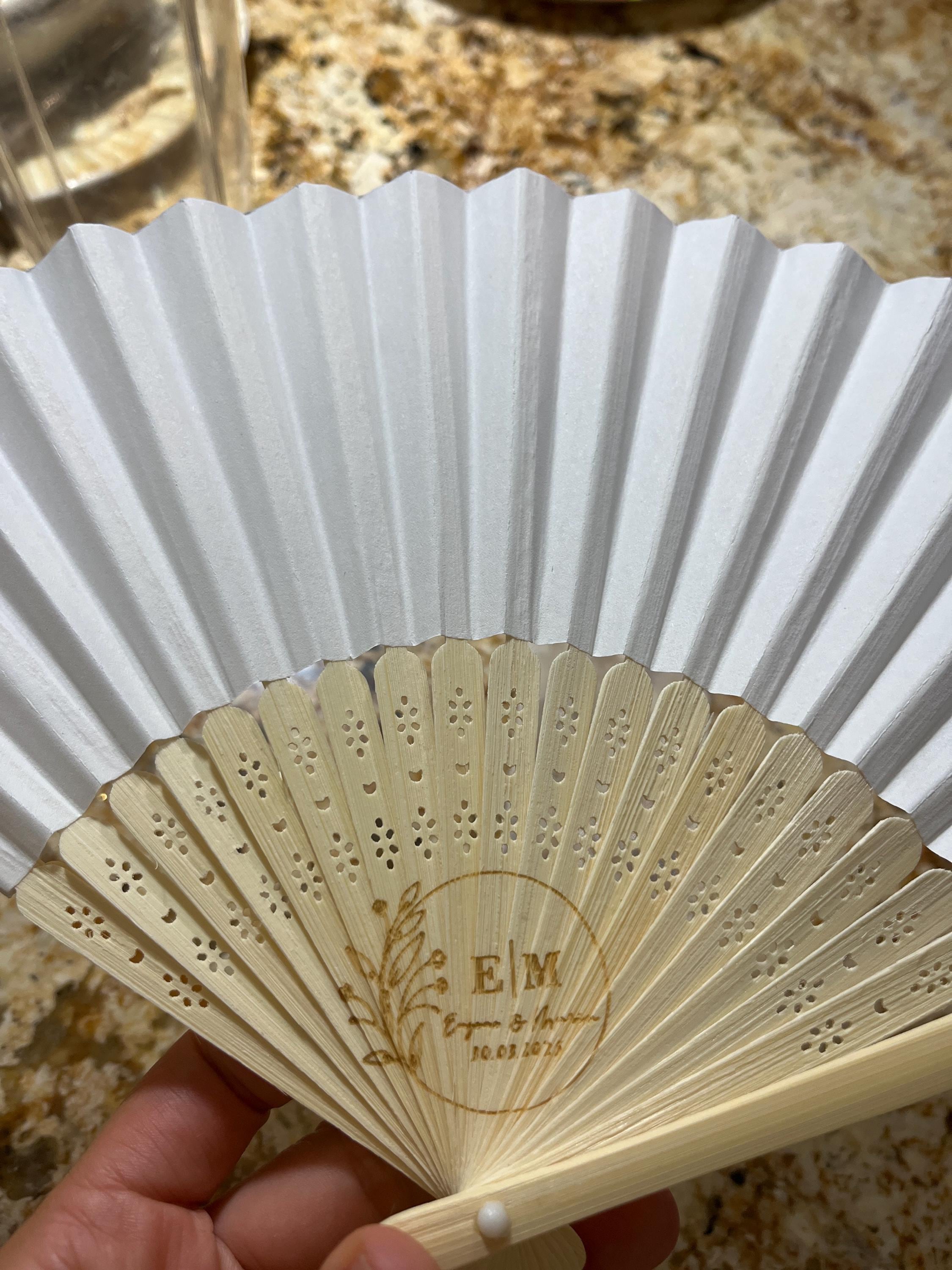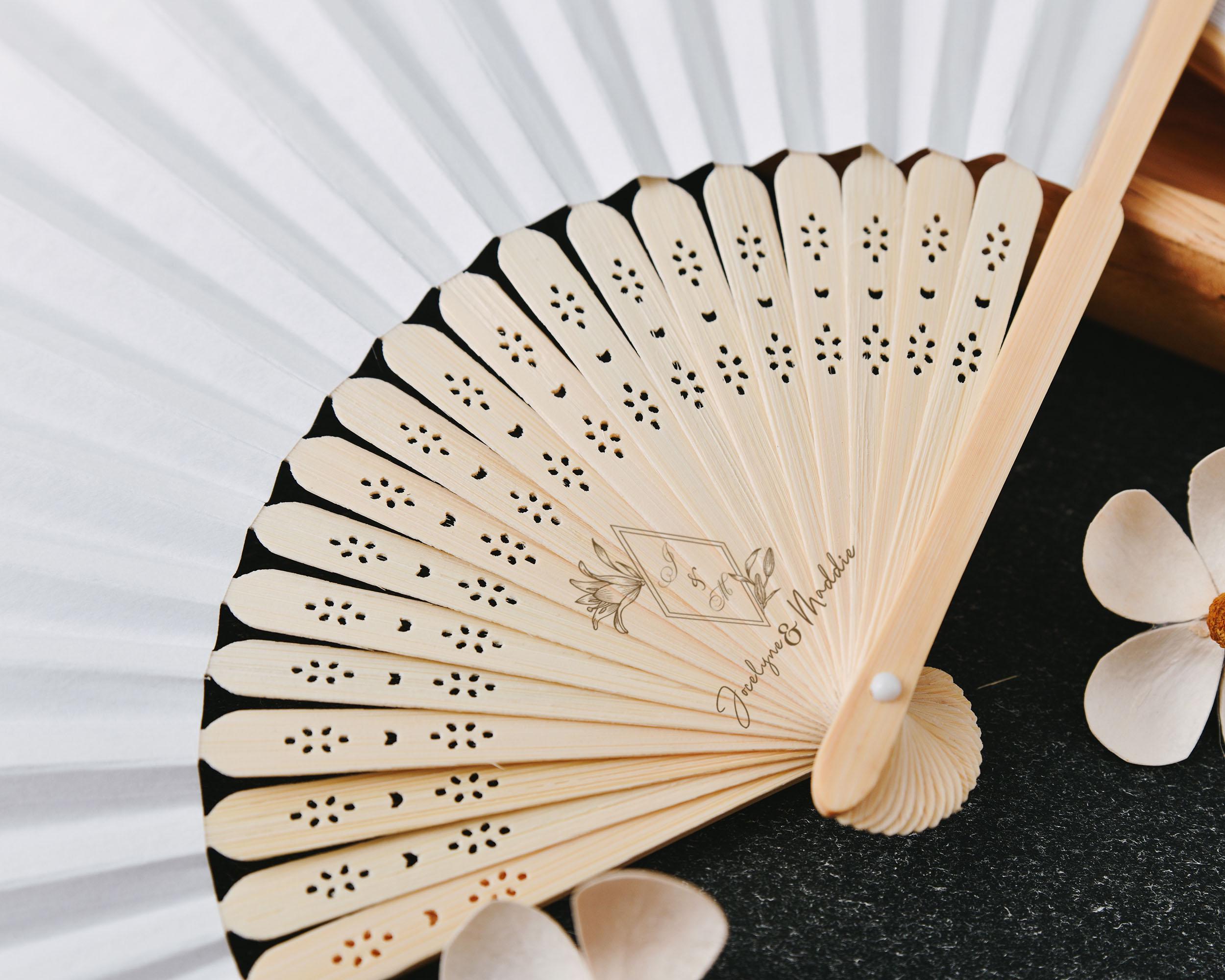 These Silk White Carved Personalized Wooden Wedding Paper Fans are the ultimate combination of elegance and personalization for your special day. Made from premium wood with intricate cutout designs, these hand fans are the perfect accessory for your wedding, bridal shower, or any other event.