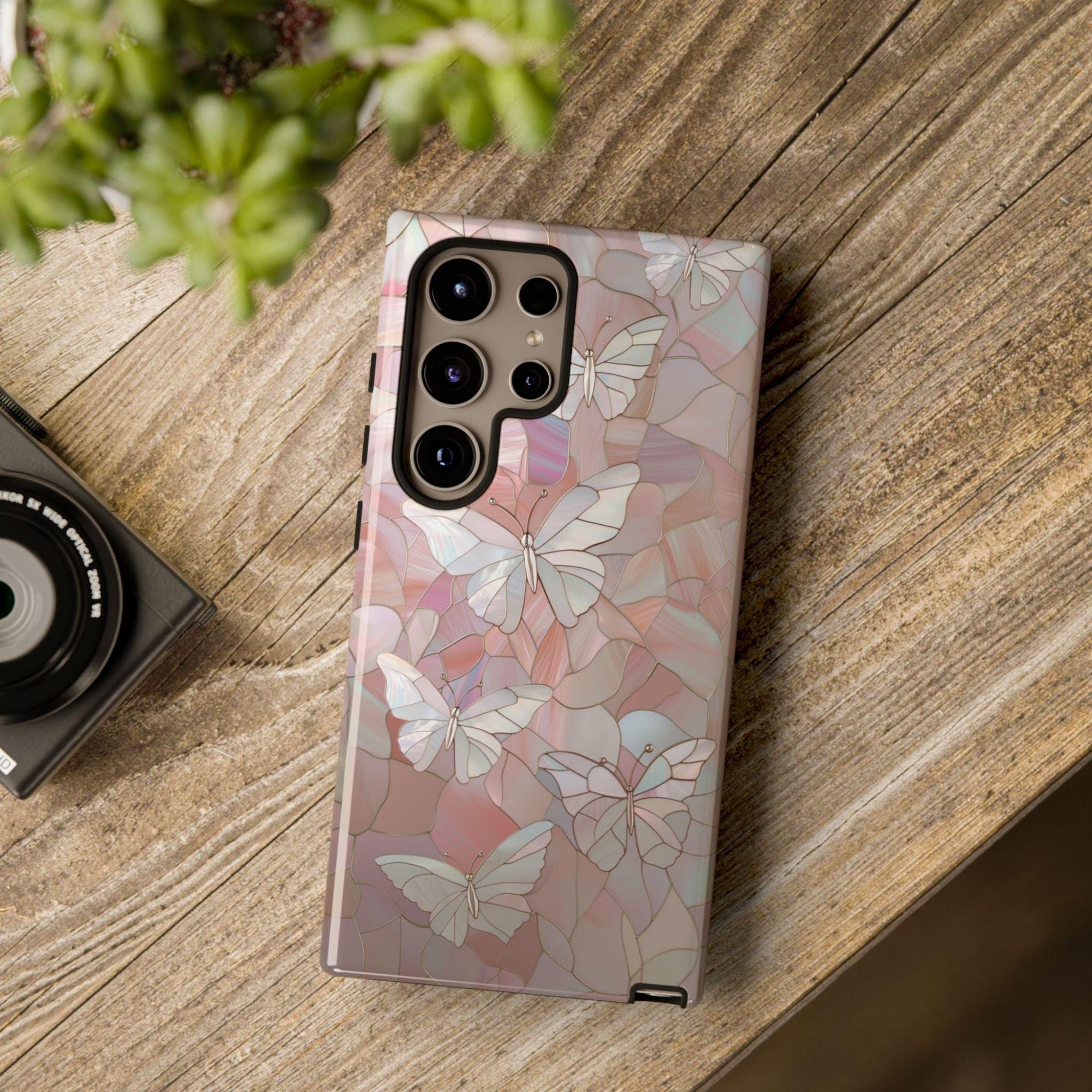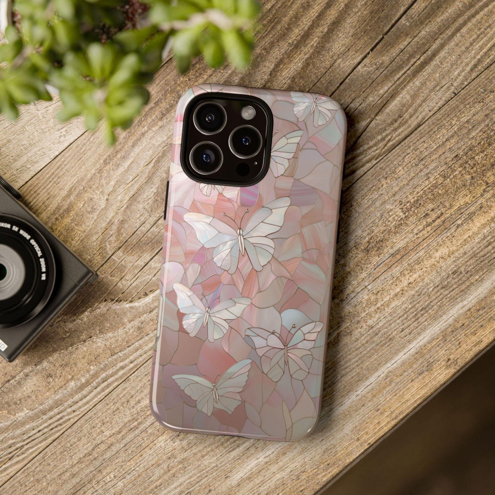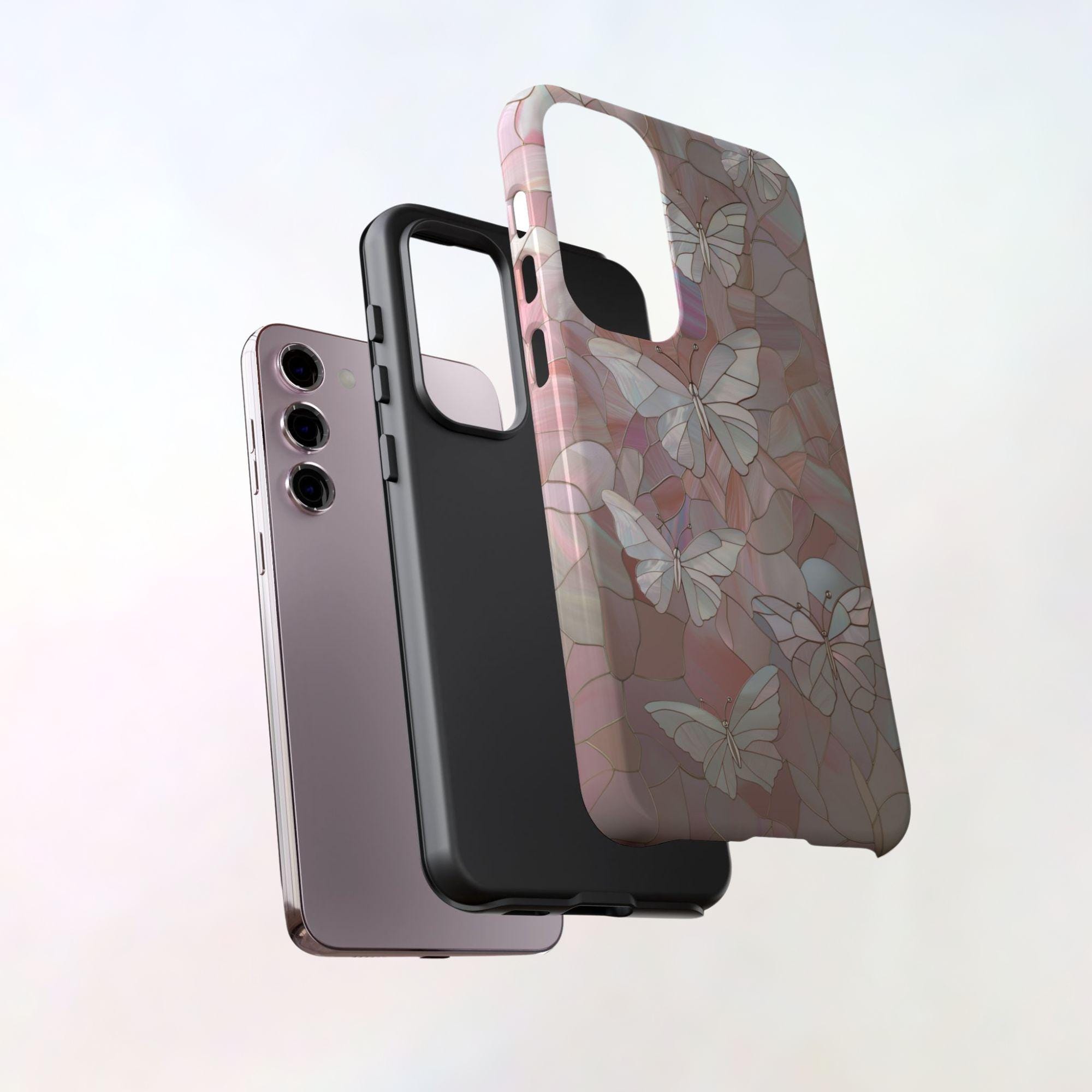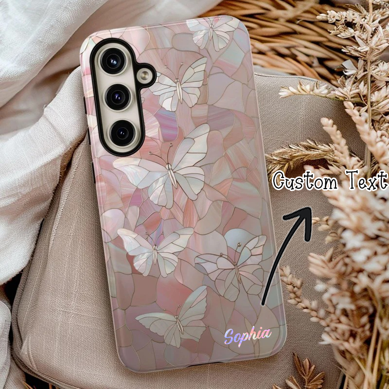 Add a touch of elegance to your phone with this stunning butterfly-themed case, featuring a beautiful faux stained glass design. The intricate pattern of butterflies against a shimmering background gives it a unique, ethereal look that will surely catch attention.