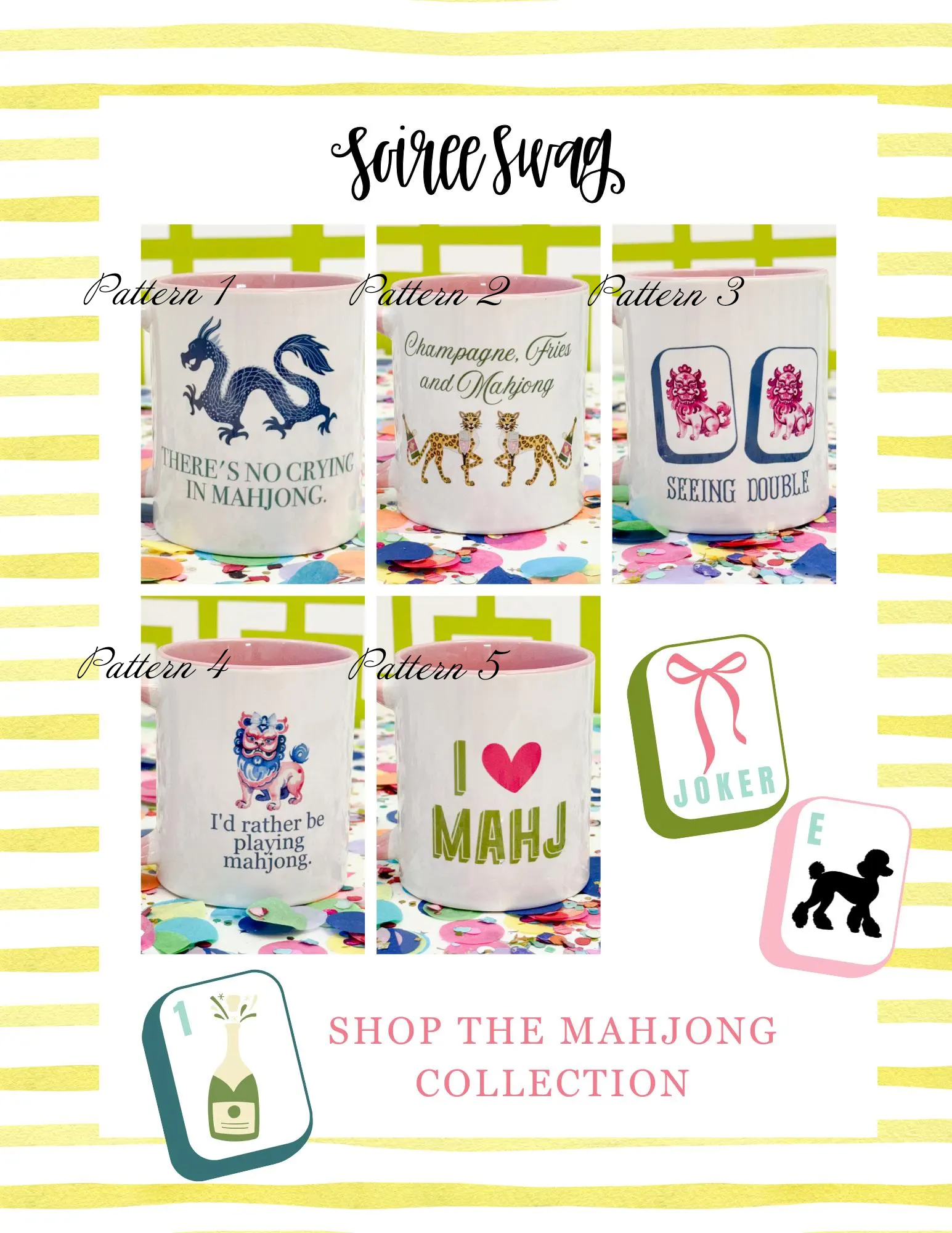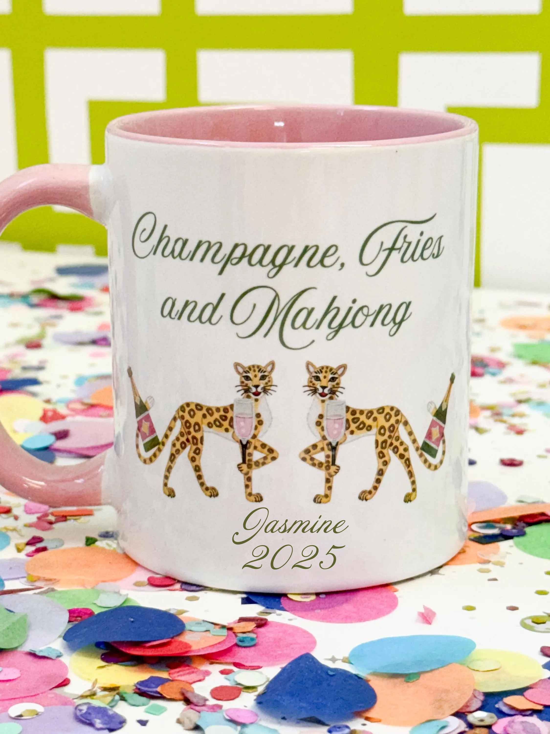 Start your day the Mahjong way! Sip in style with this playful Champagne, Fries, and Mahjong mug – the perfect gift for any mahjong lover (yourself included)! Featuring chic cheetahs holding champagne flutes and bubbly bottles, this fun coffee cup makes a fabulous addition to game nights, brunches, or your morning routine.