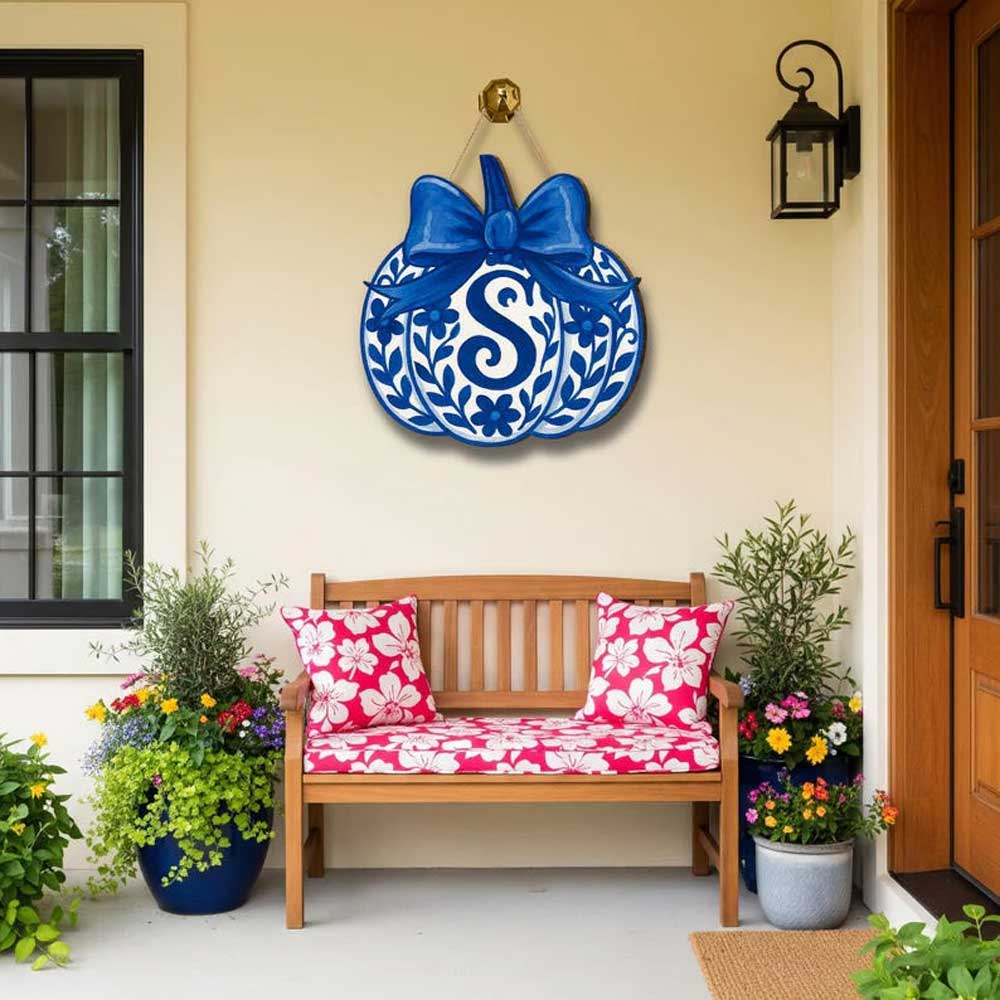 Elevate your autumn decor with this elegant Chinoologeried pumpkin door hanger. Its beautiful blue hue and intricate floral patterns bring a touch of sophisticated, timeless charm to your entryway.