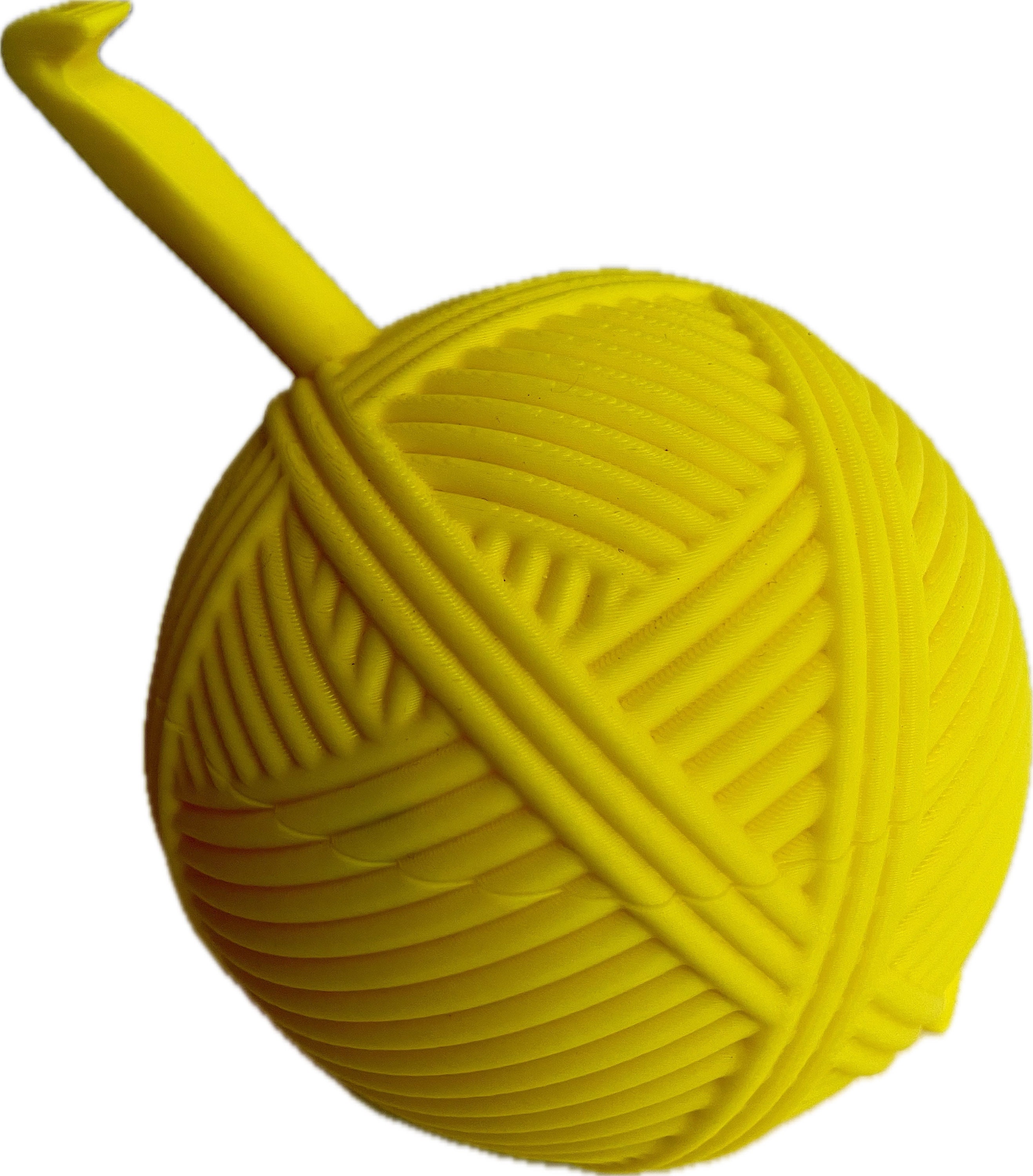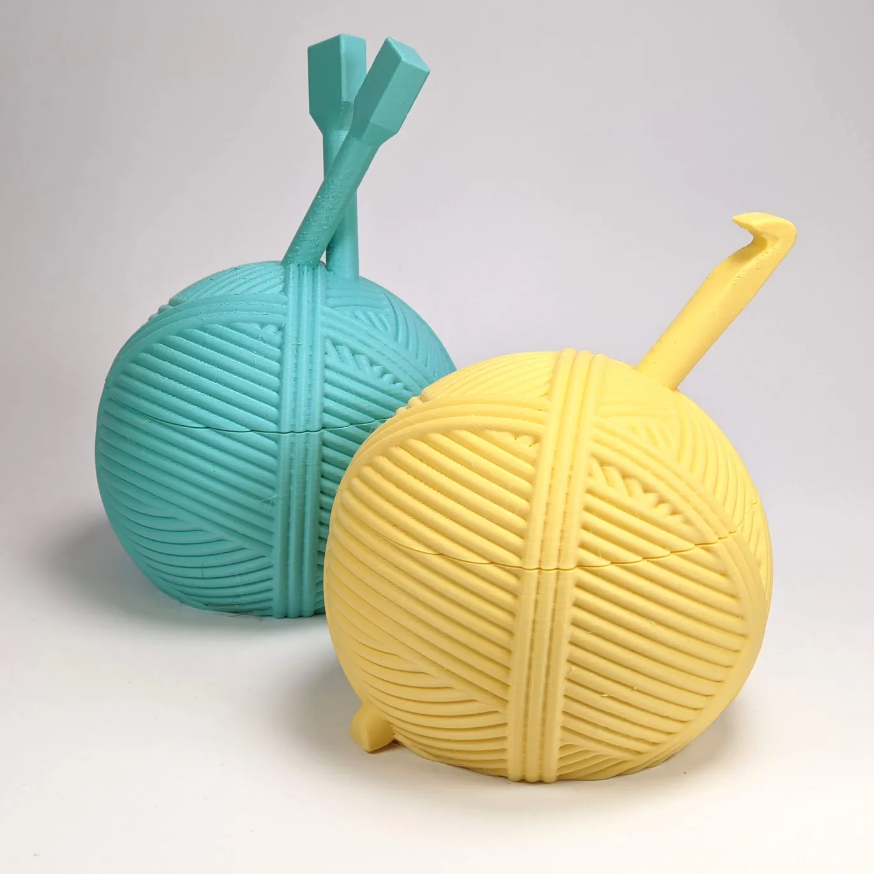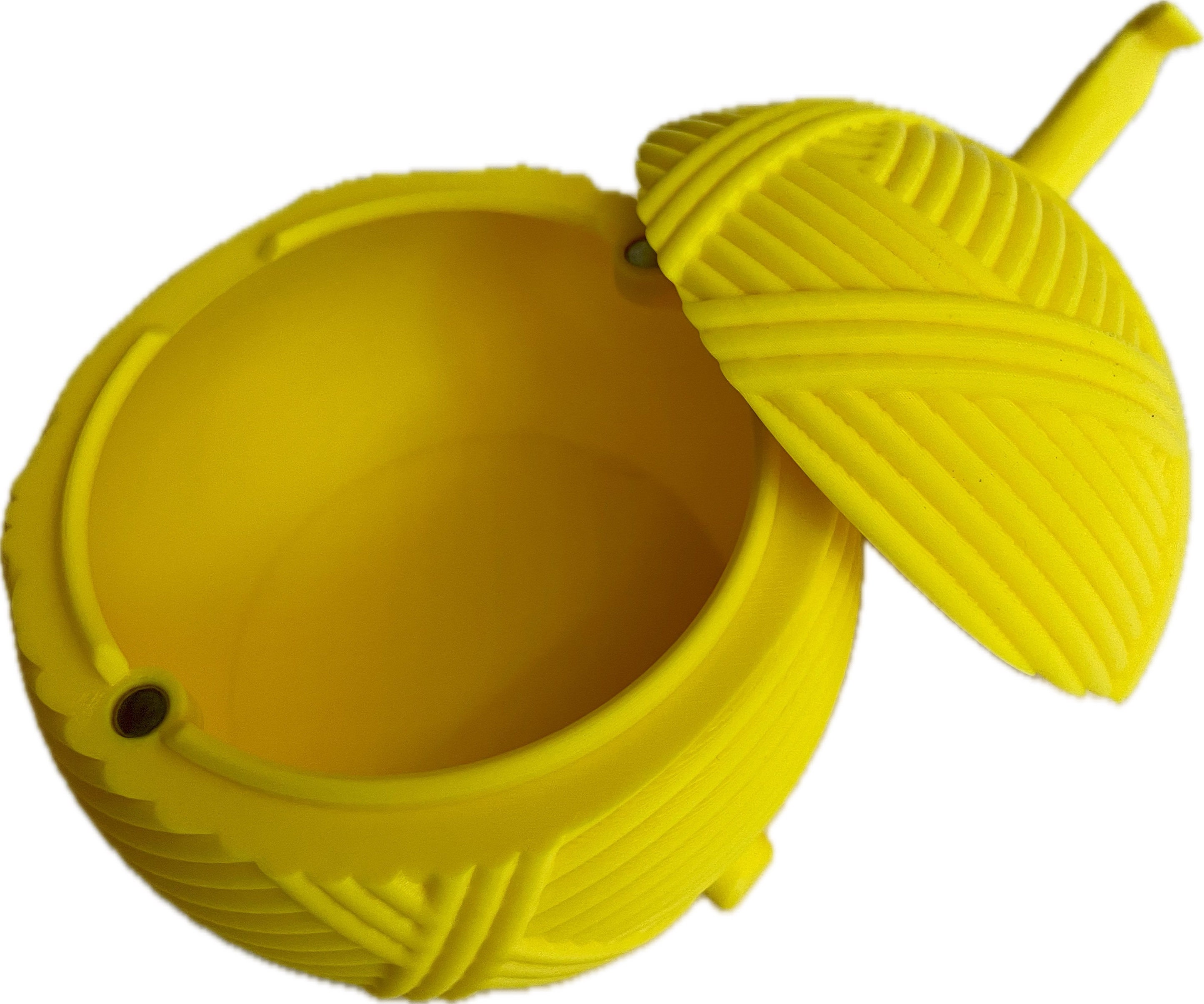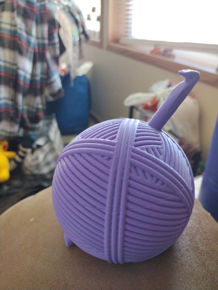 Whether you crochet or are just a yarn enthusiast, this unique yarn bowl is great way to hold your supplies (or candy!). The lid is held by magnets, and there is a groove to help it line up. The exterior dimensions are 4 inches wide, 6 inches tall including the hook.