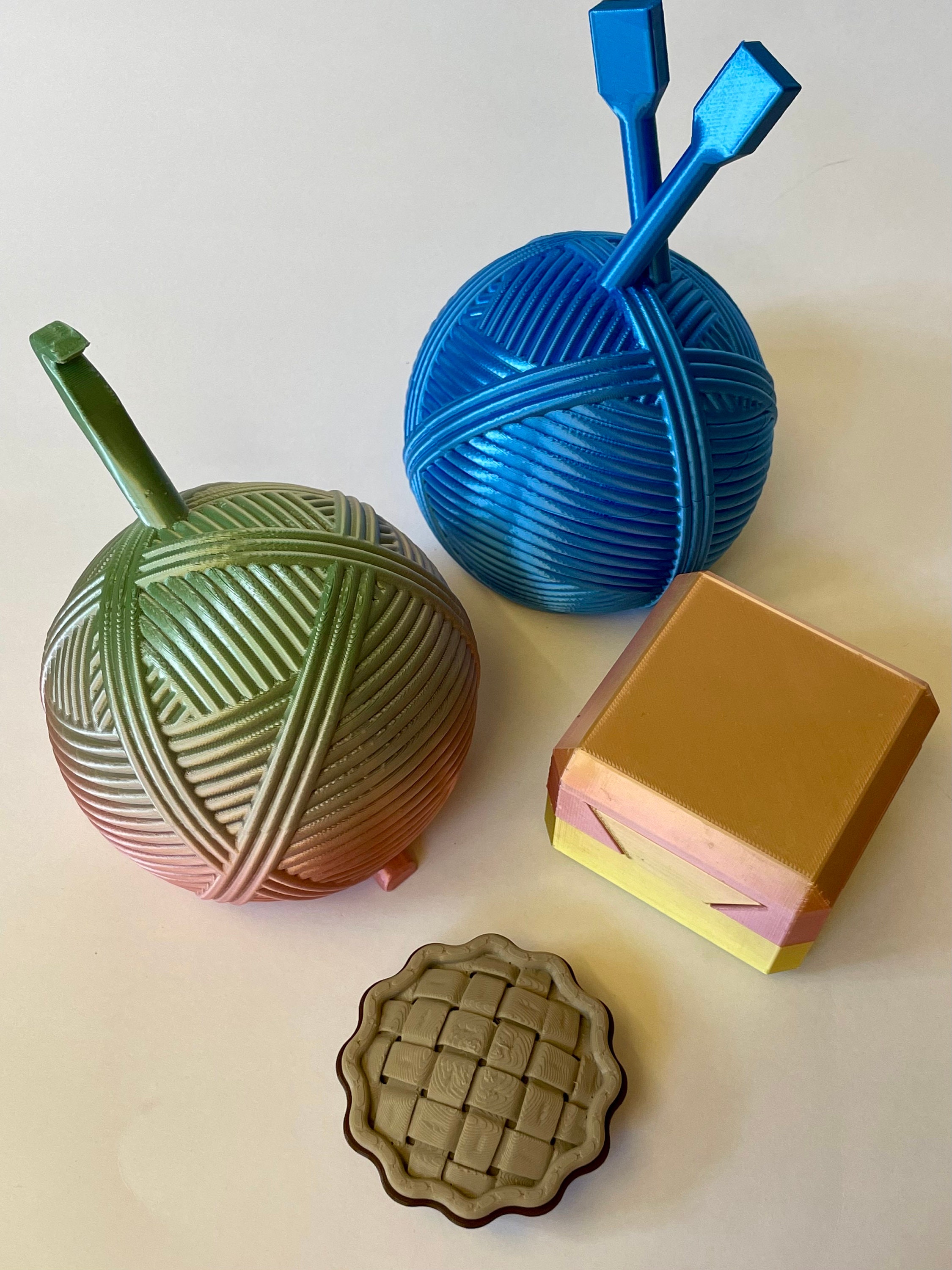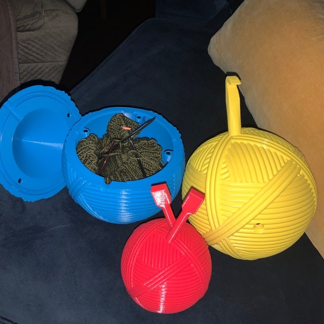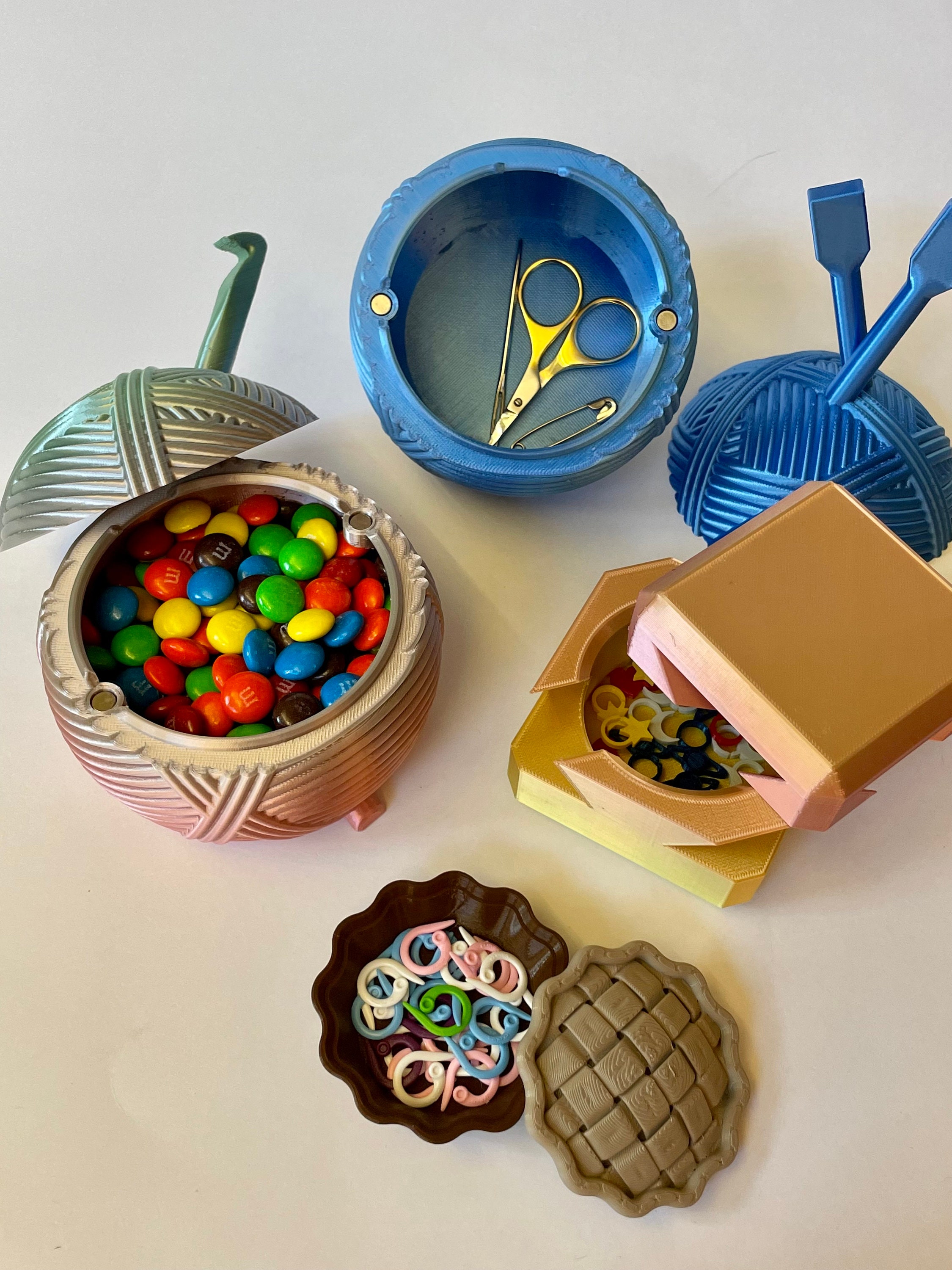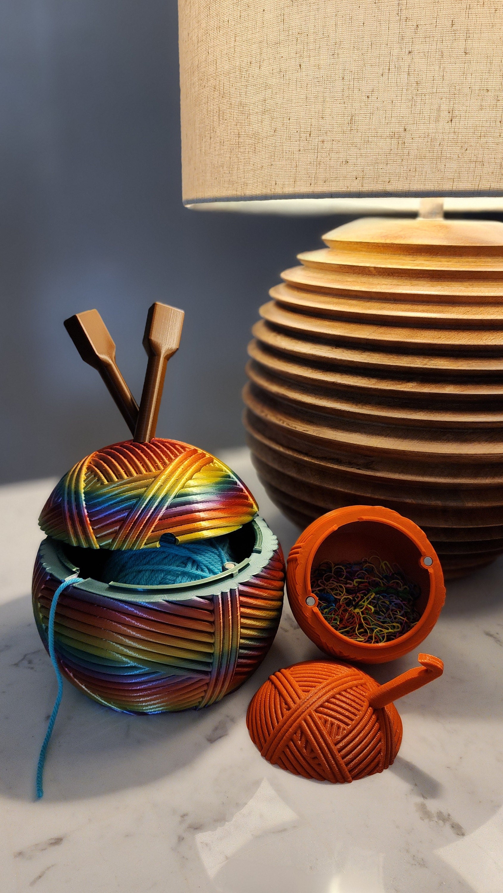 Whether you crochet or are just a yarn enthusiast, this unique yarn bowl is great way to hold your supplies (or candy!). The lid is held by magnets, and there is a groove to help it line up. The exterior dimensions are 4 inches wide, 6 inches tall including the hook.