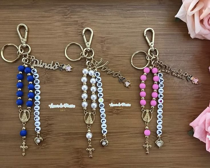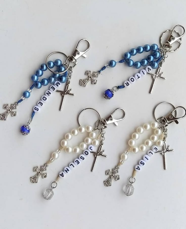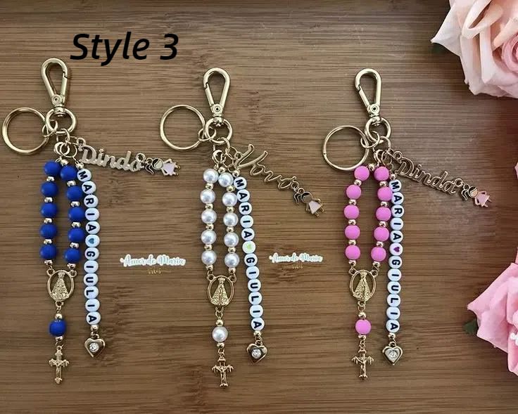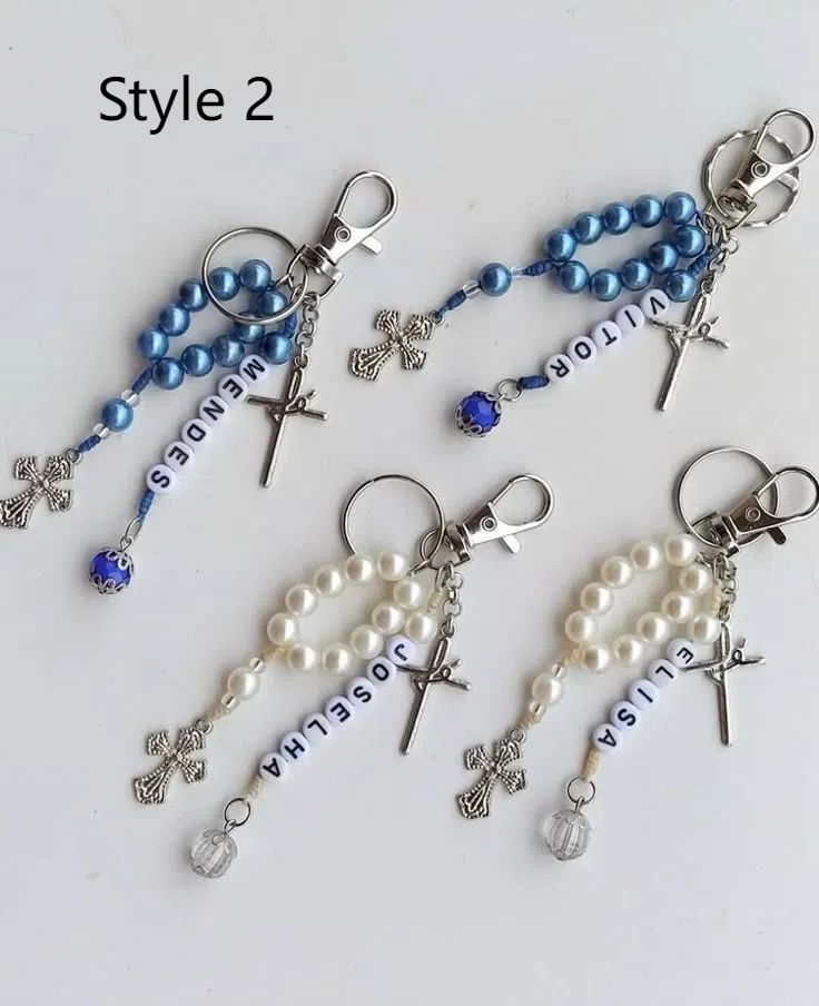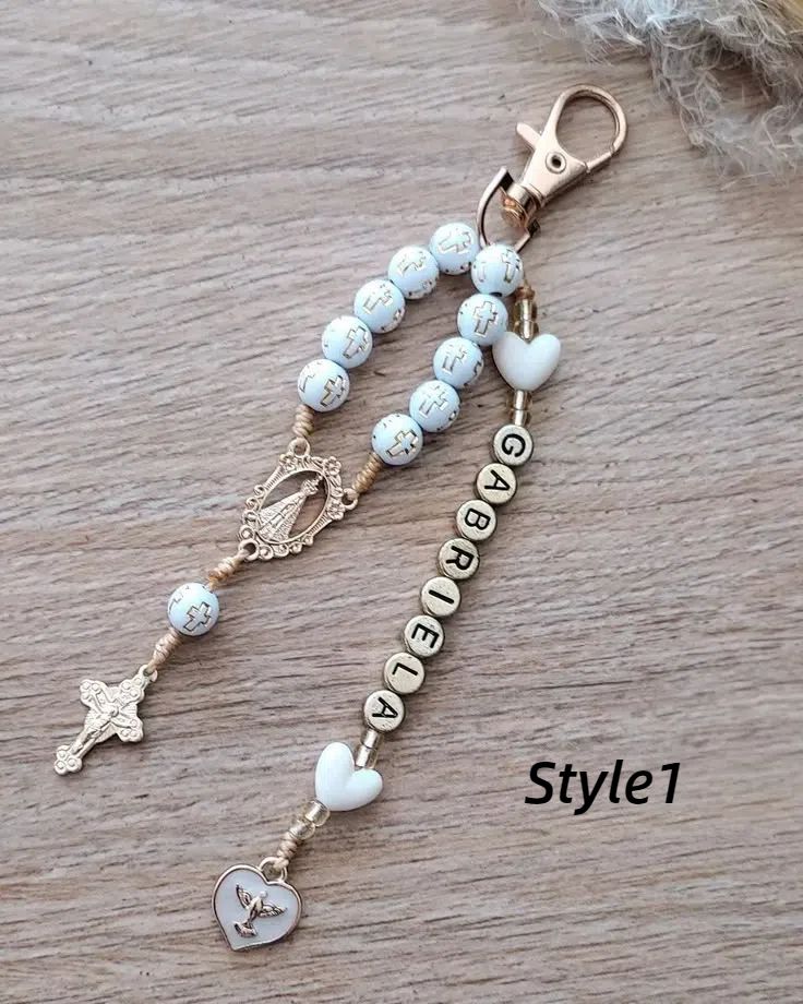 The design combines traditional Catholic prayer beads with personalization, creating a meaningful devotional accessory that could be used as a keychain, bag charm, or decorative item with religious significance.