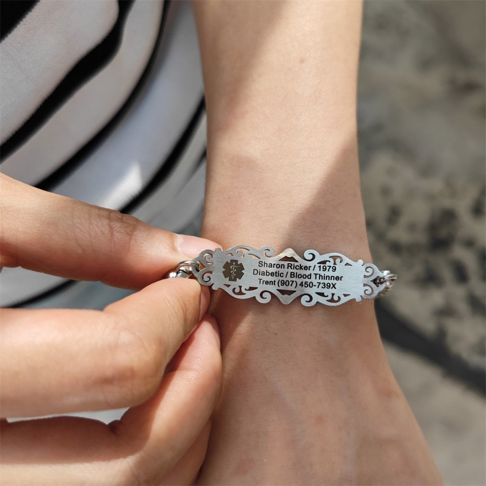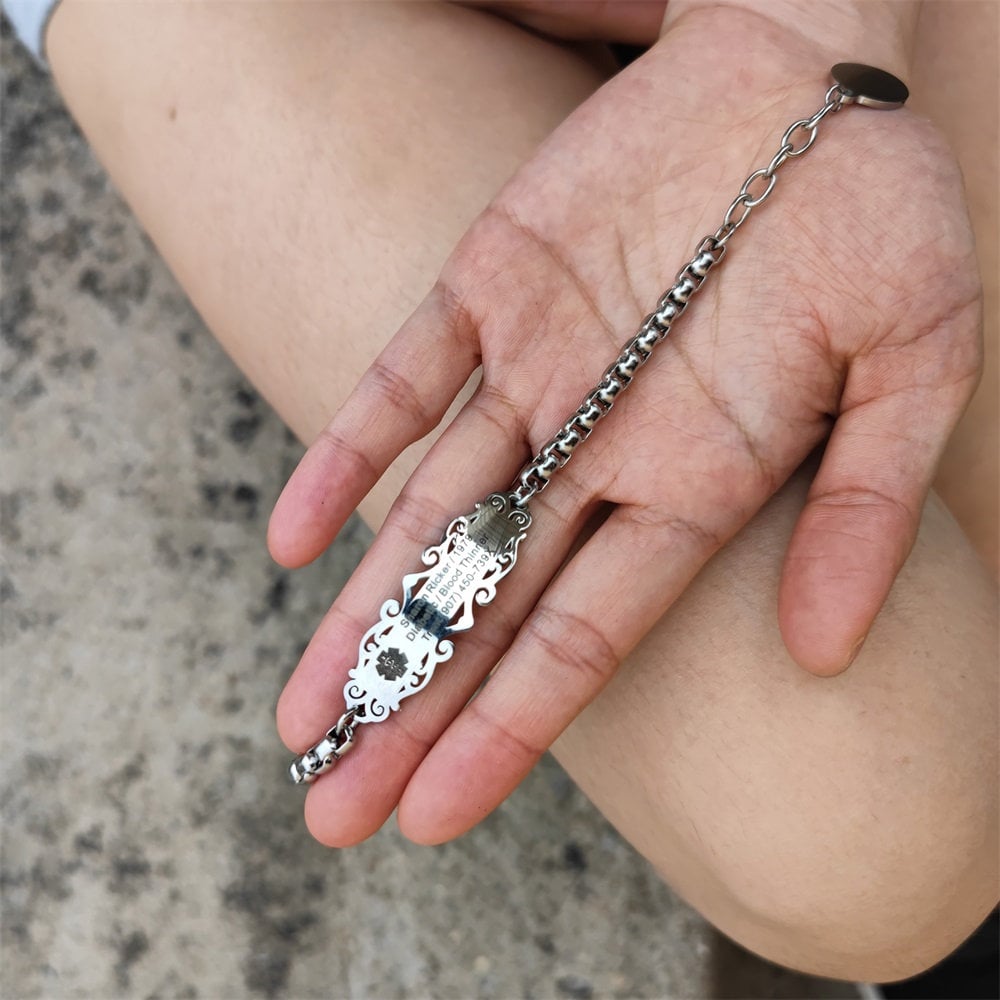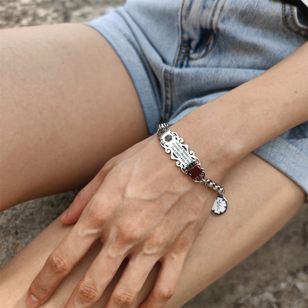 This is an elegant interchangeable medical alert id bracelet with free engraving for women which is handcrafted with 100% surgical grade 316L stainless steel(hypoallergenic and safe for allergic people),perfectly connected with elegant and unique metal link chains which designed to provide an on-trend look and highly visible to emergency responders, and also with elegance in mind. You could choose the emergency medical ID bracelet you prefer and remove the ID tag and affix it to any other interchangeable medical alert bracelet in our store to suit your mood or activity.