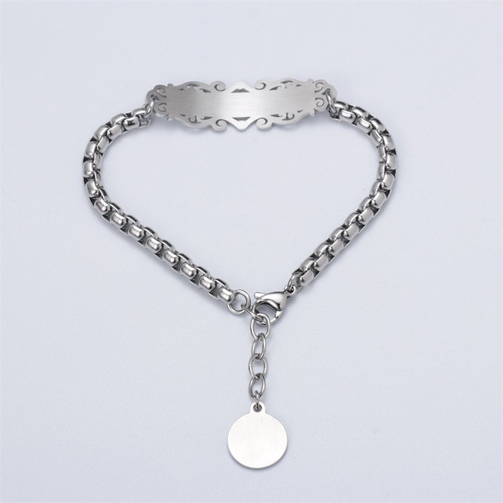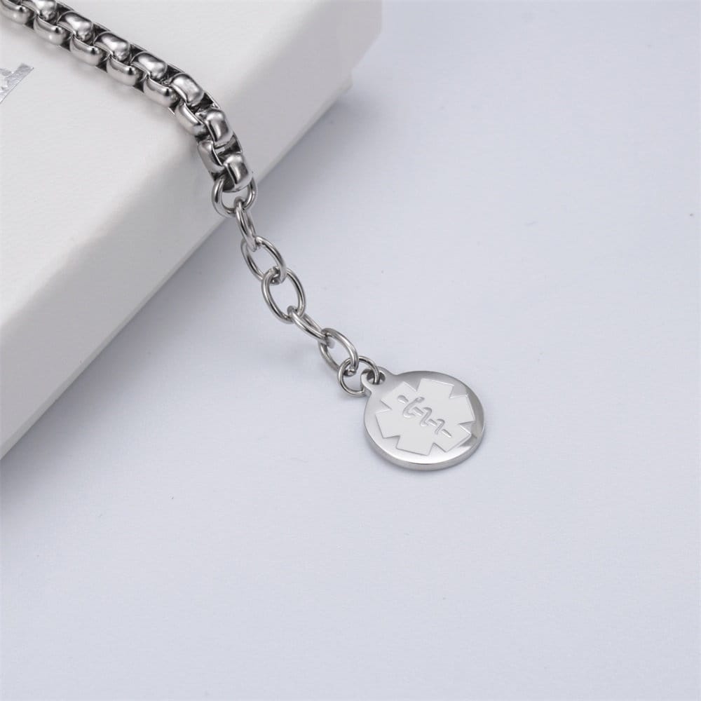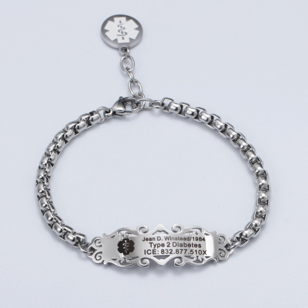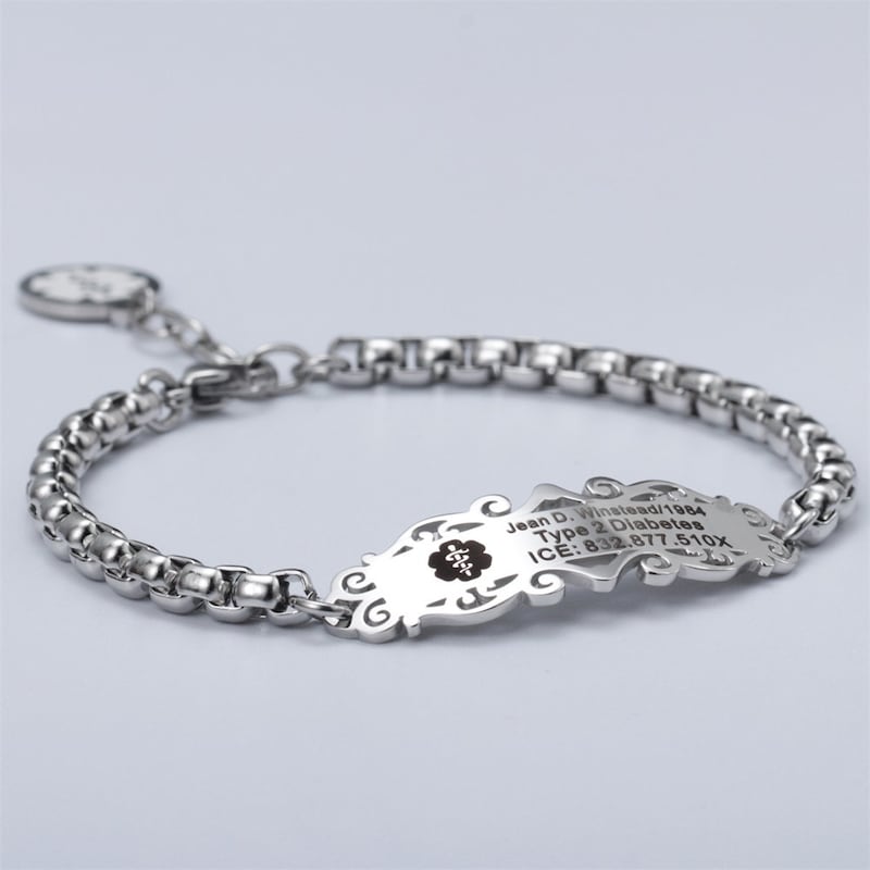 This is an elegant interchangeable medical alert id bracelet with free engraving for women which is handcrafted with 100% surgical grade 316L stainless steel(hypoallergenic and safe for allergic people),perfectly connected with elegant and unique metal link chains which designed to provide an on-trend look and highly visible to emergency responders, and also with elegance in mind. You could choose the emergency medical ID bracelet you prefer and remove the ID tag and affix it to any other interchangeable medical alert bracelet in our store to suit your mood or activity.