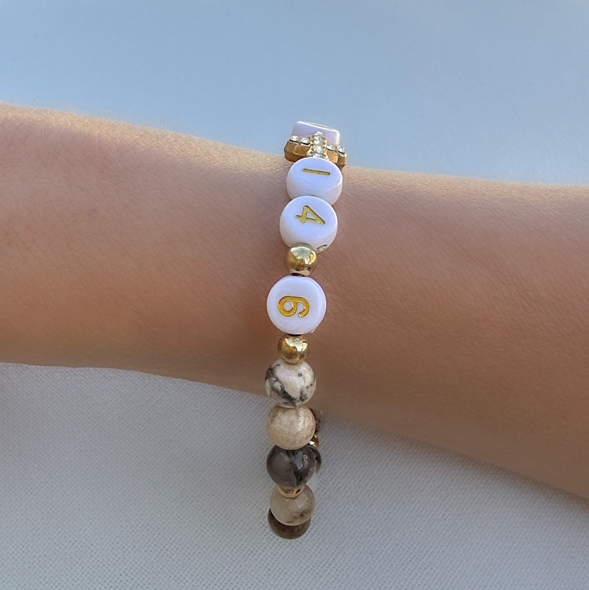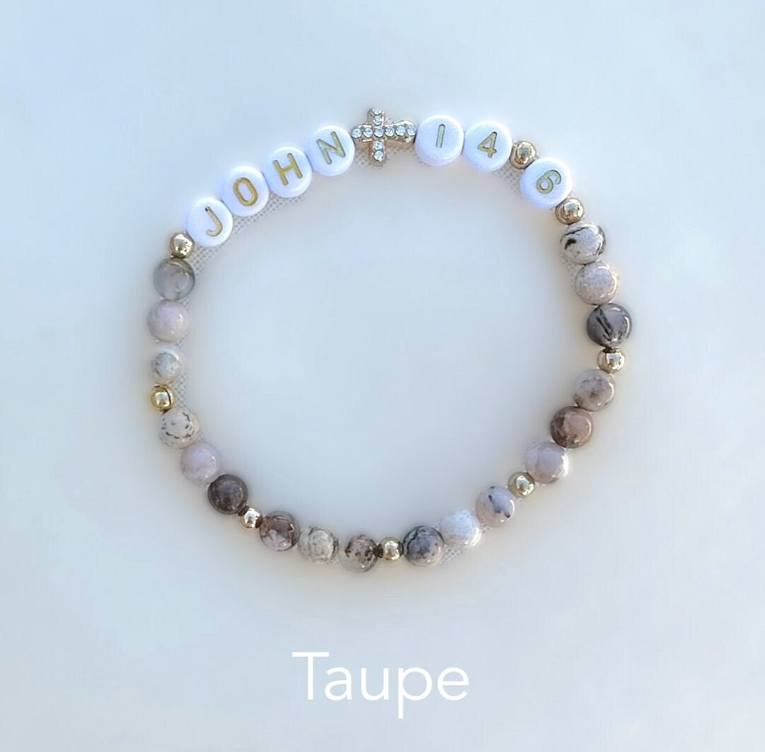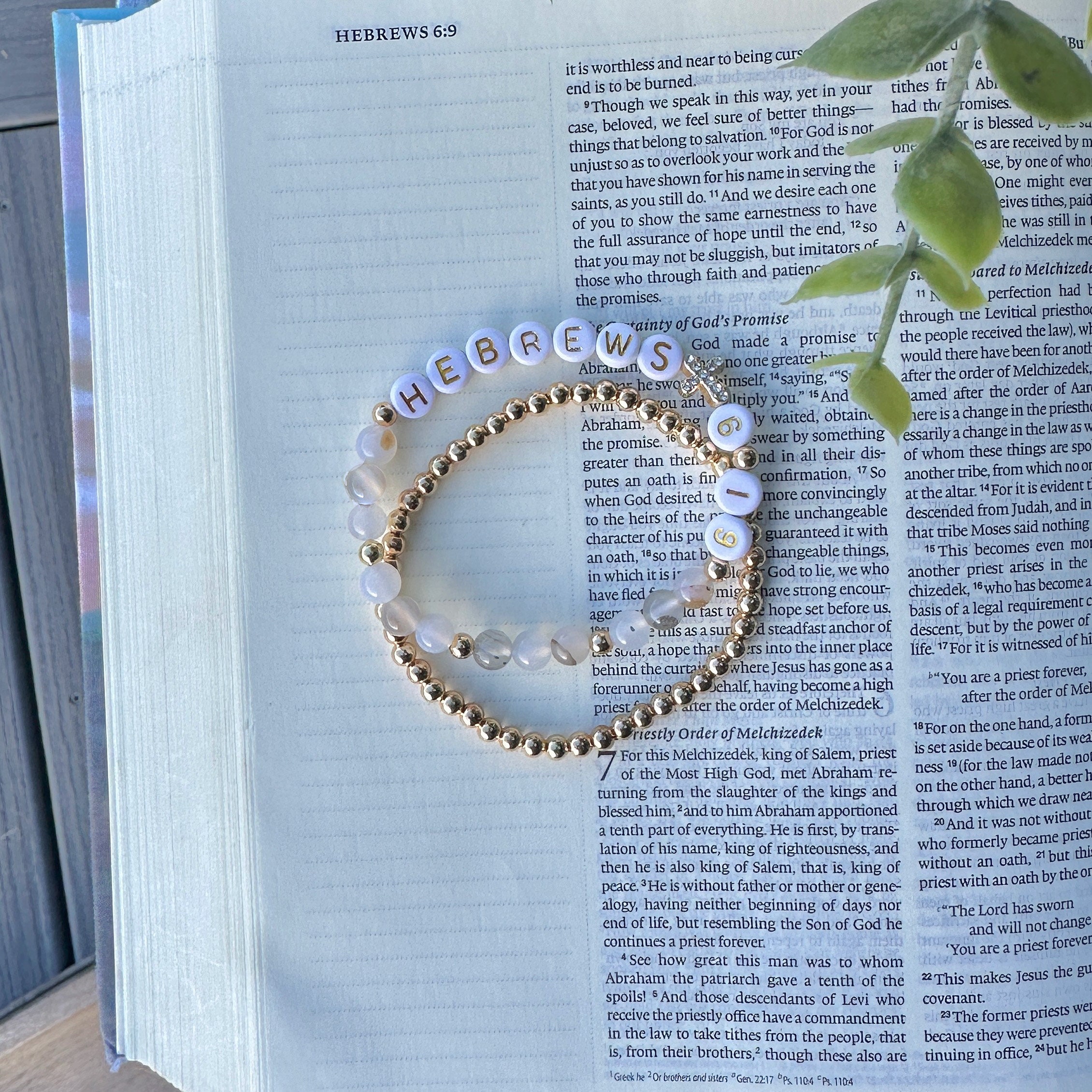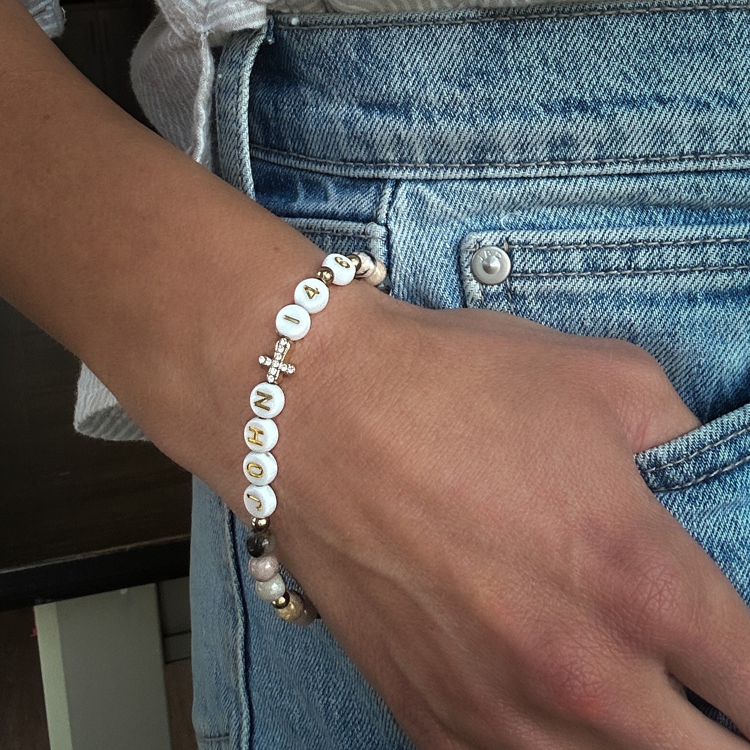 A heavenly combination of round 6 mm agate and flower stone beads, 4 mm 14k gold filled spacer beads, gold cubic zirconia cross, and your custom bible verse in white/gold letter beads.