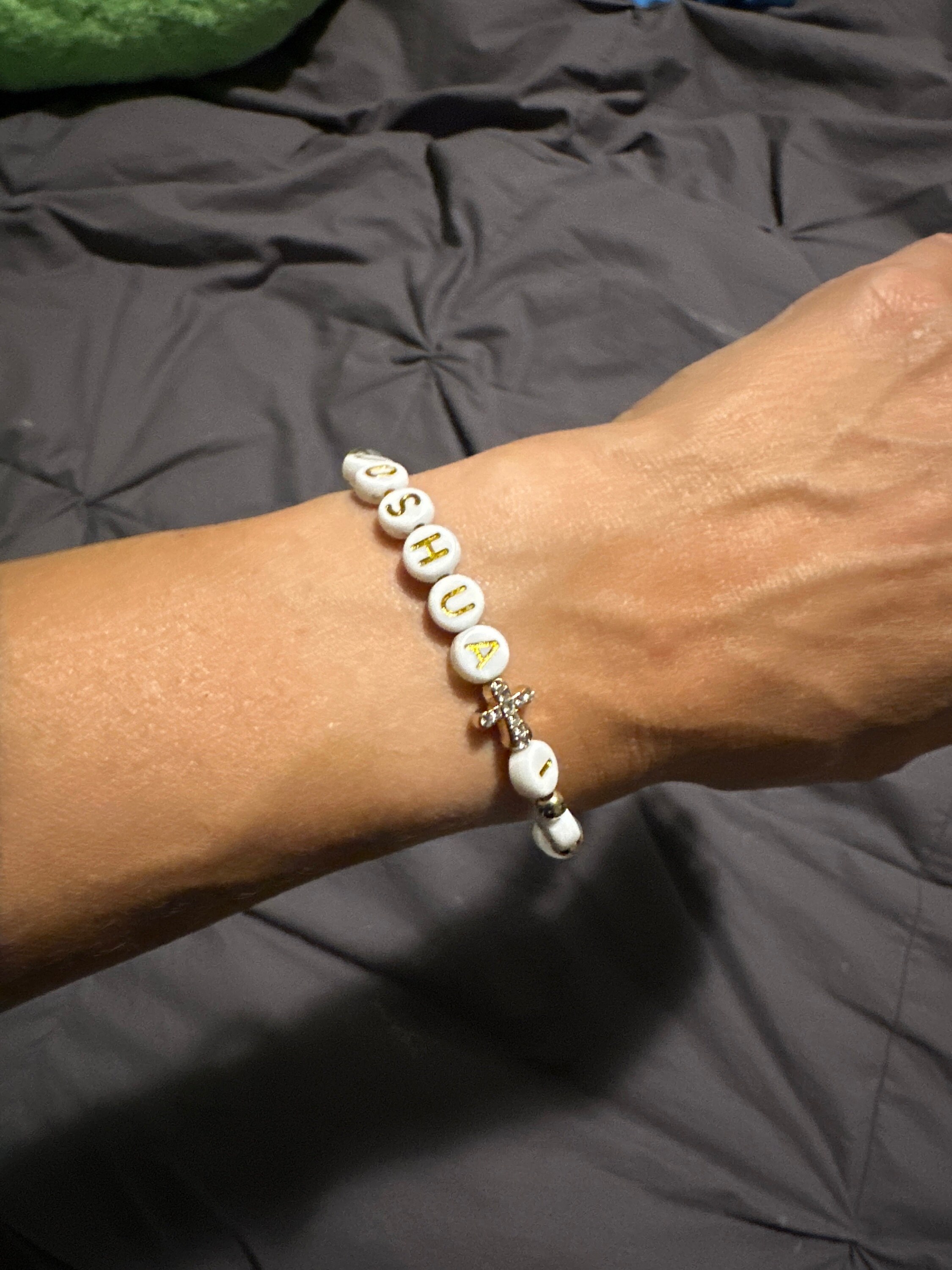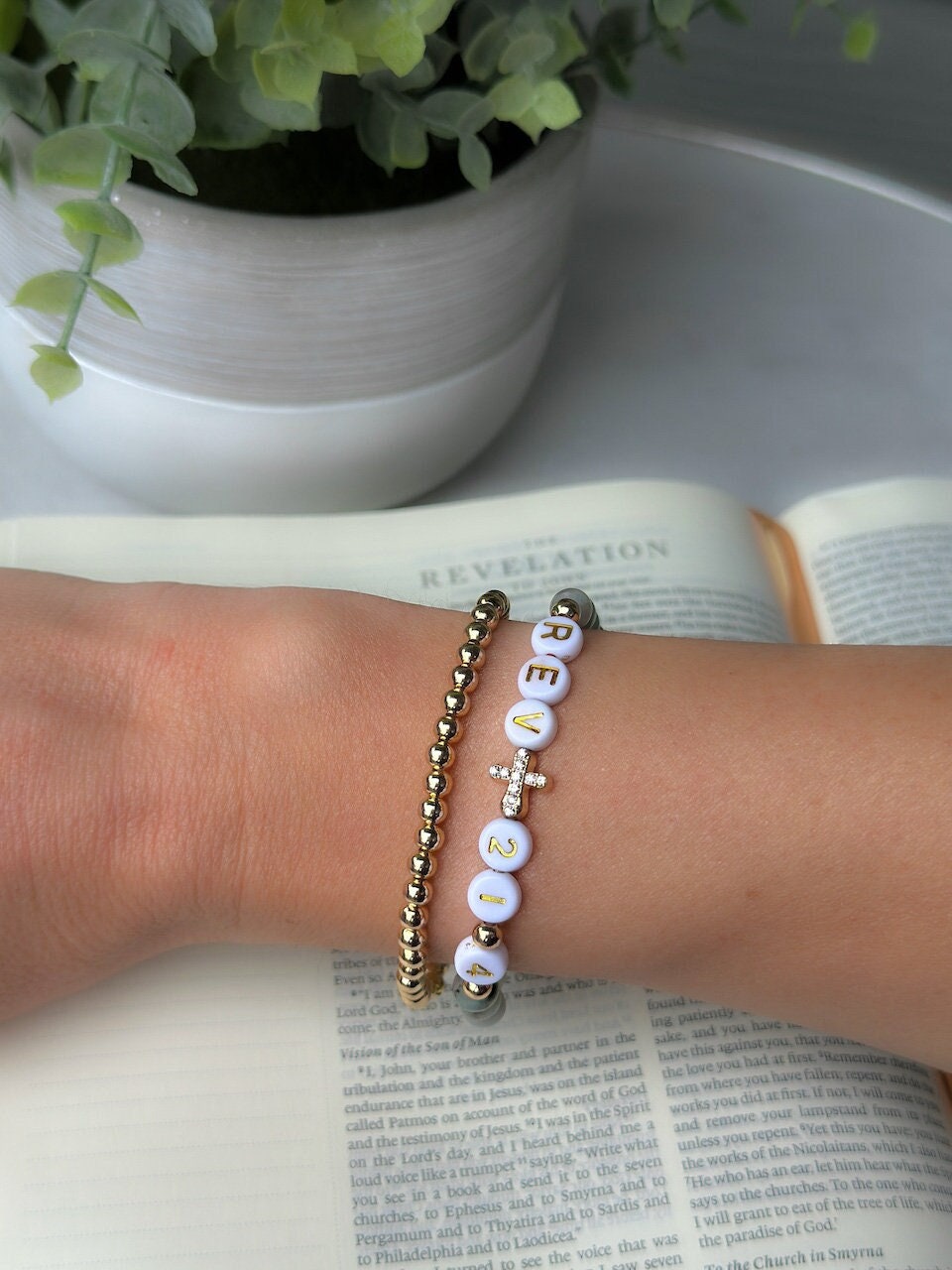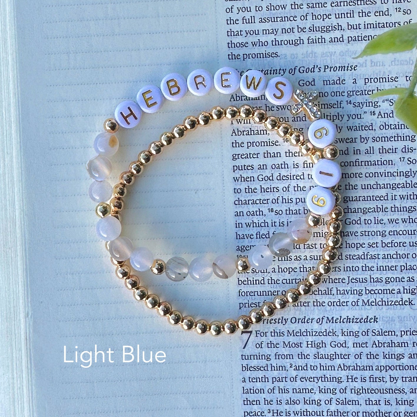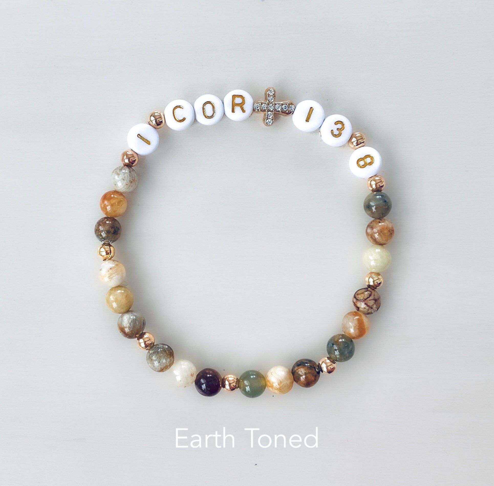 A heavenly combination of round 6 mm agate and flower stone beads, 4 mm 14k gold filled spacer beads, gold cubic zirconia cross, and your custom bible verse in white/gold letter beads.