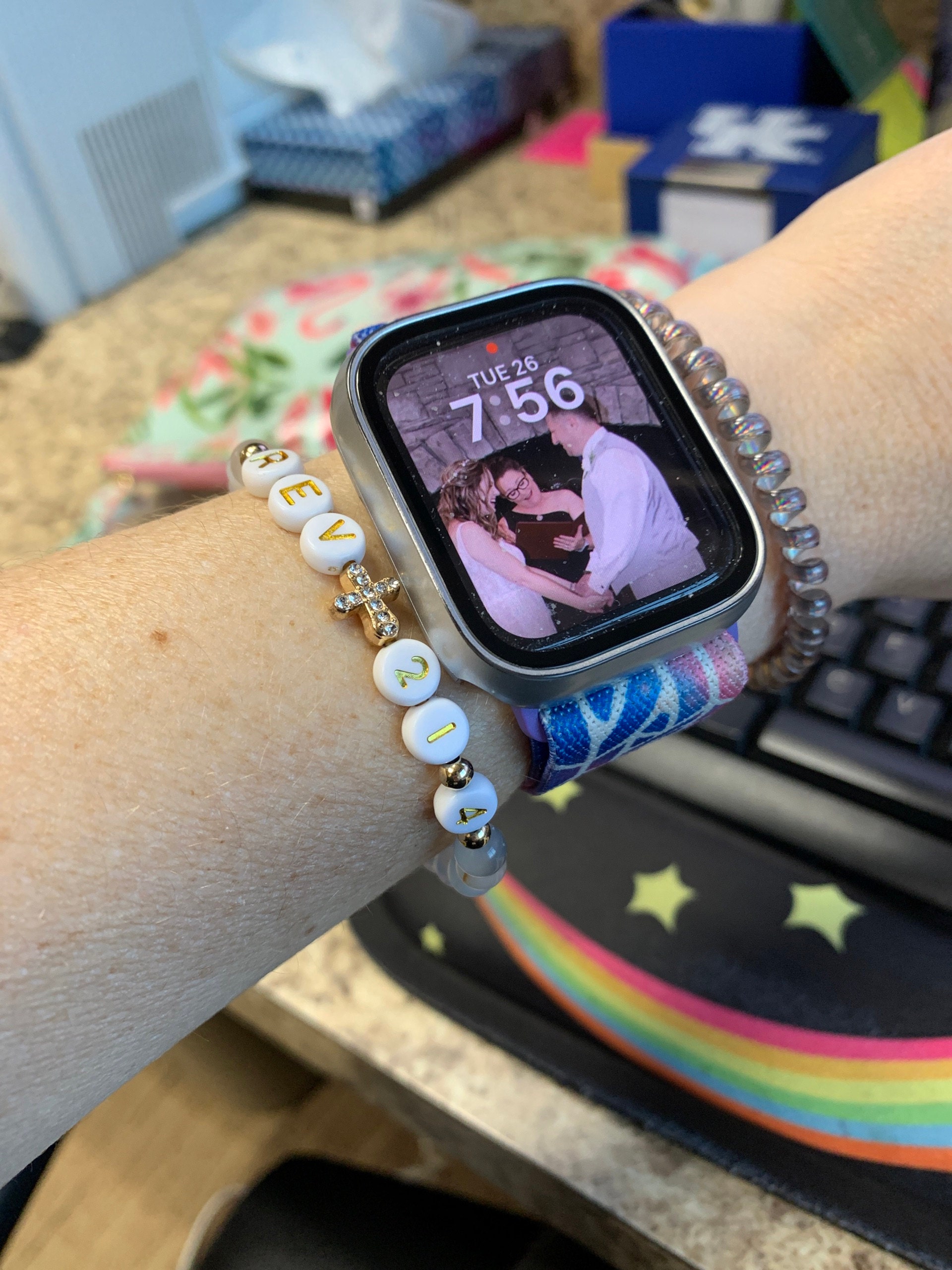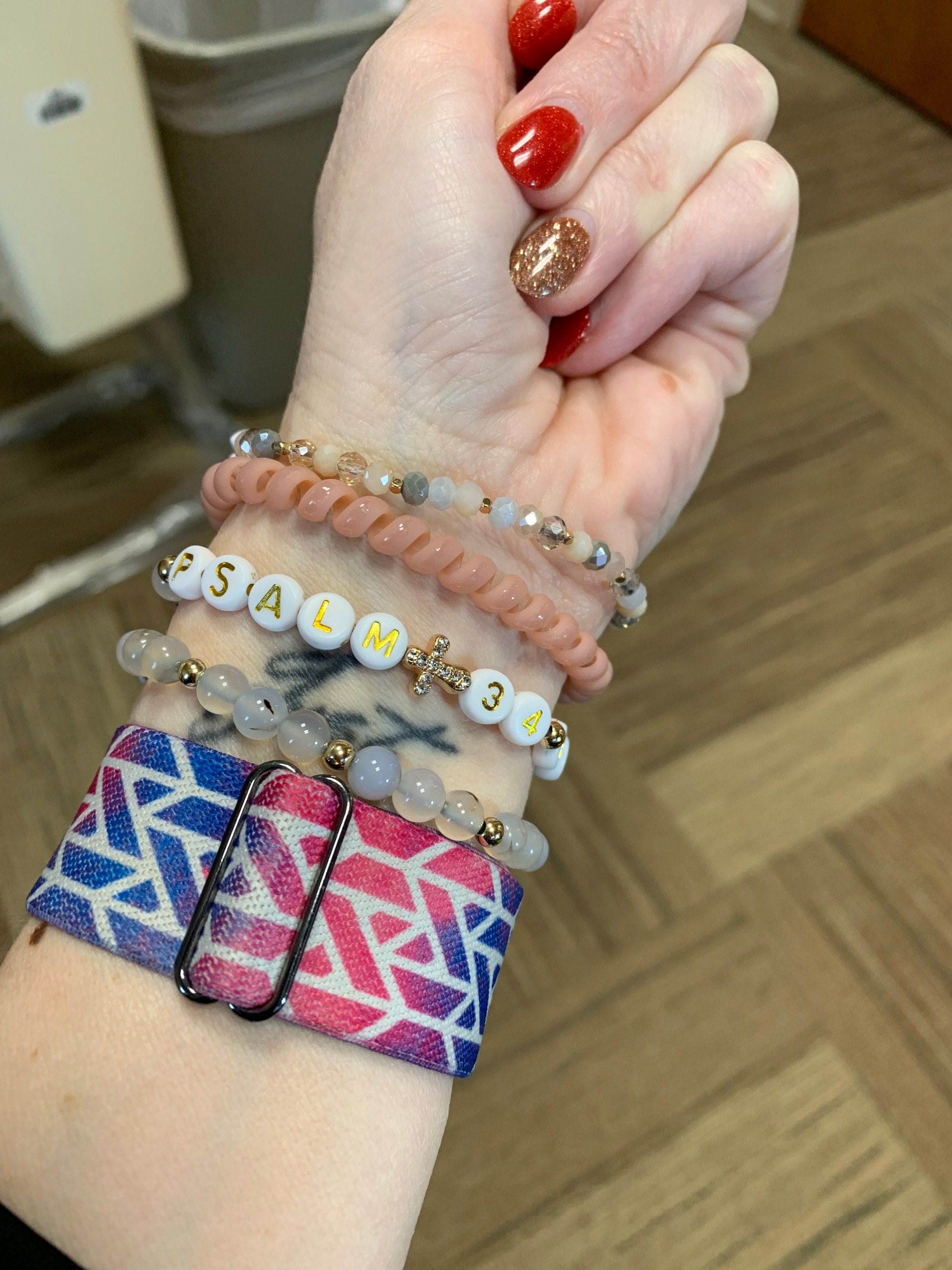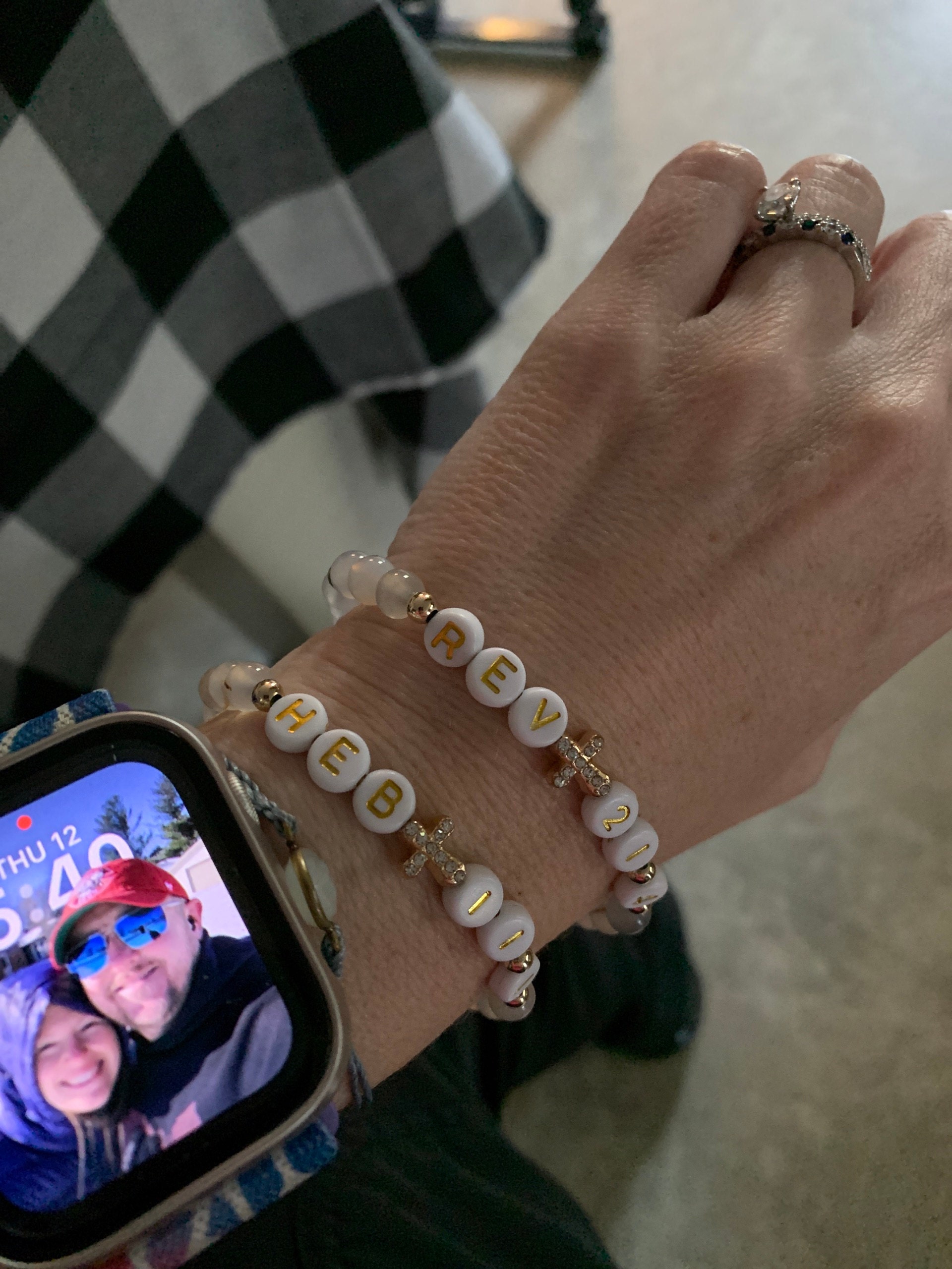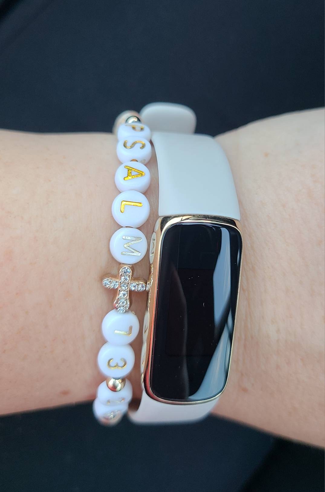 A heavenly combination of round 6 mm agate and flower stone beads, 4 mm 14k gold filled spacer beads, gold cubic zirconia cross, and your custom bible verse in white/gold letter beads.