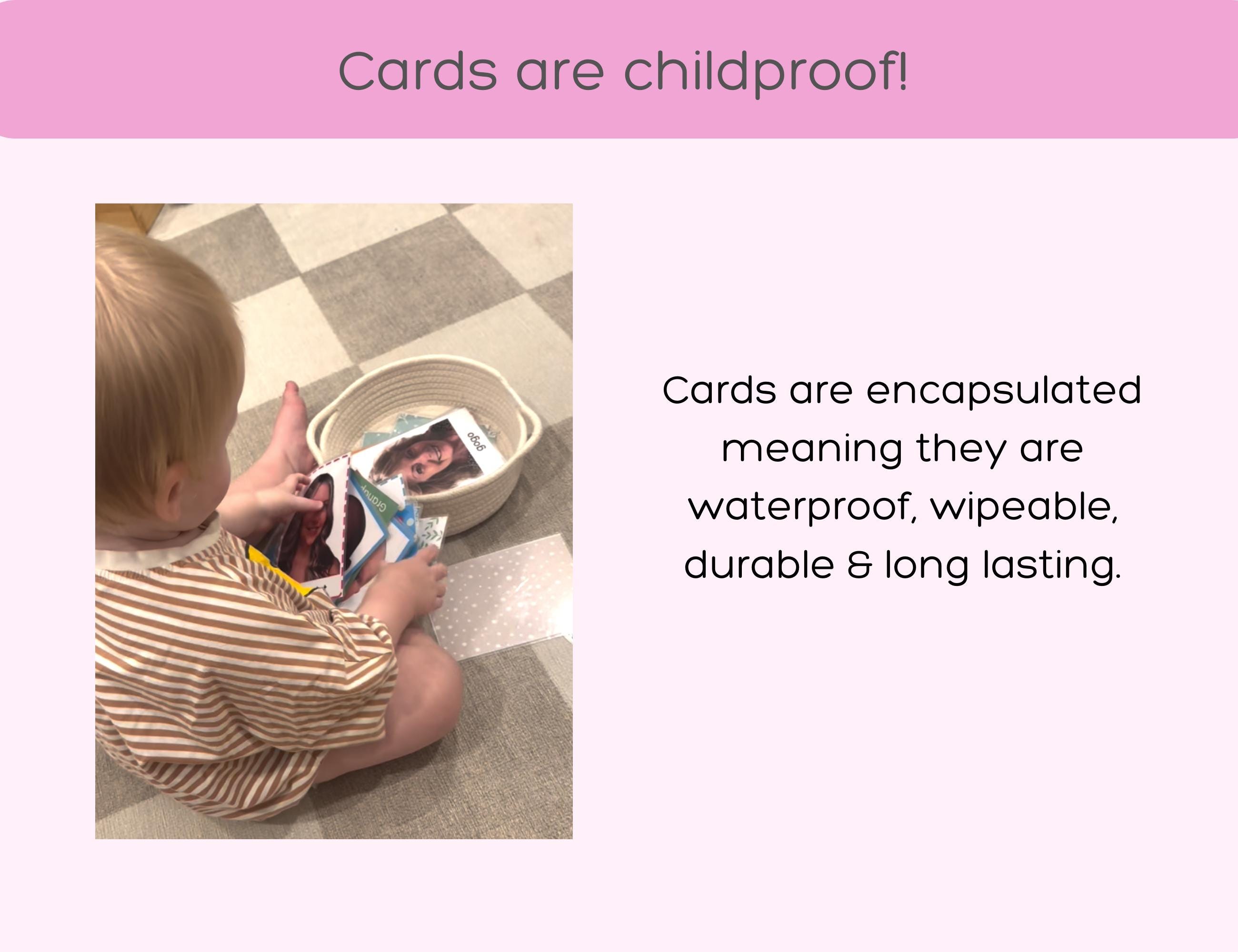 Learning Flashcards - Each flashcard is printed professionally on museum-grade, 80gsm paper and laminated inside a waterproof plastic pouch. These flashcards are wipeable, chewable, dunkable and crazy kid-proof!