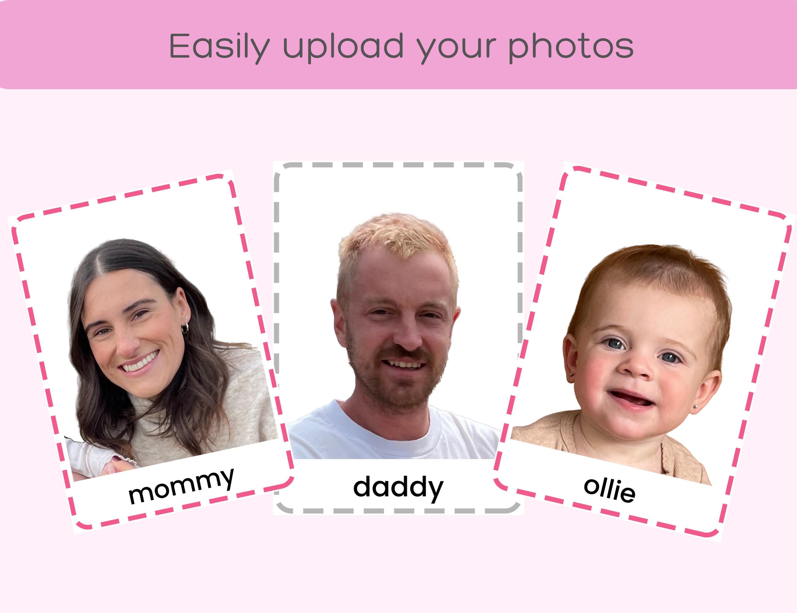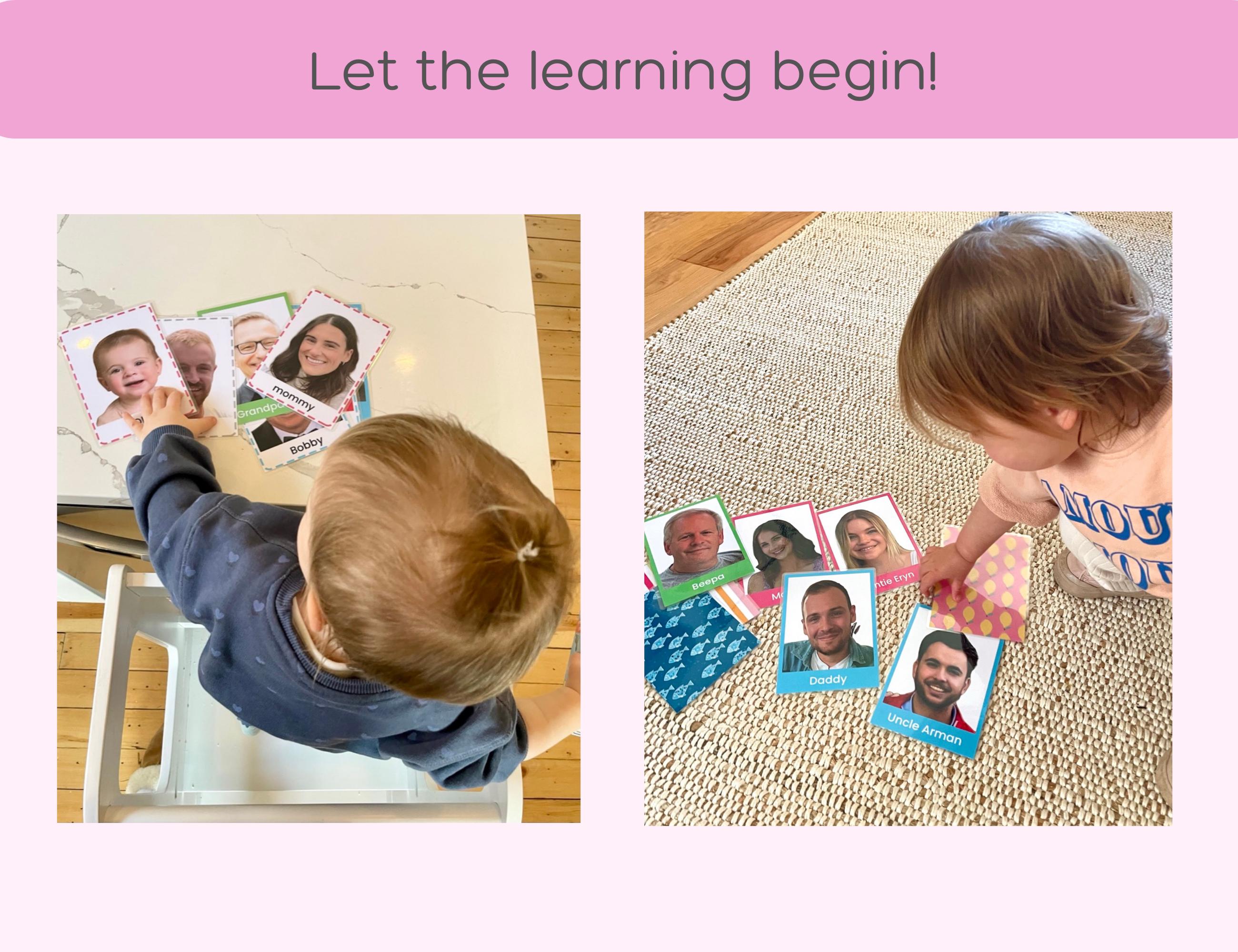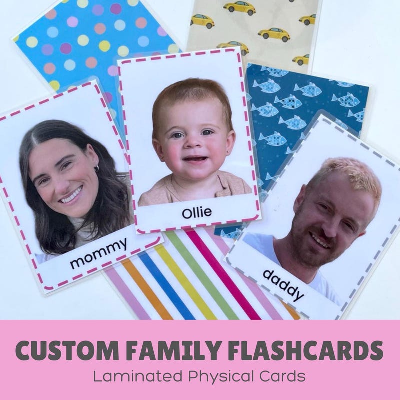 Custom Family Flashcards - Create your own classroom-grade flashcards for all of your family members, friends, neighbours, teachers and pets. These encapsulated flashcards are waterproof, wipeable and child proof.