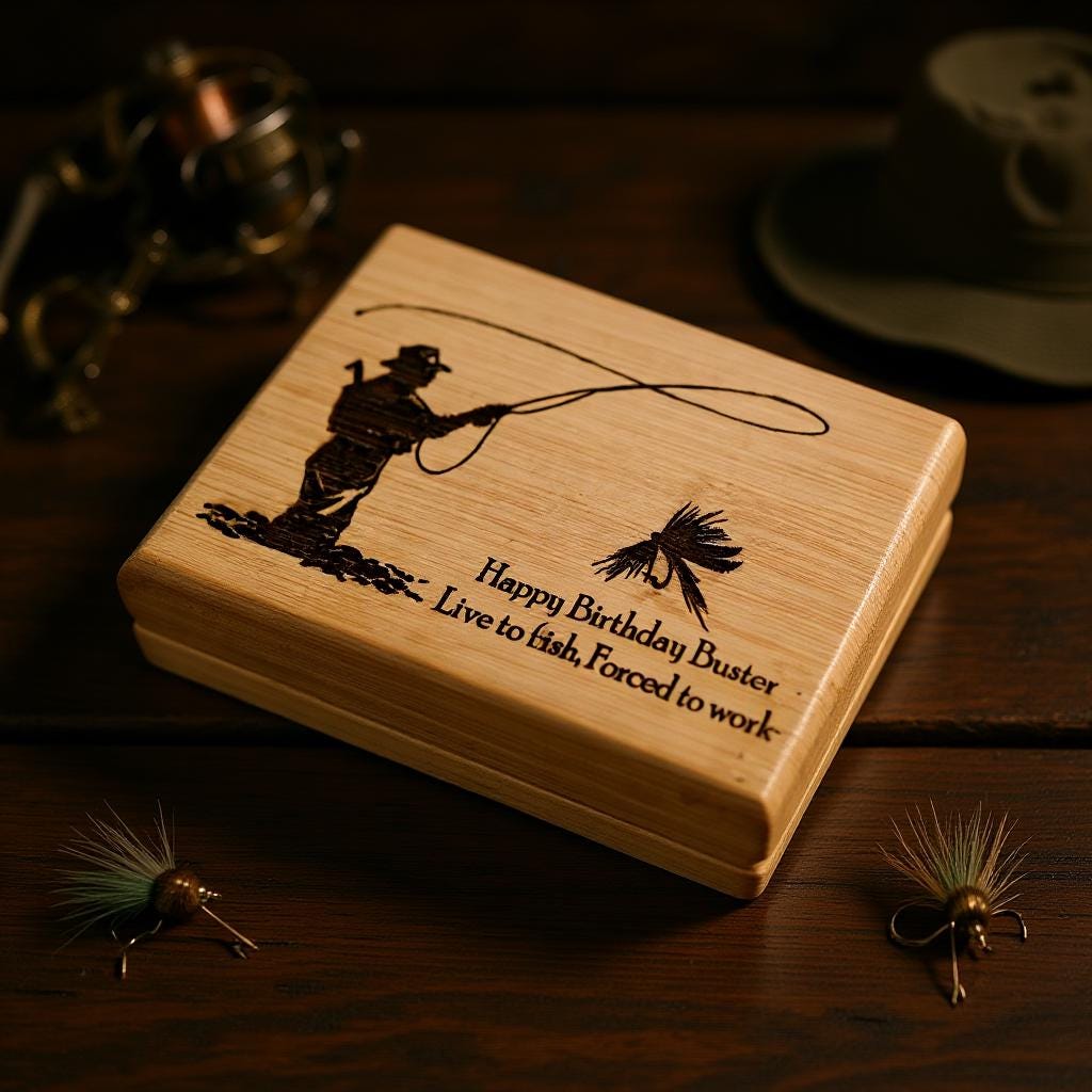 Carry your essential flies in a storage box made uniquely for you. This custom box allows you to select its layout, compartments, and personalization, ensuring it perfectly matches your fishing style and needs.