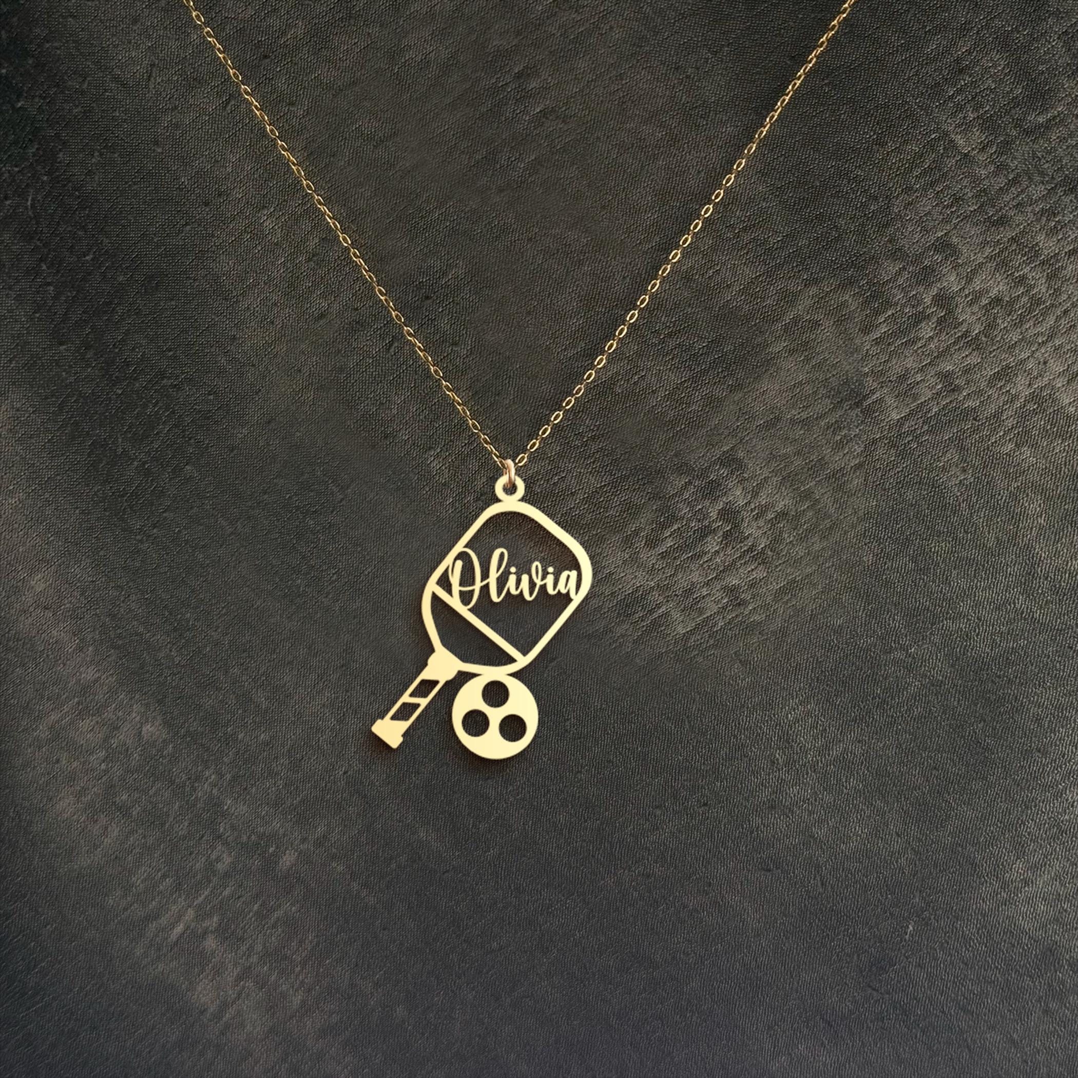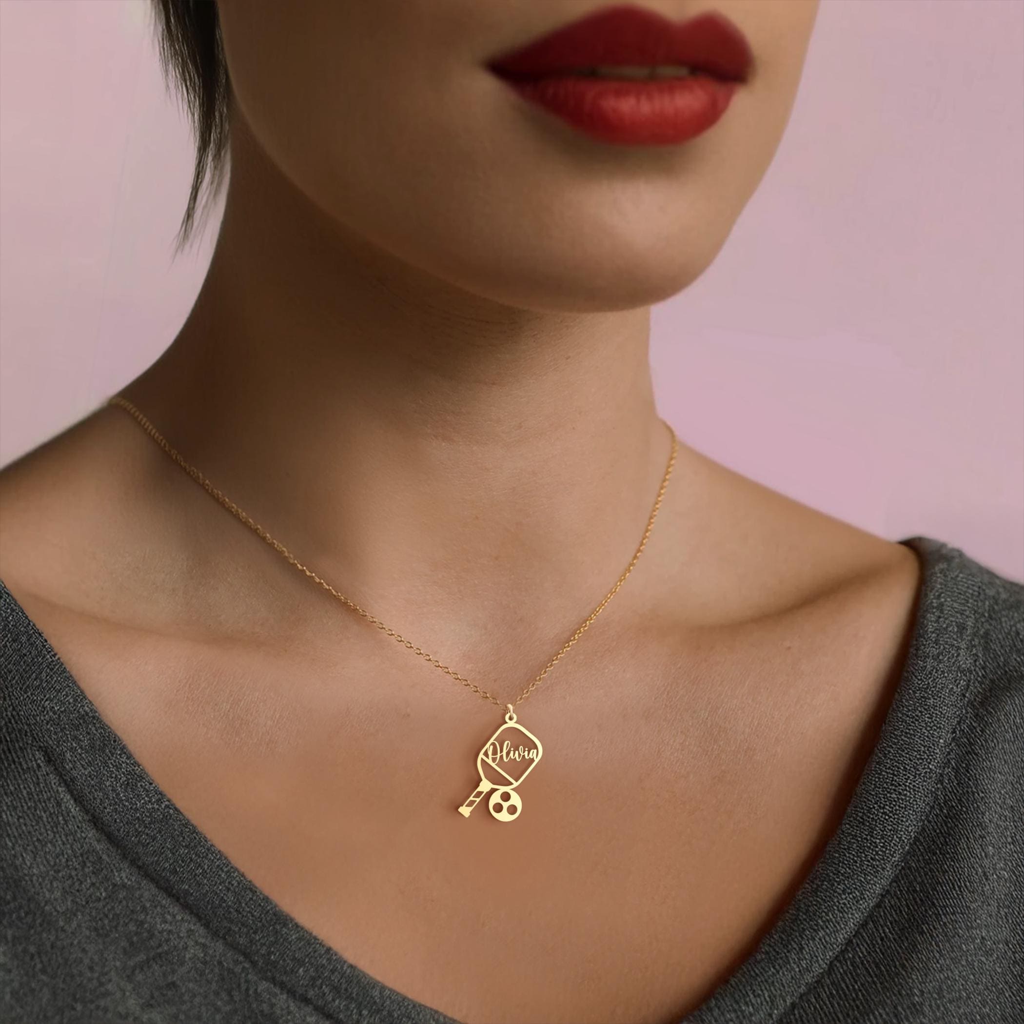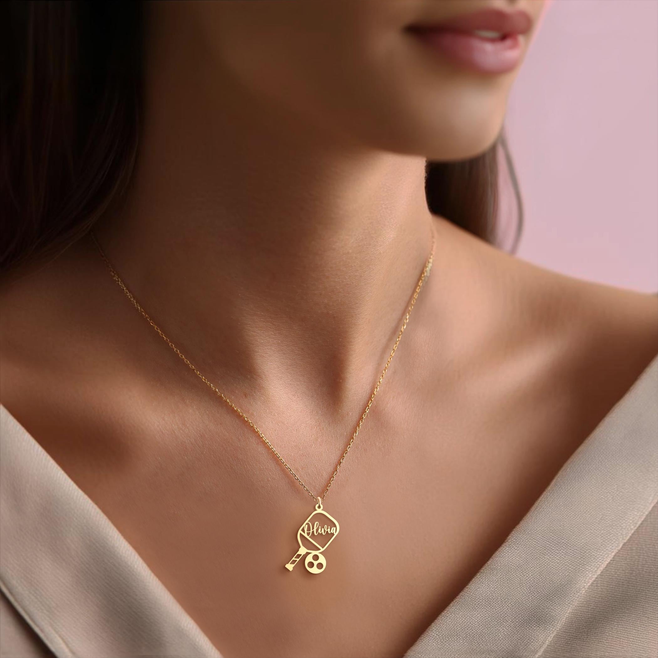 This custom name pickleball necklace features a personalized racket pendant, perfect for pickleball enthusiasts, it’s a unique and thoughtful gift for those who love the game.