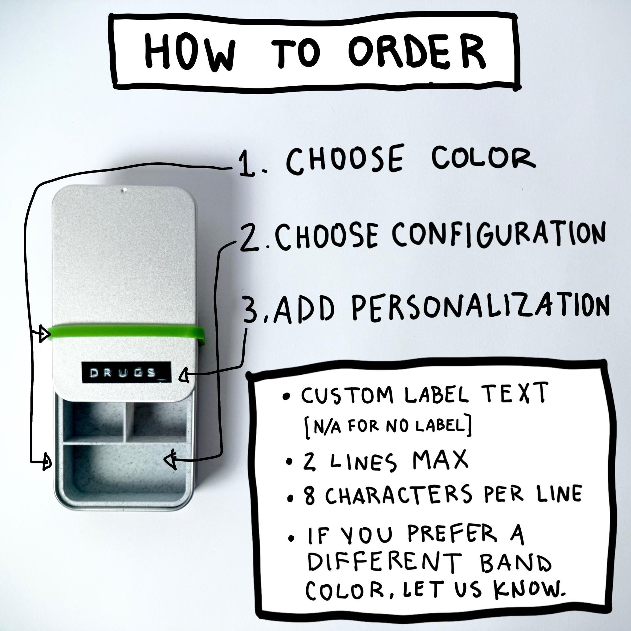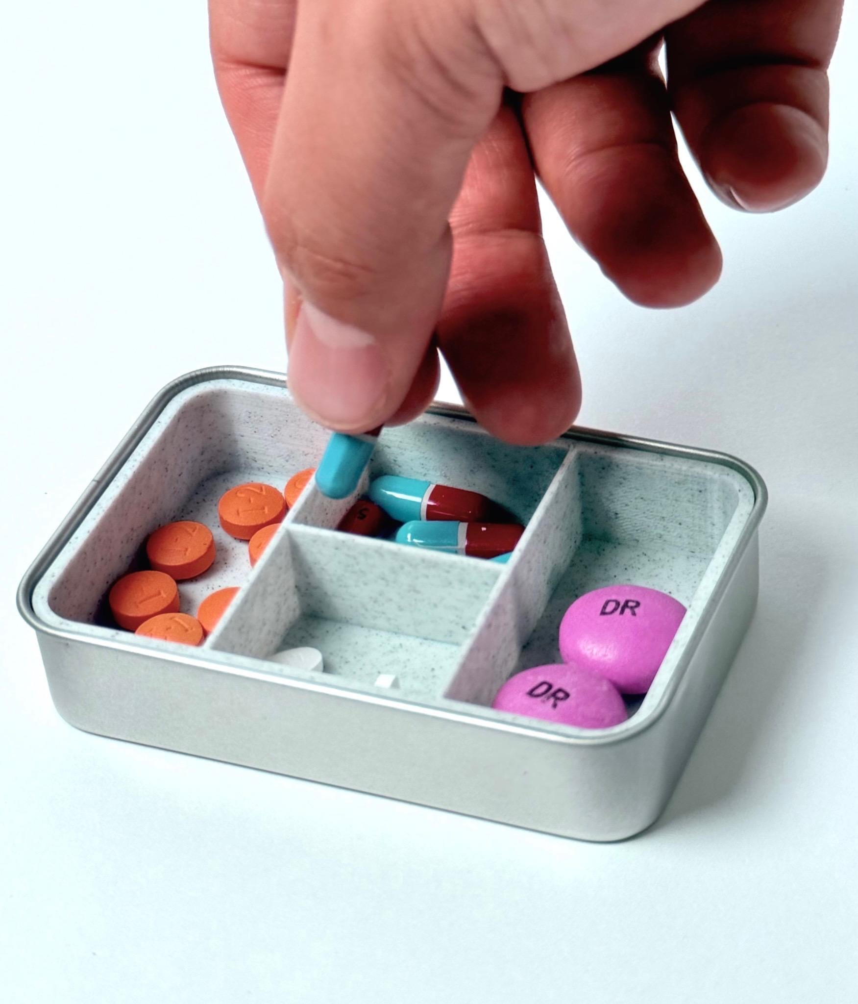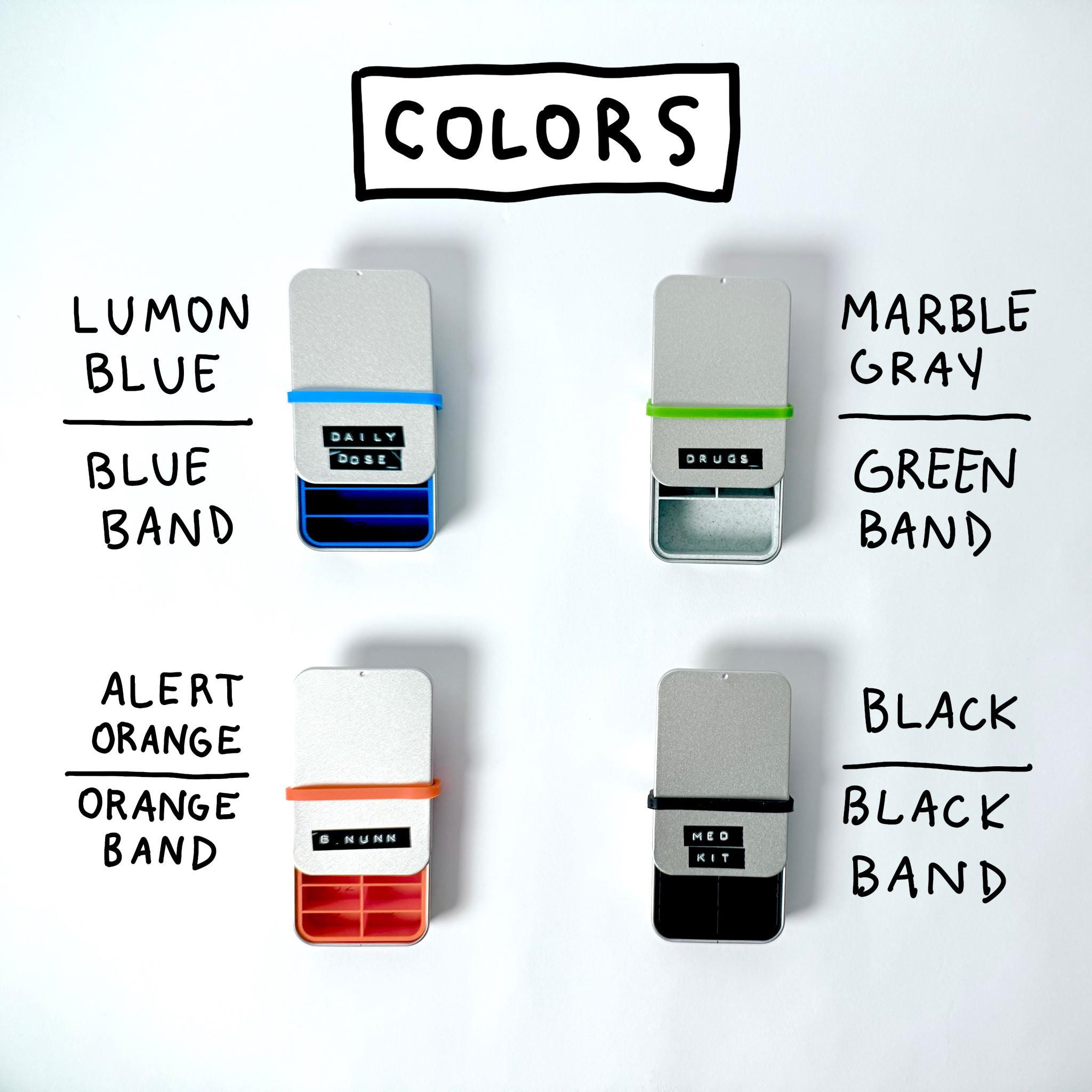 This compact travel pill holder is designed for the guy who values function and style. Crafted from a sturdy metal tin, and custom 3D printed insert, it features a unique sliding lid for quick access. The sliding lid snaps into place and the matching band keeps it secure in your pocket, bag, or glove box. Whether you're carrying vitamins, medication, or small trinkets, this tactical storage box is built for durability.