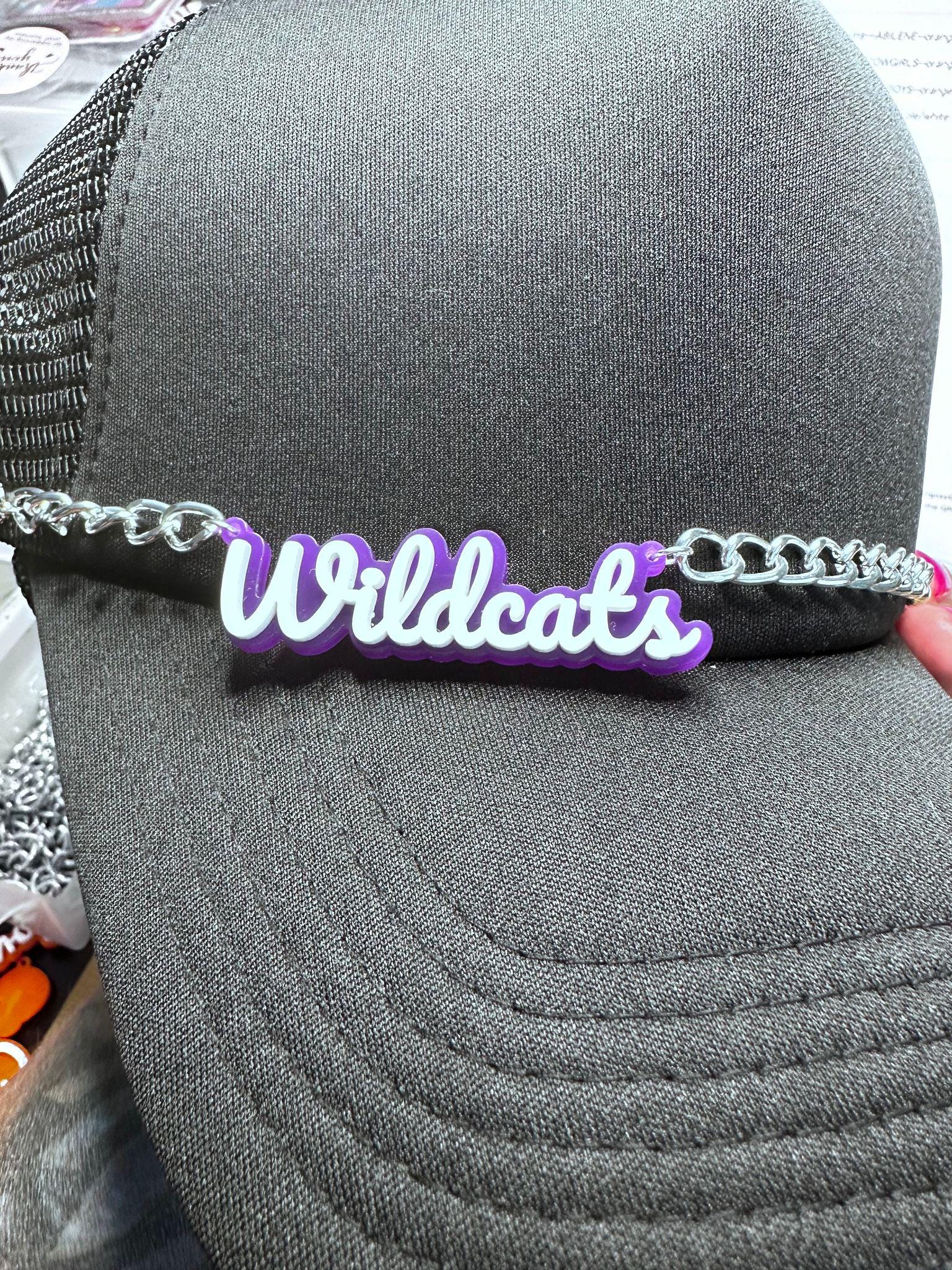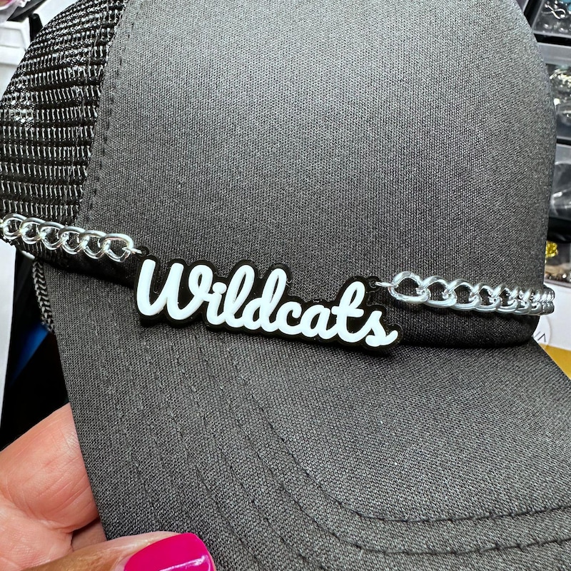 Our CUSTOM School Spirit hat chains can be ANY TEAM/NAME and any color--just name! Choose from gold or silver chain. All chains are approximately 9 inches long and feature clasps on both ends for each application to the mesh of any hat.
