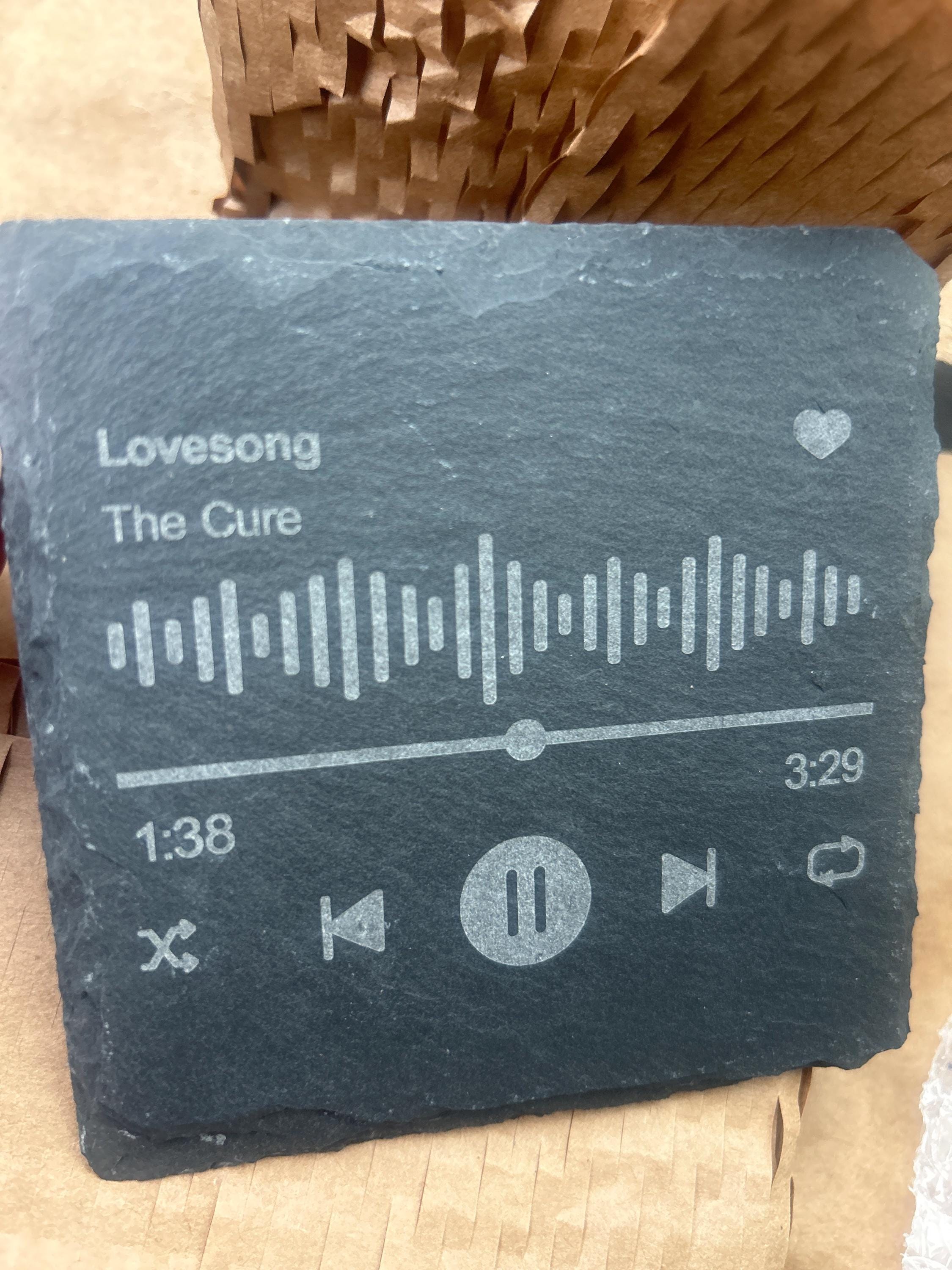 Celebrate the soundtrack of your life with this handcrafted rock coaster engraved to look like a music player. Just send us your favorite song title and artist name, and we’ll engrave it in a stylish interface layout – complete with waveform, play button, and duration bar – exactly like your favorite streaming app.