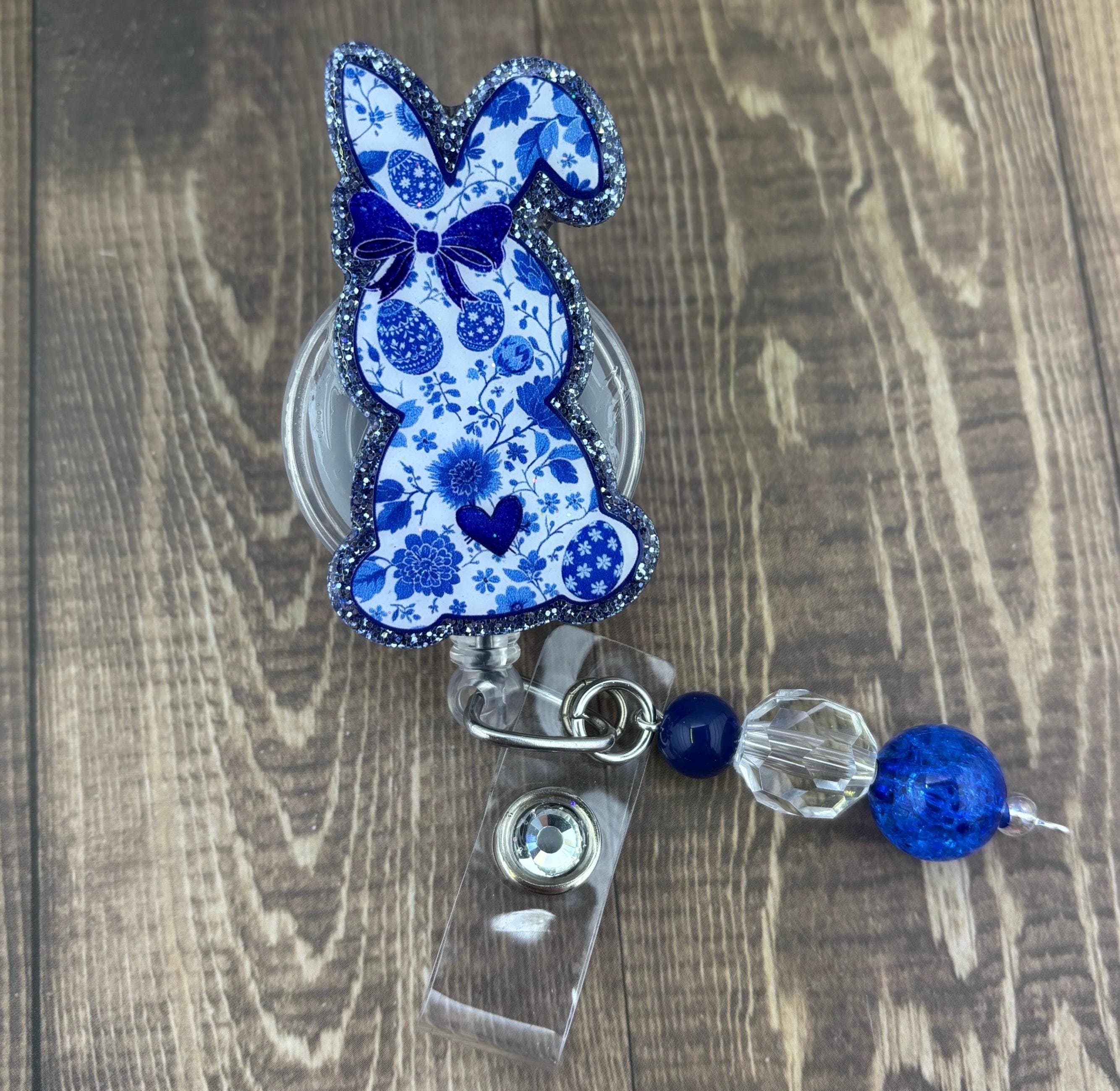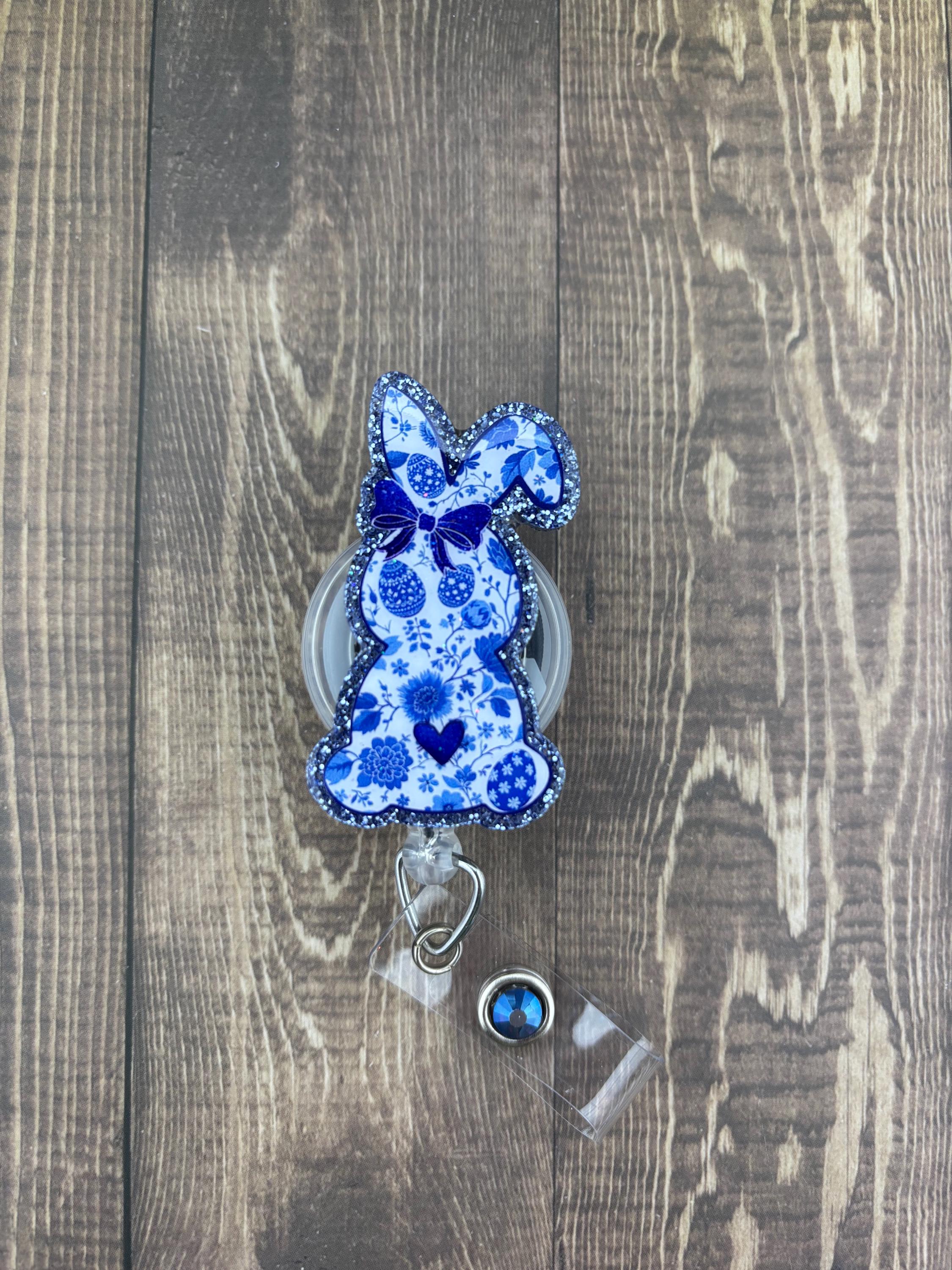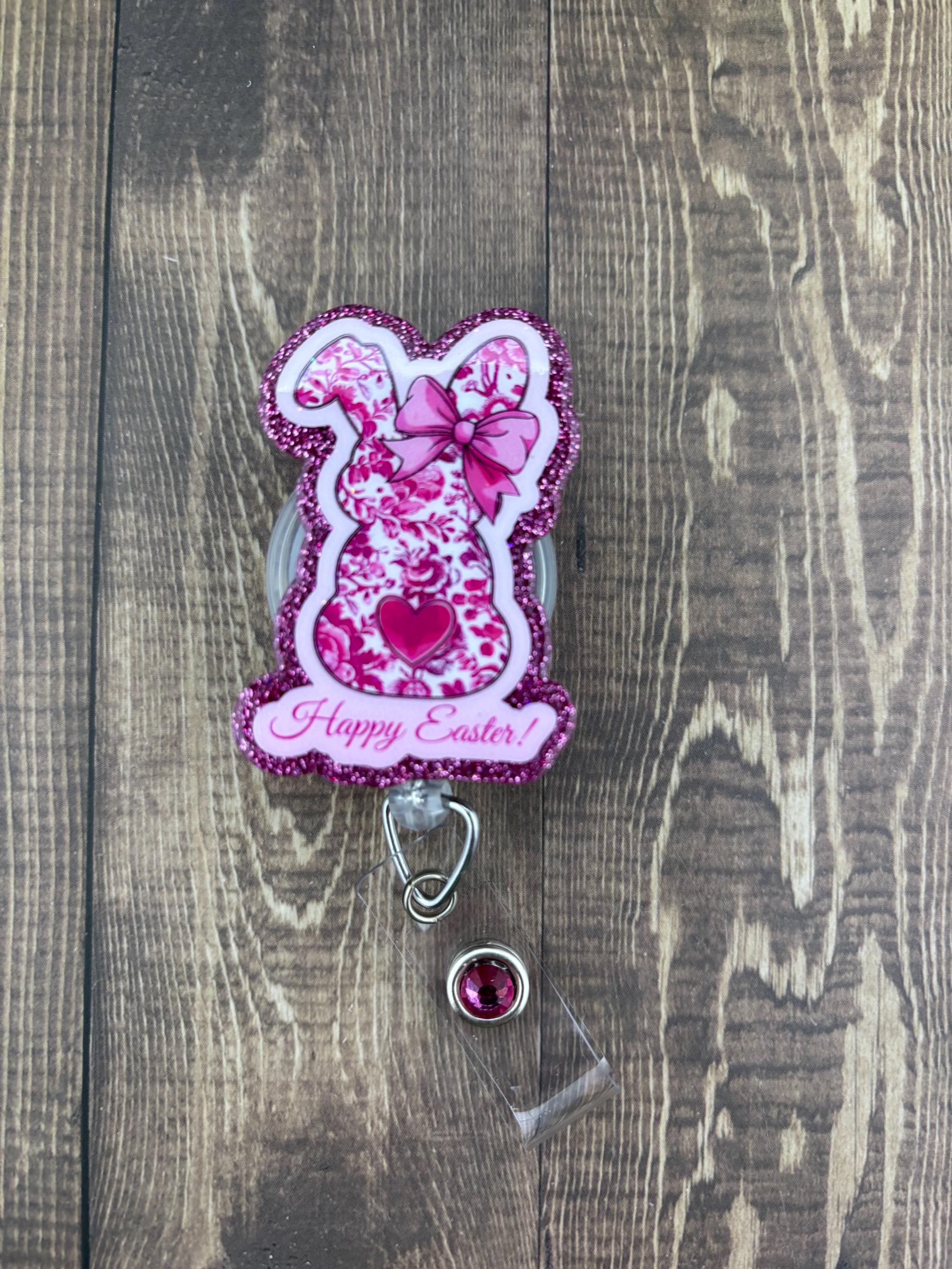 Cute floral bunny acrylic badge decorated with vinyl and glitter sealed with UV resin for protection and shine. These Easter badges can be attached to an alligator or belt clip reel.