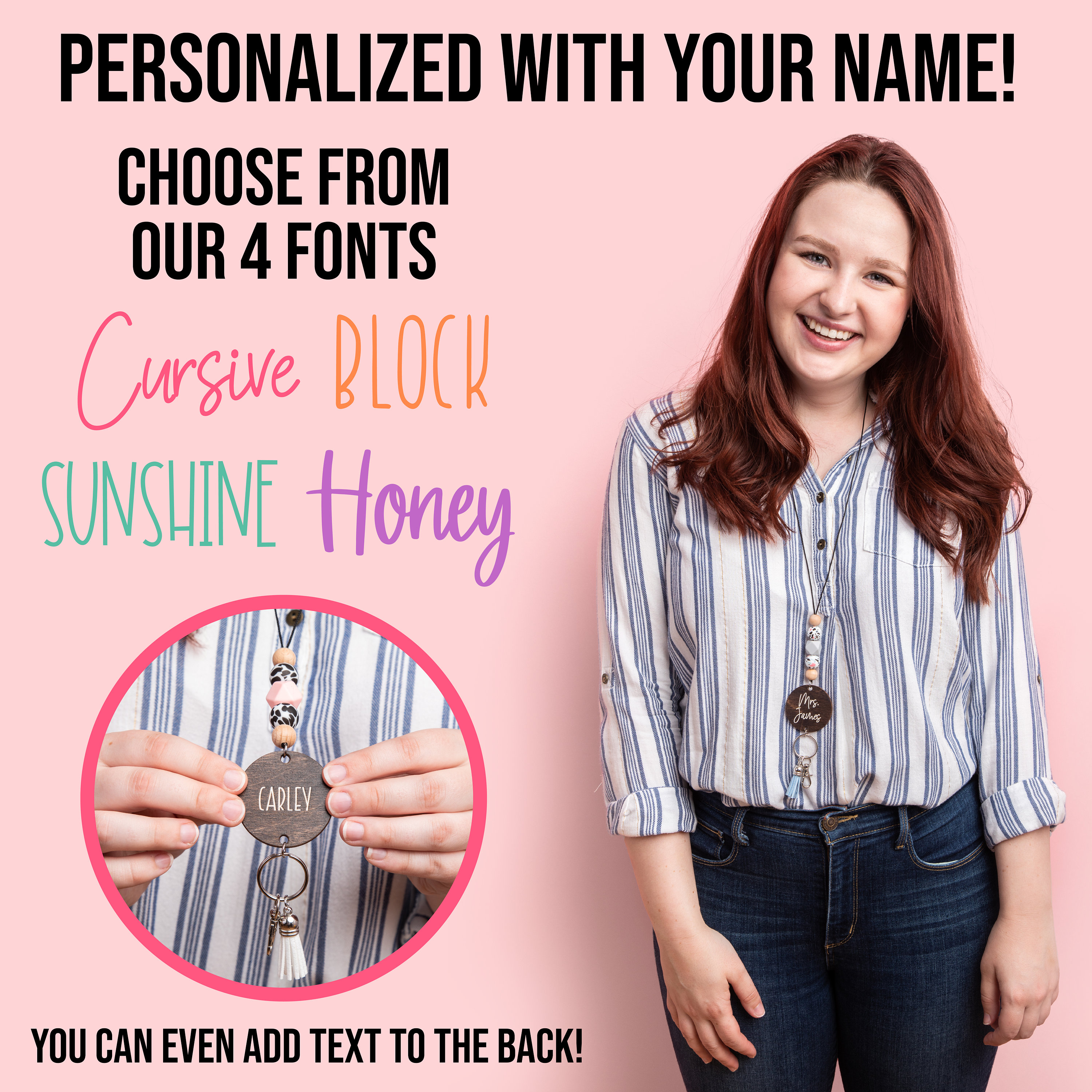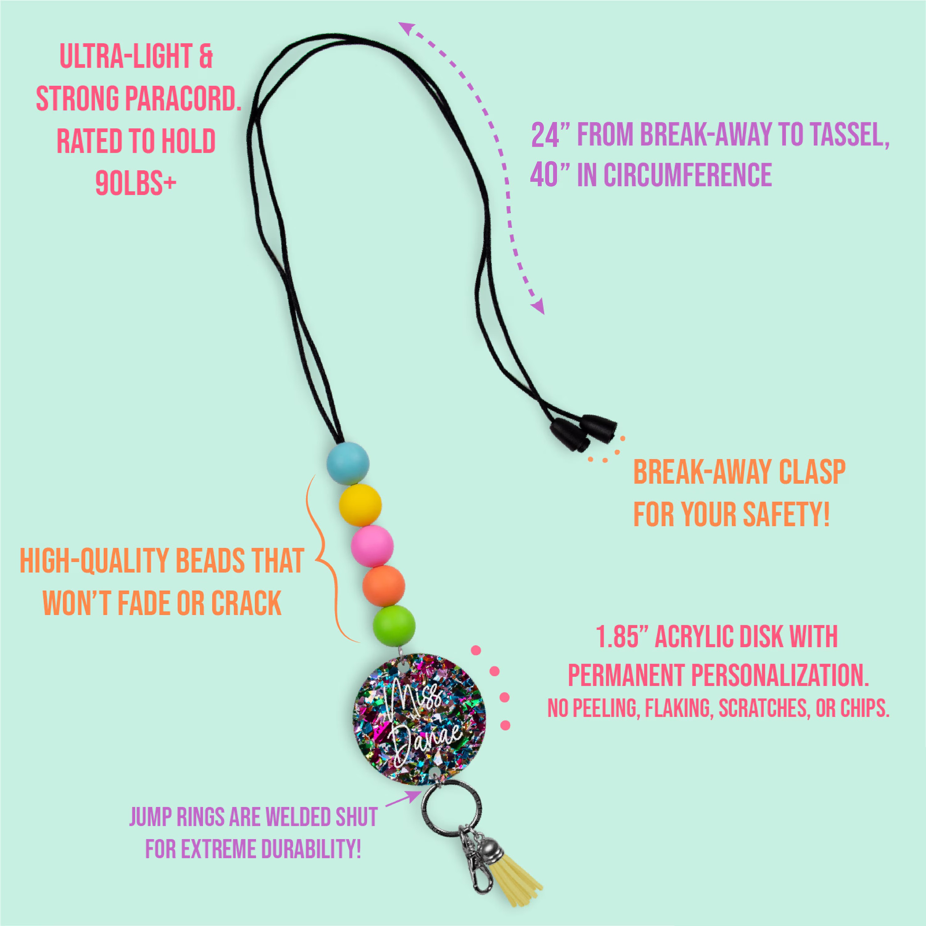 Our personalized lanyards are 40" long (easily shortened for the perfect fit!) and include silicone and wooden beads; no need to worry about them breaking!