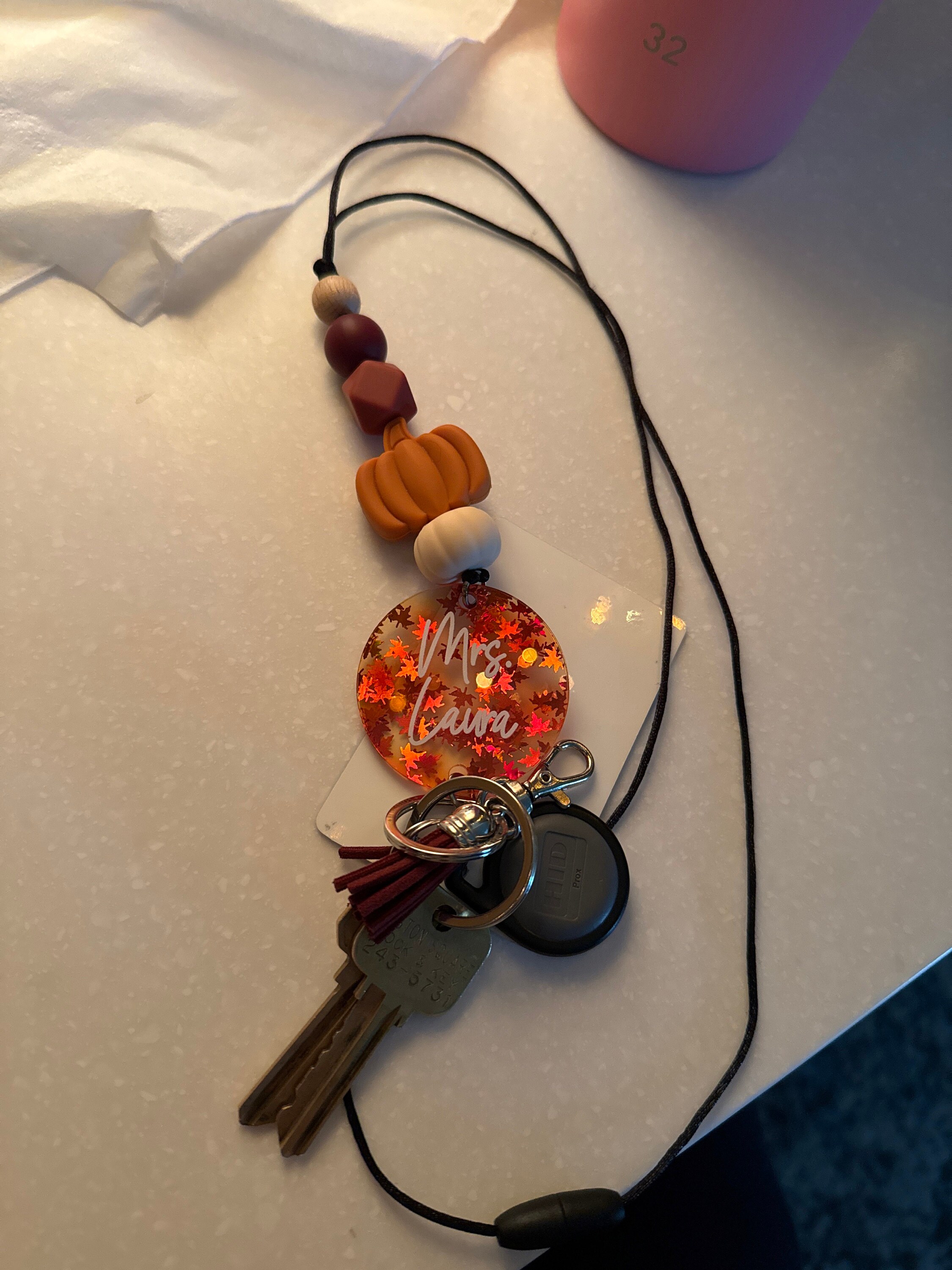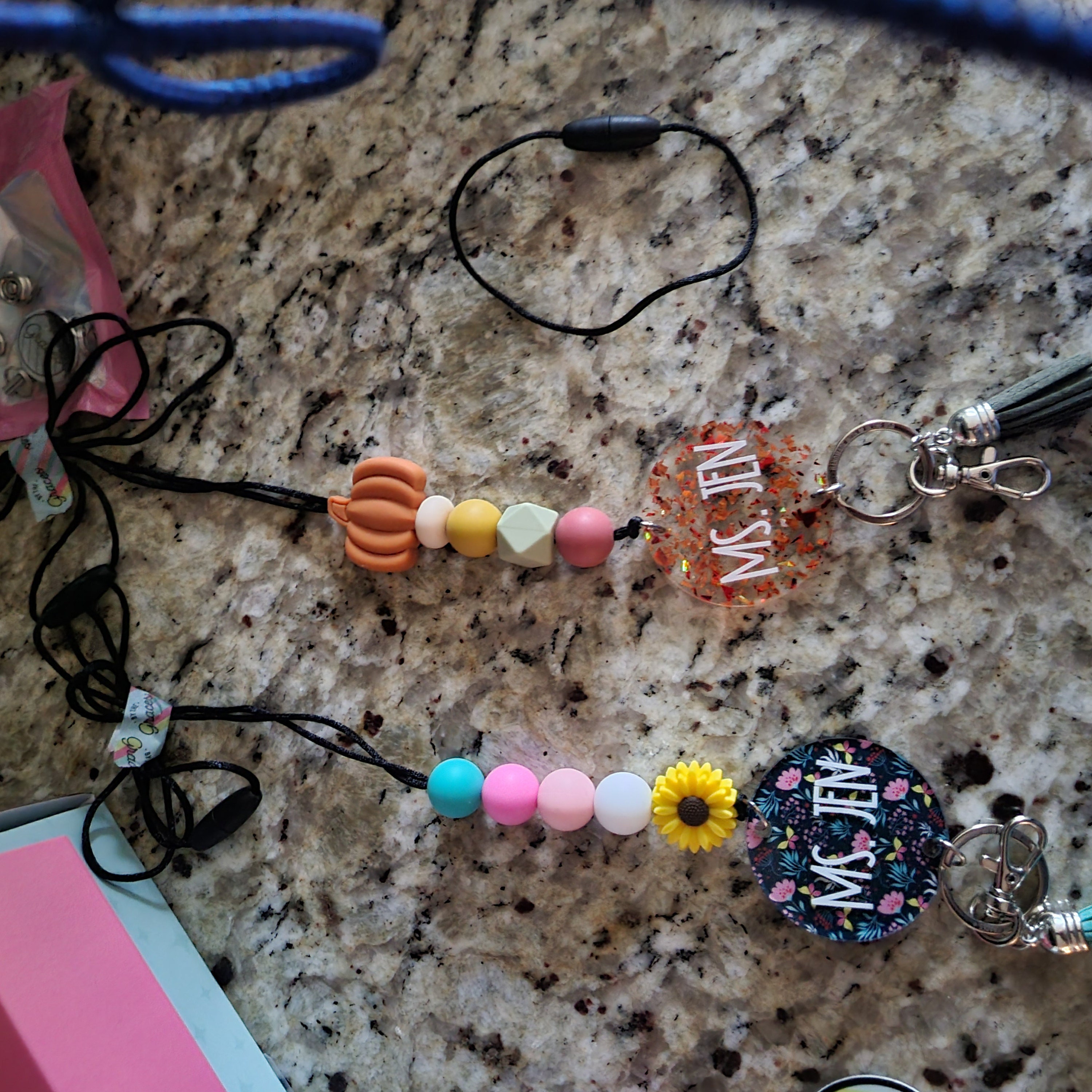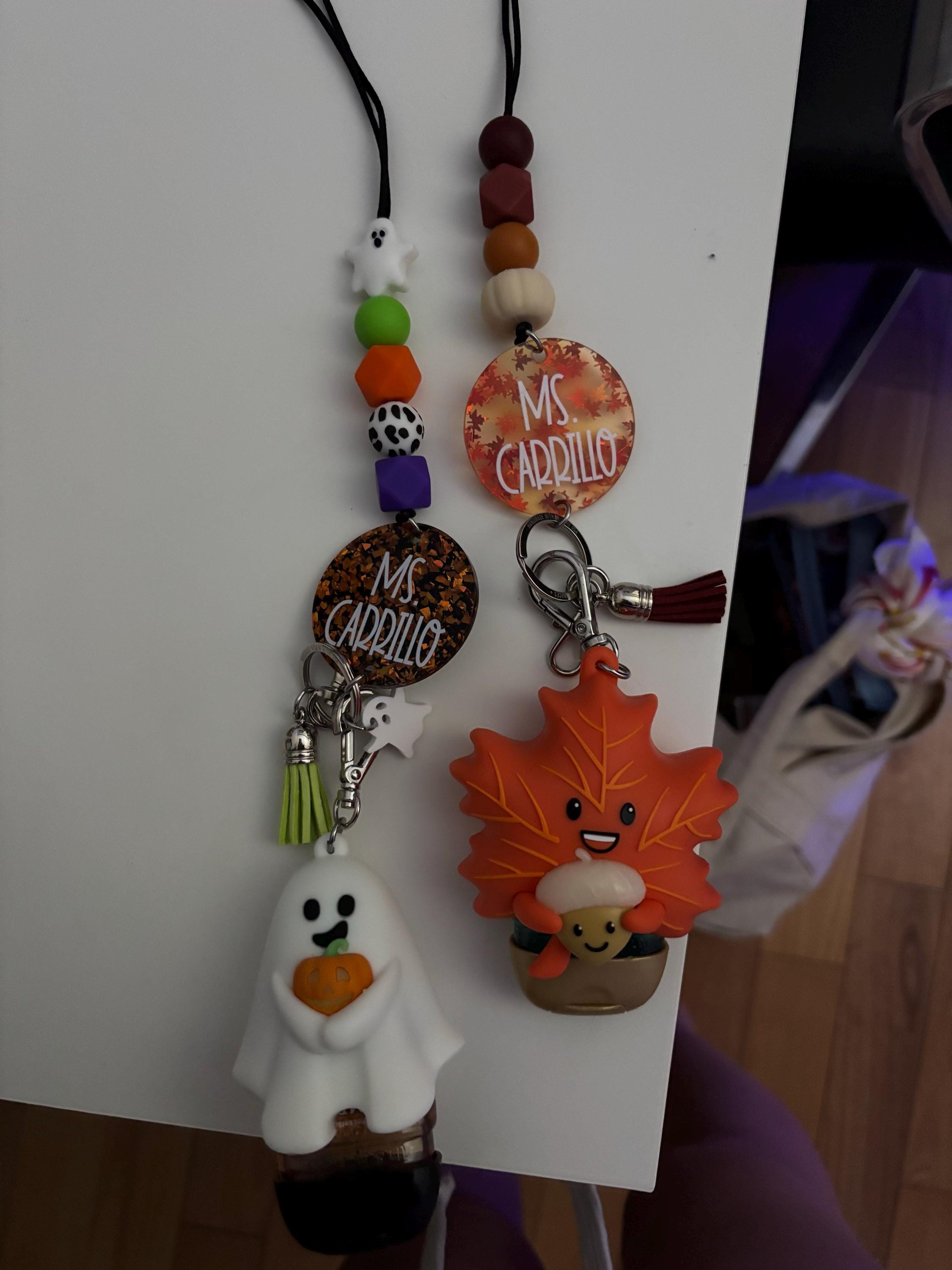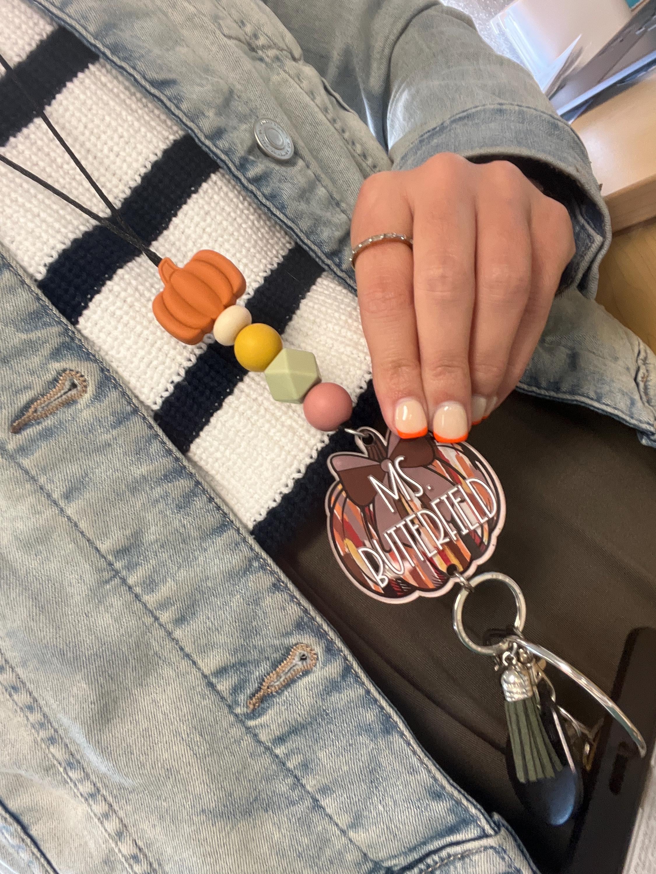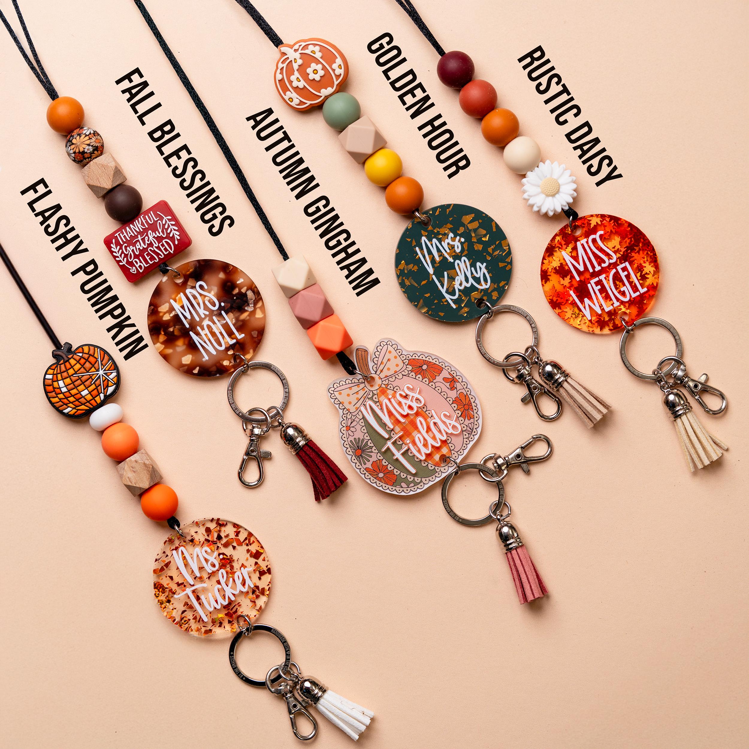 This adorable collection of teacher lanyards will get you in the fall mood! It sports an assortment of fall colors and features the cutest variety of fall focal beads, as if the colors alone weren't "fall" enough! There are two printed acrylic discs, two glitter acrylic disc, one wooden disc, and one leaf-filled acrylic disc.