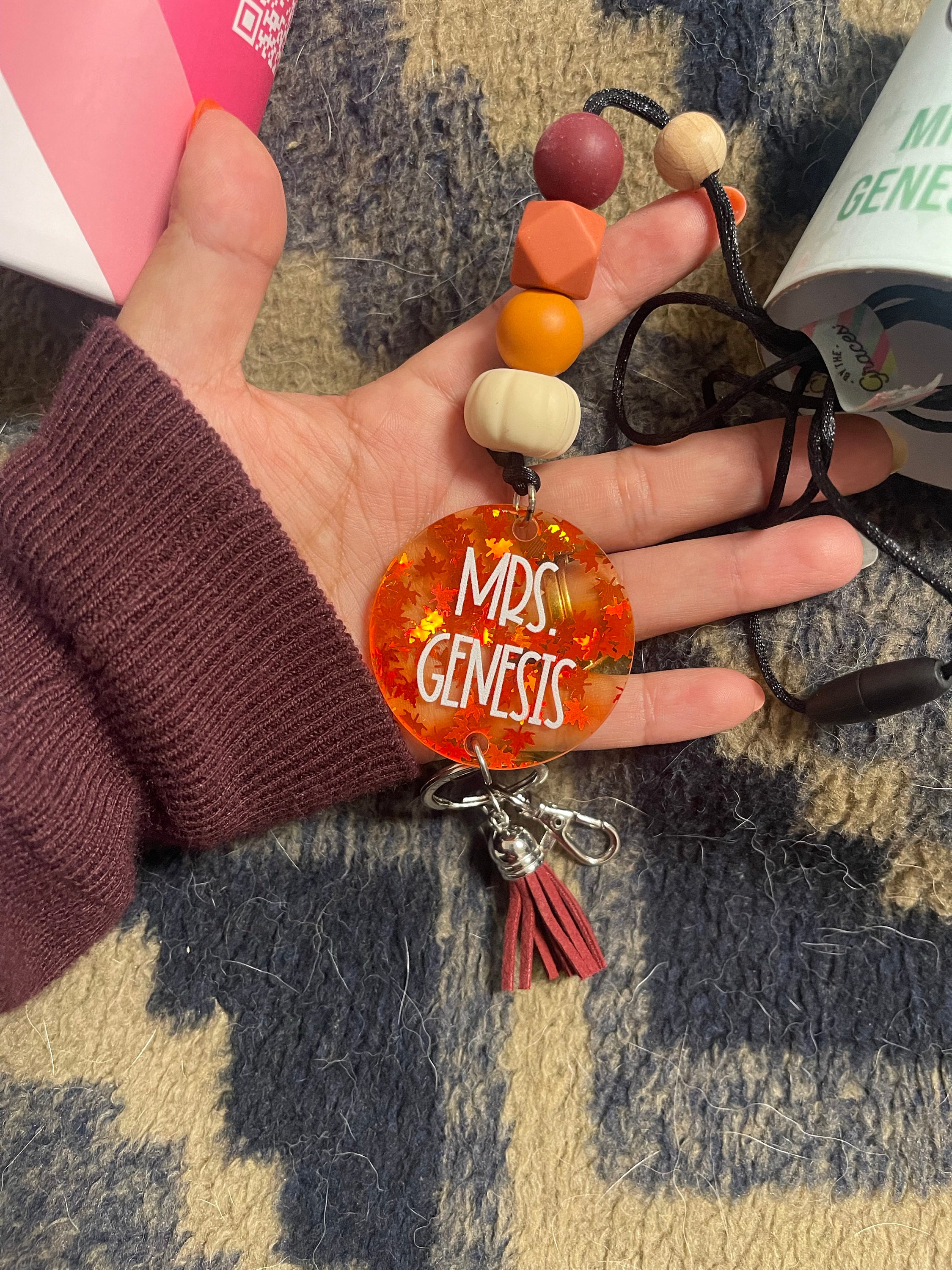 Materials: metal, paint, acrylic, wood, wooden beads, paracord, lobster clasp, beads, silicone beads