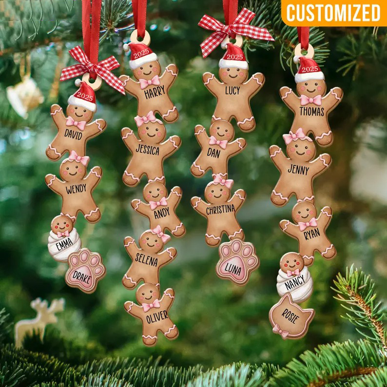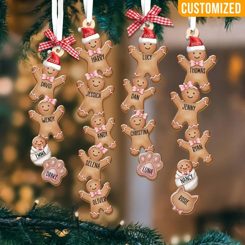 Celebrate the magic of Christmas with our fun Gingerbread Family Ornament, designed in a festive gingerbread house style! This unique keepsake features adorable gingerbread characters representing each family member (even pets ), personalized with names and fun snowfall effects, bringing your ornament to life.