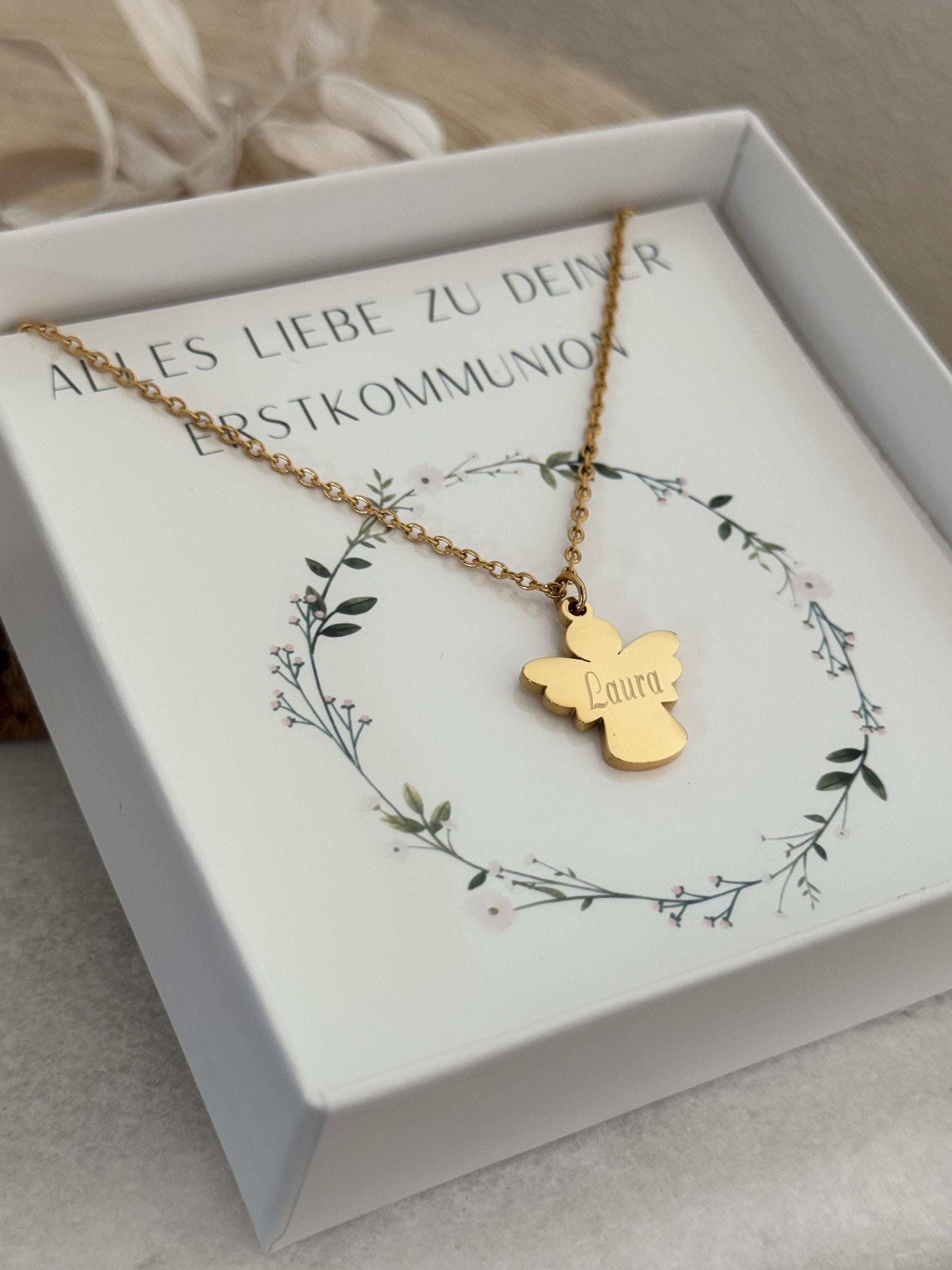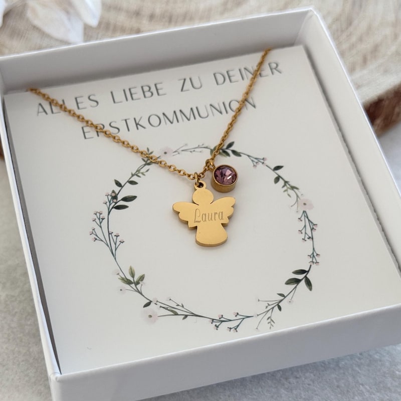 Beautiful necklace with a sparkling guardian angel pendant personalized with your desired engraving.
