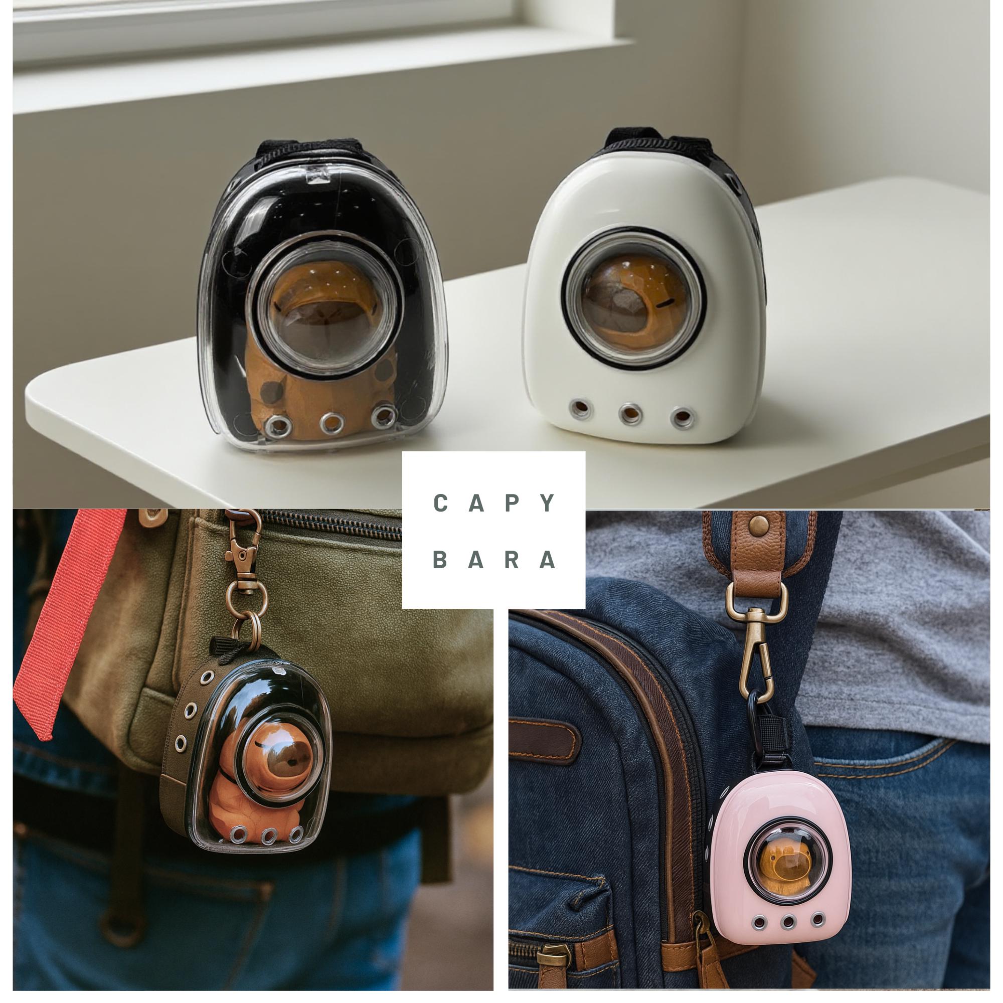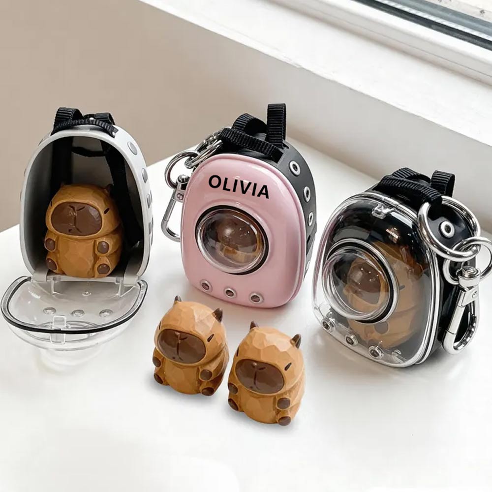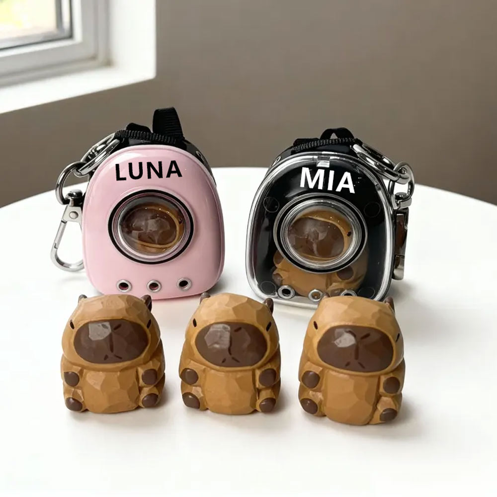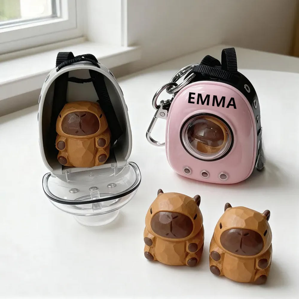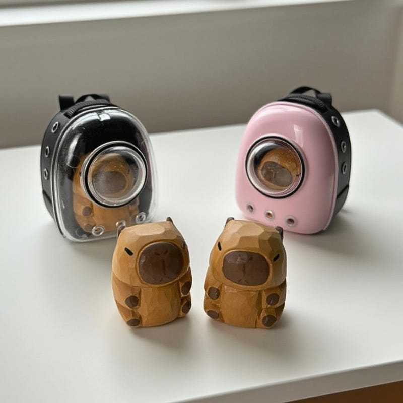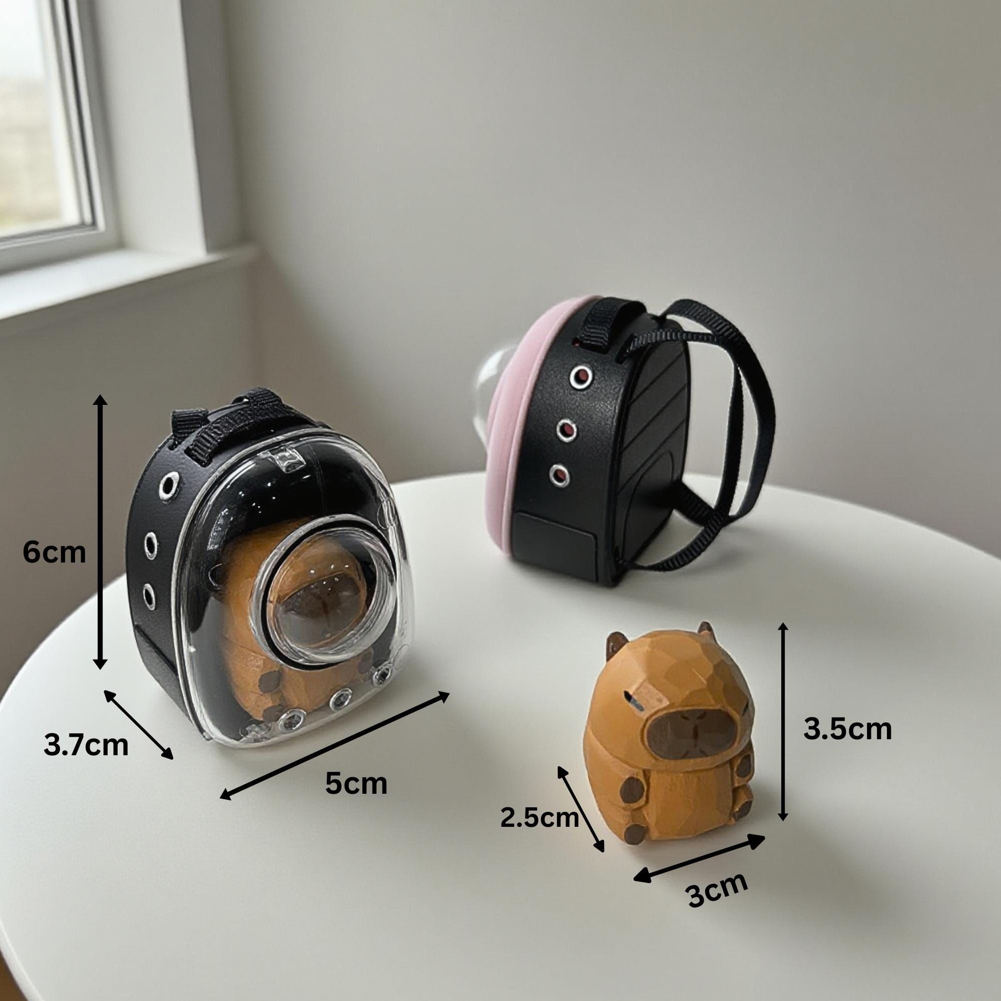 Bring a smile to your day with this hand-carved wooden capybara figurine, complete with a tiny pet space backpack!
