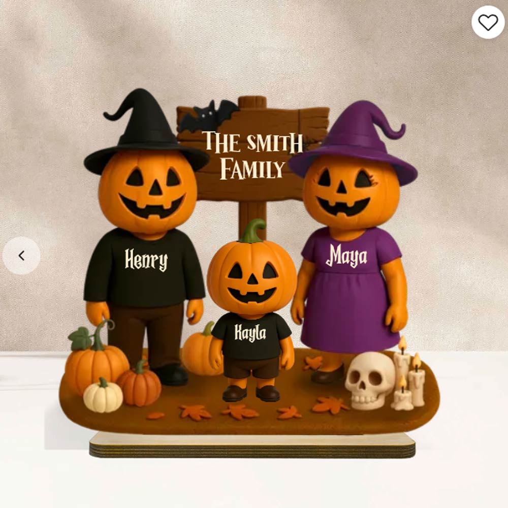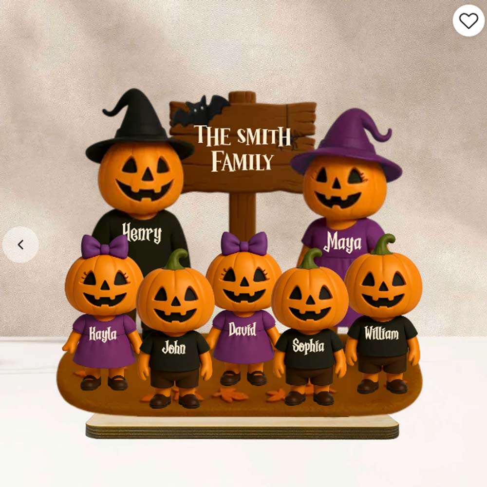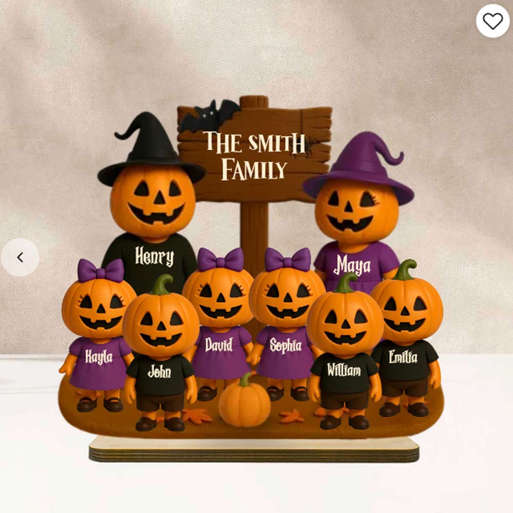 Spooky season just got a whole lot cuter! Our Jack O' Lantern Family 3D Effect Personalized Wooden Plaque is the perfect way to celebrate Halloween with your favorite little “boo crew.” Featuring an adorable lineup of grinning pumpkins — each one customized with a name — this standing plaque adds a playful, festive touch to any shelf, mantel, or entryway.
