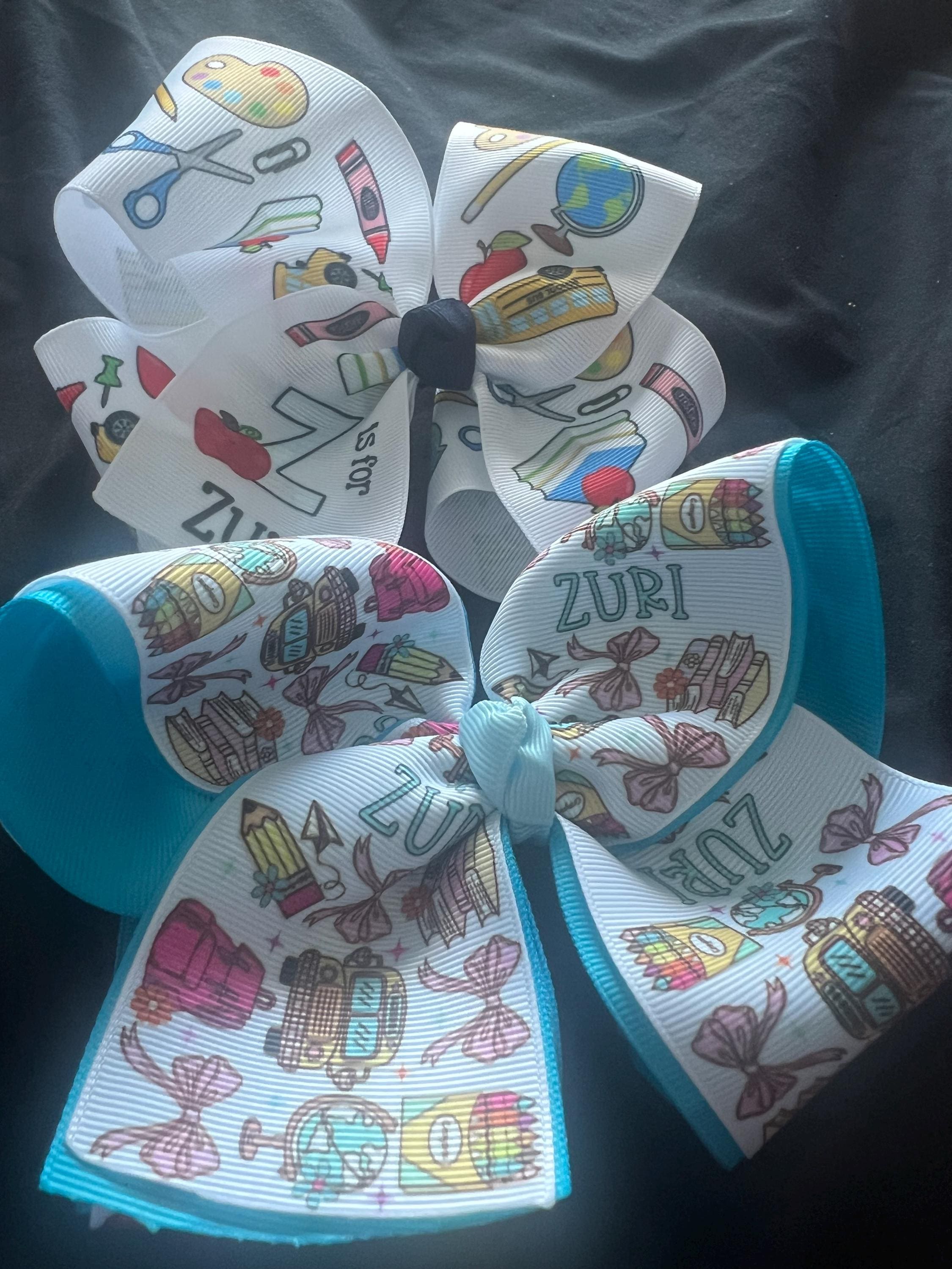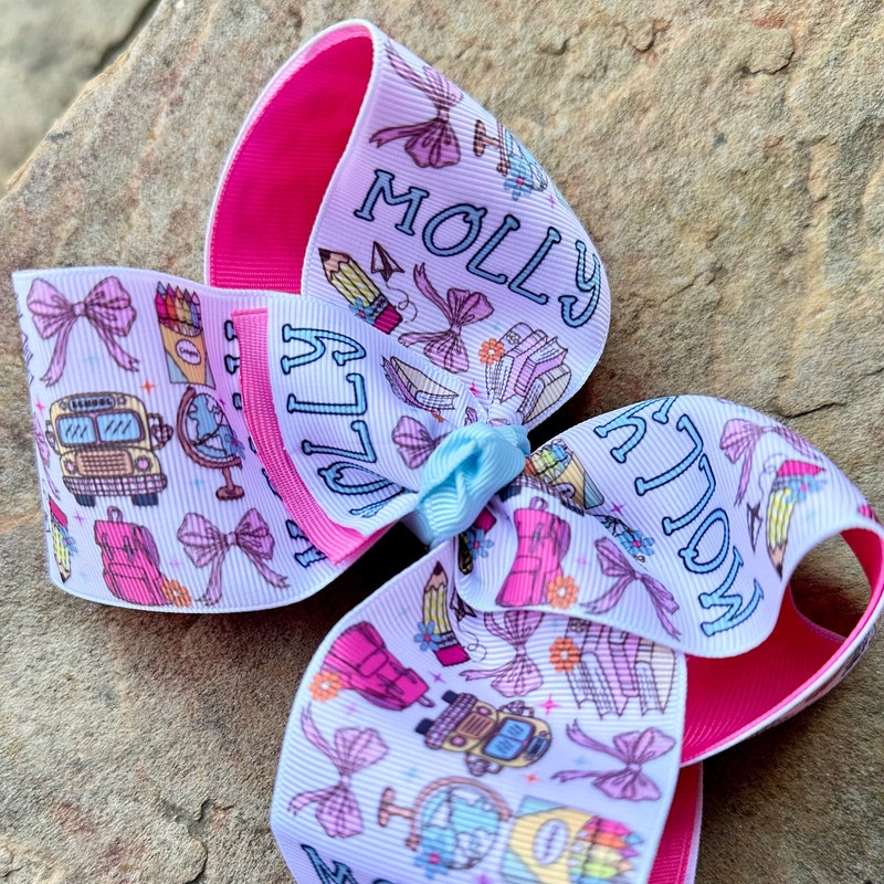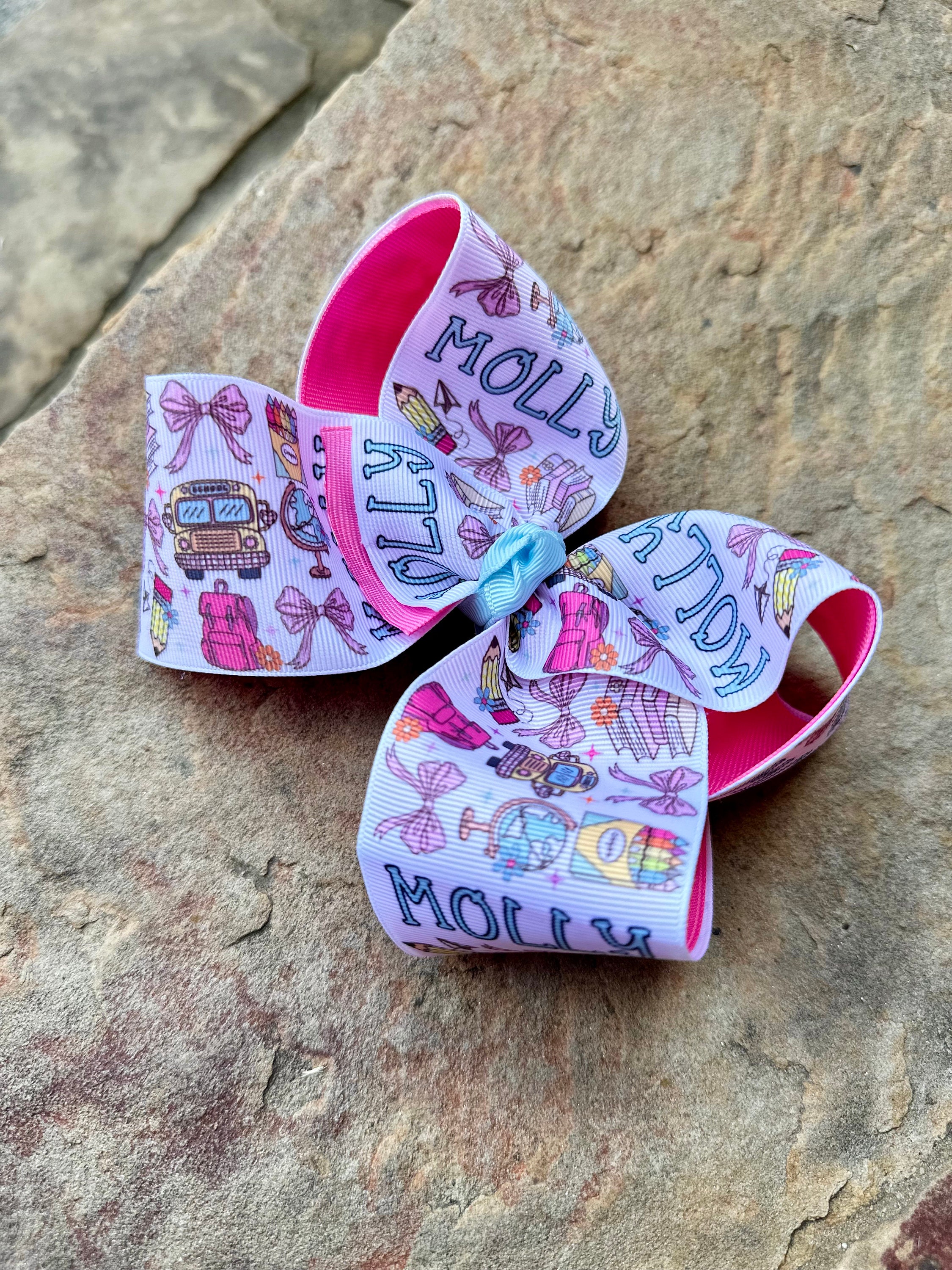This listing is for 1 large hair bow, personalized with your child's name and a school-themed coquette deisgn. This bow is perfect for your little girl’s back to school outfits and her first day of school!