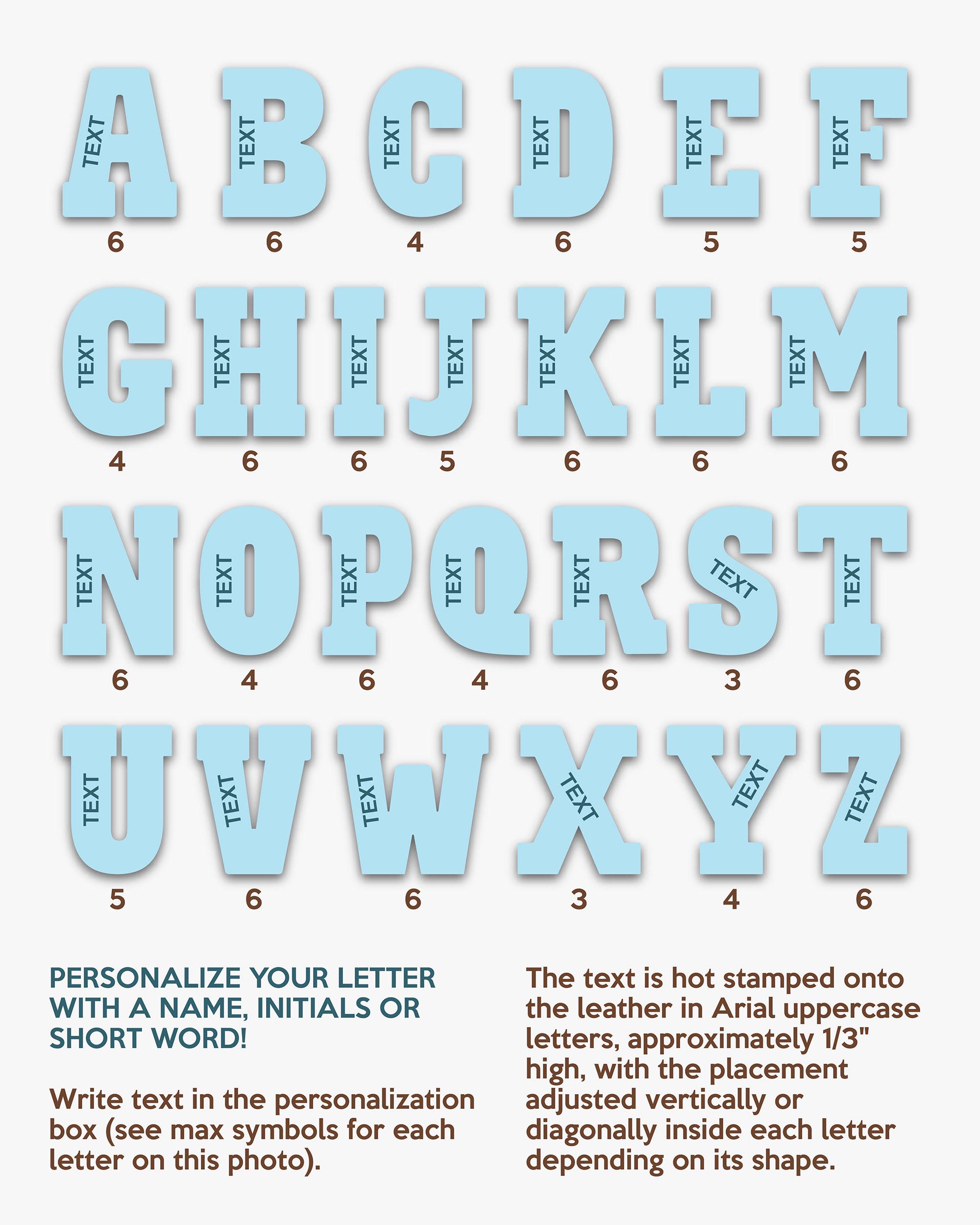 Size: All letters are approx. 3” (7.5 cm) tall, width varies by letter (1-3” / 2.5-7.5 cm)