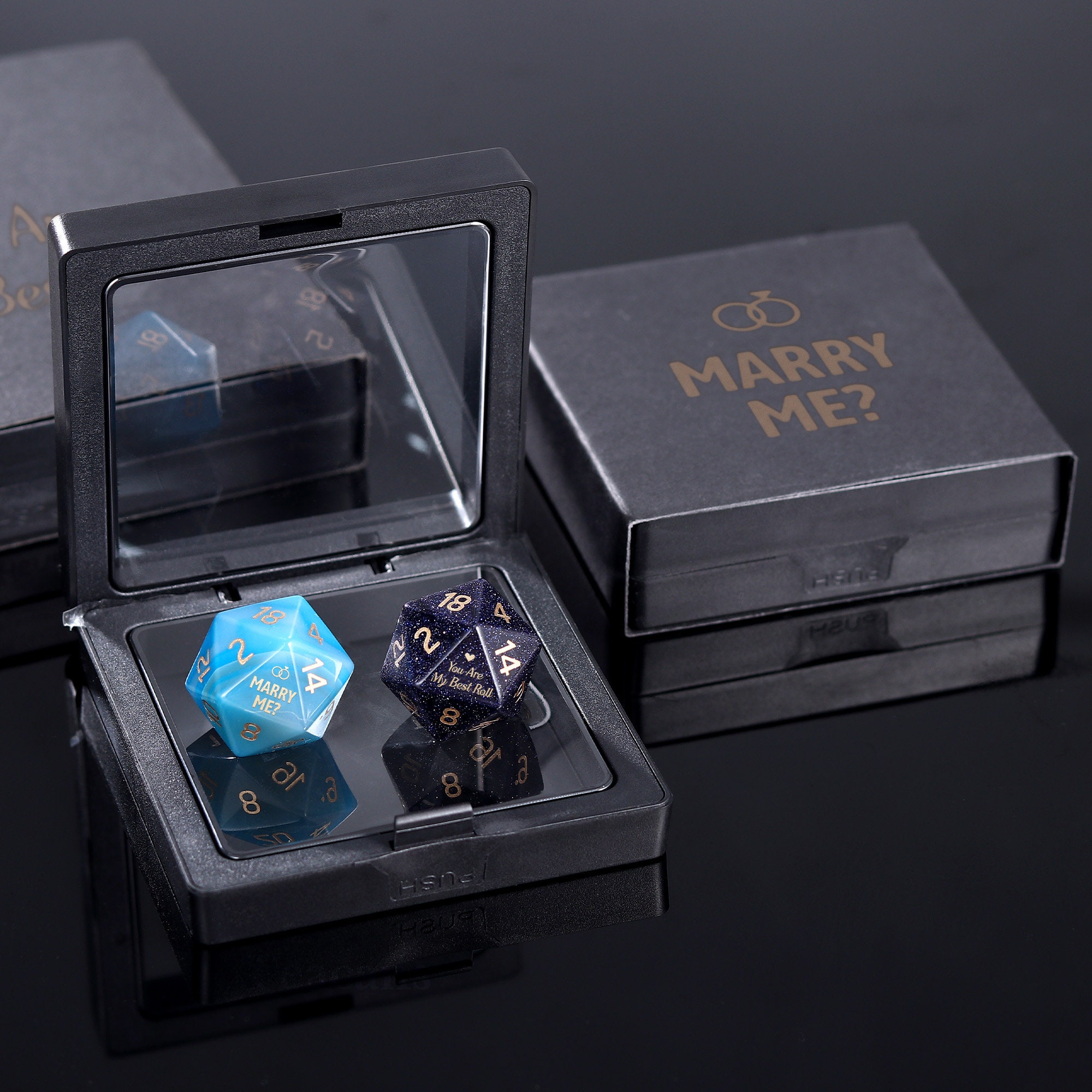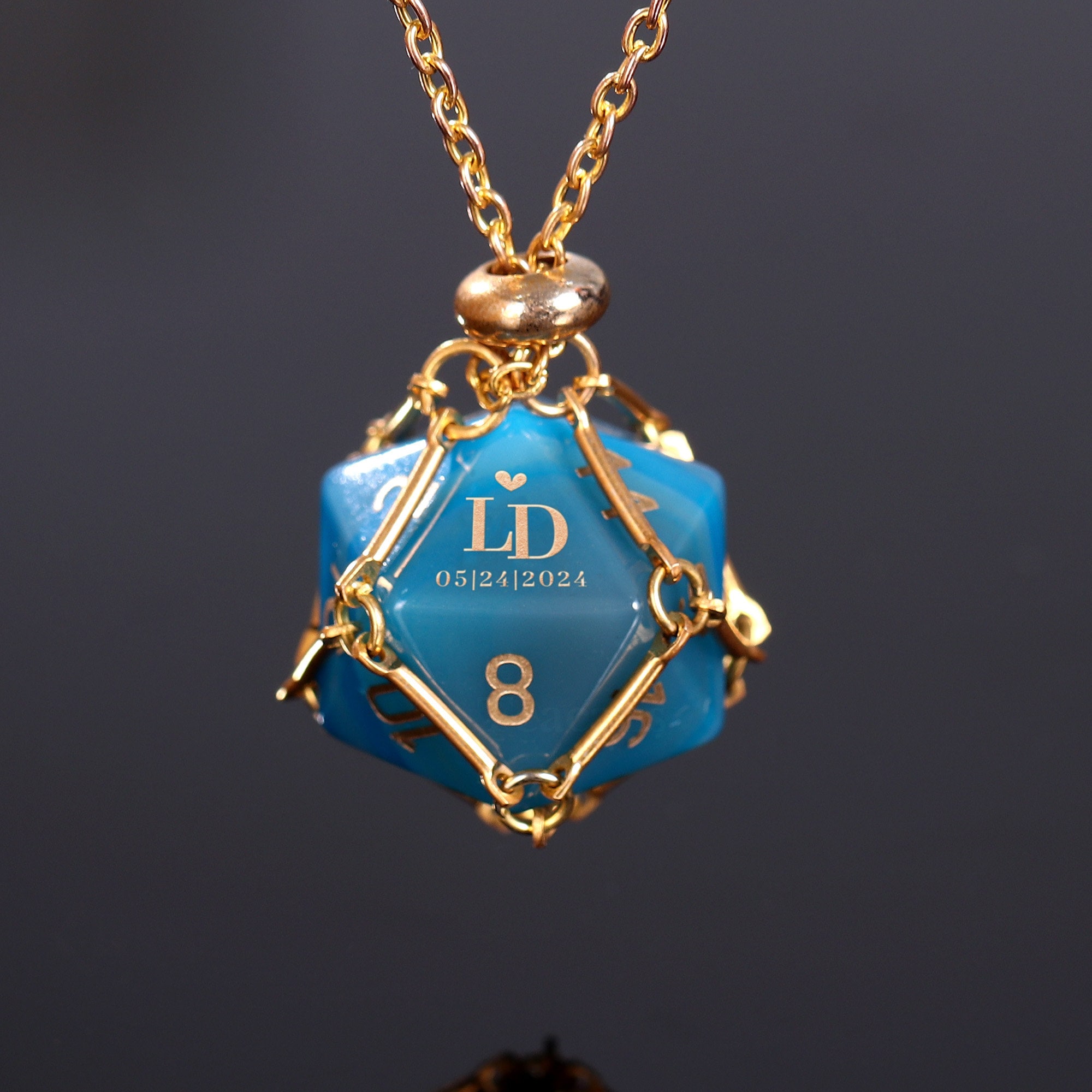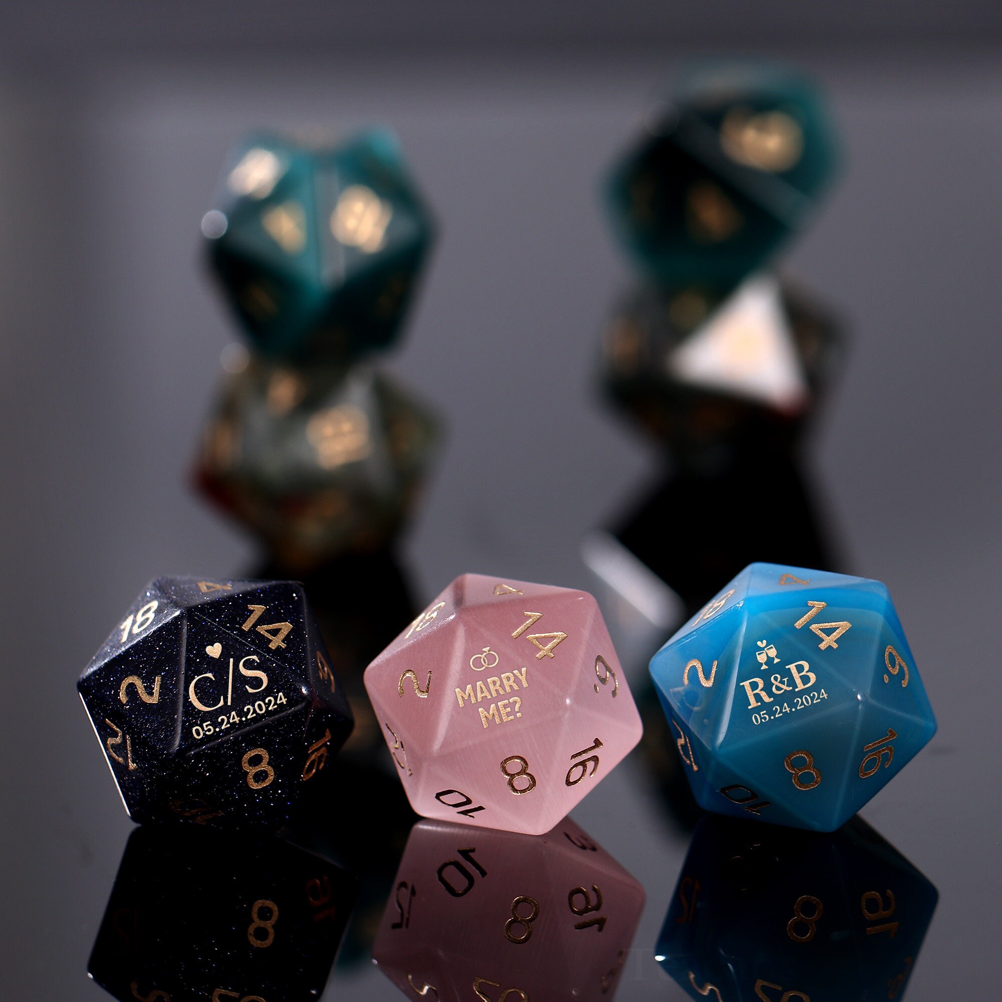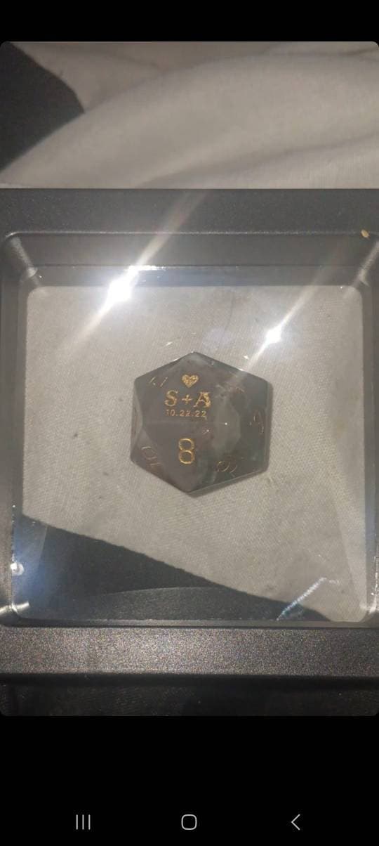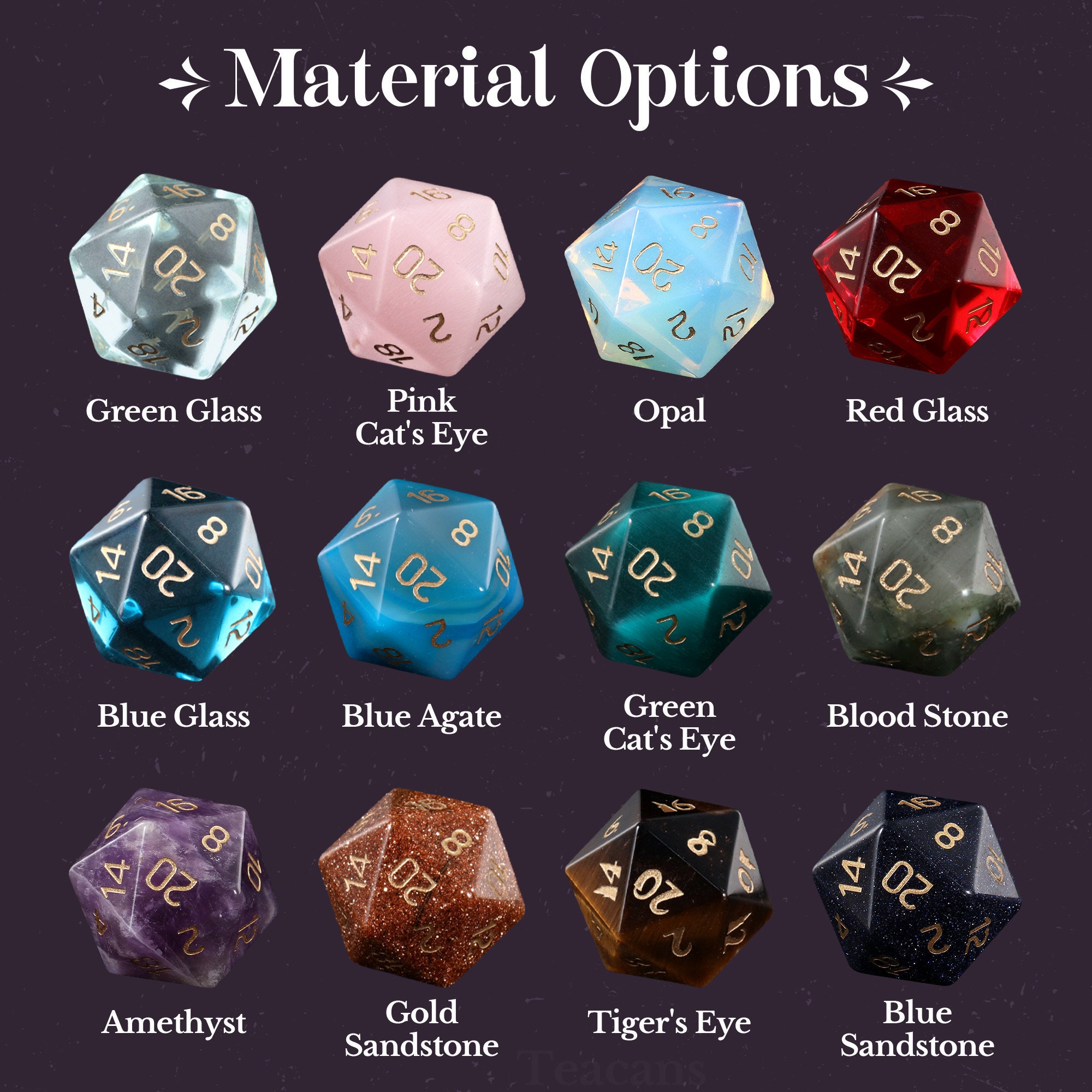 Made from stunning materials like opal, amethyst, and Cat's Eye, each die is intricately engraved. Handle with care, as they are delicate and fragile.