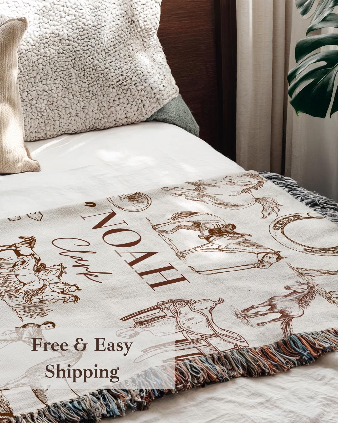 Transform your nursery with this personalized baby blanket featuring a charming western horse and horseshoe design, perfect for creating custom nursery bedding that's both stylish and cozy. This cotton cowboy quilt doubles as a beautiful western horse throw with its monogrammed equestrian design, making it an ideal gift complete with elegant fringe details.