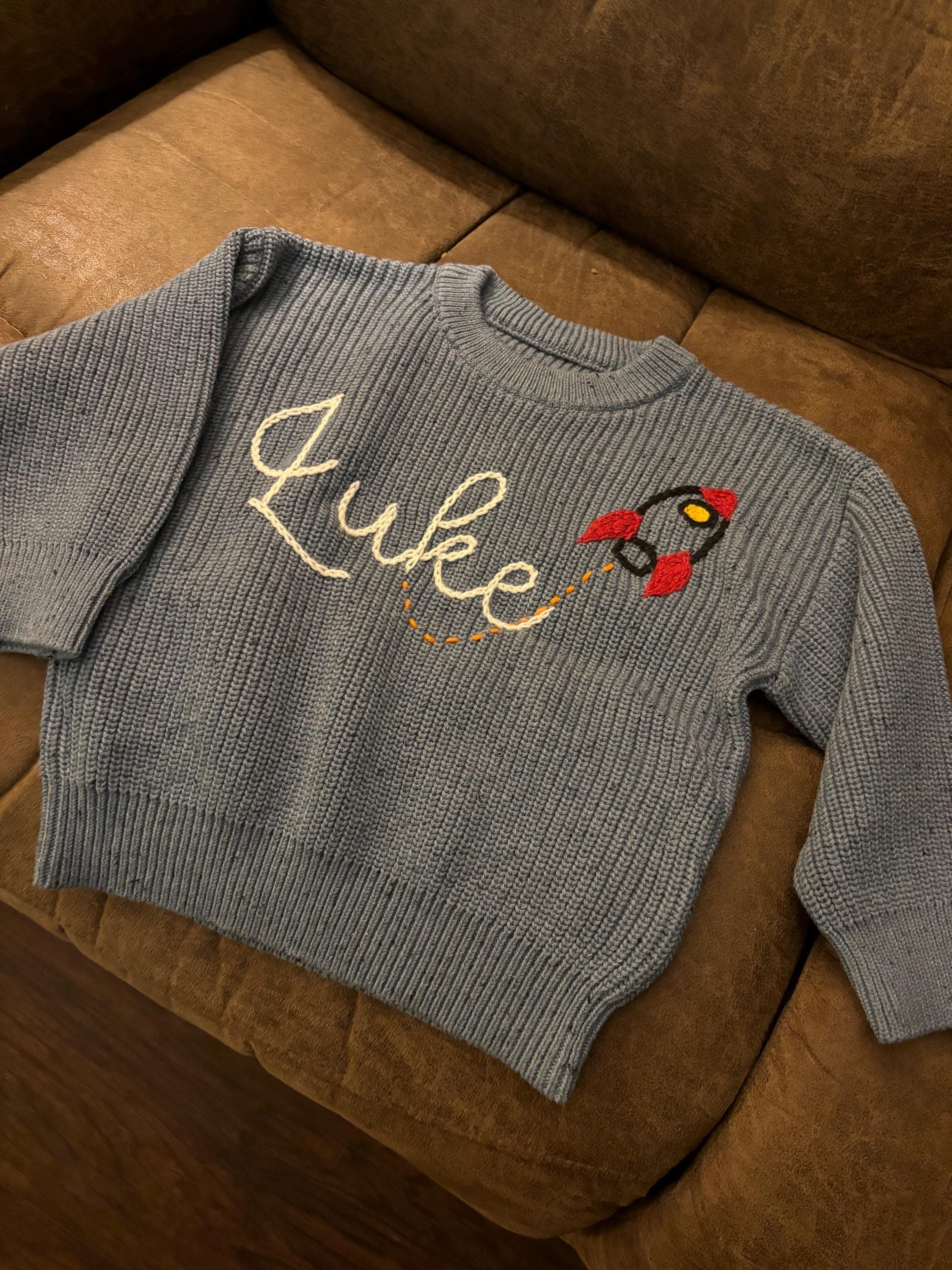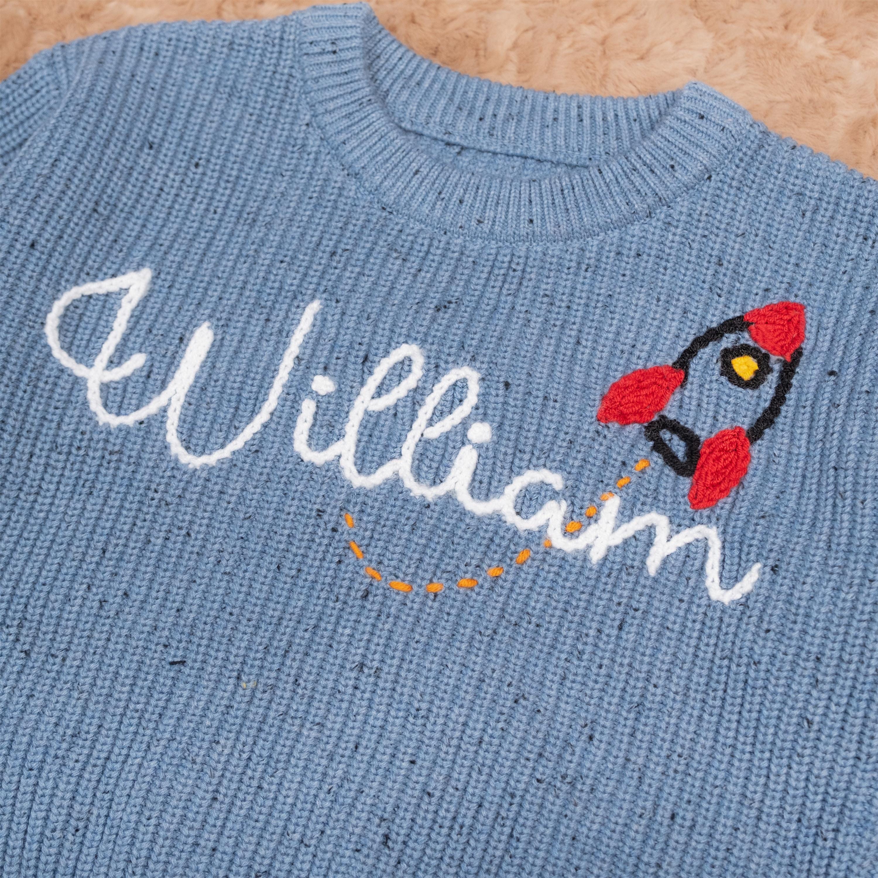 ✨ If you are looking for a cute and practical gift for a new family member, this customized baby sweater is a good choice. This is an elaborate baby sweater for your baby, each sweater is carefully embroidered by hand, the embroidered baby name on the chest and cute cartoon rocket design add personality and fun to this sweater.