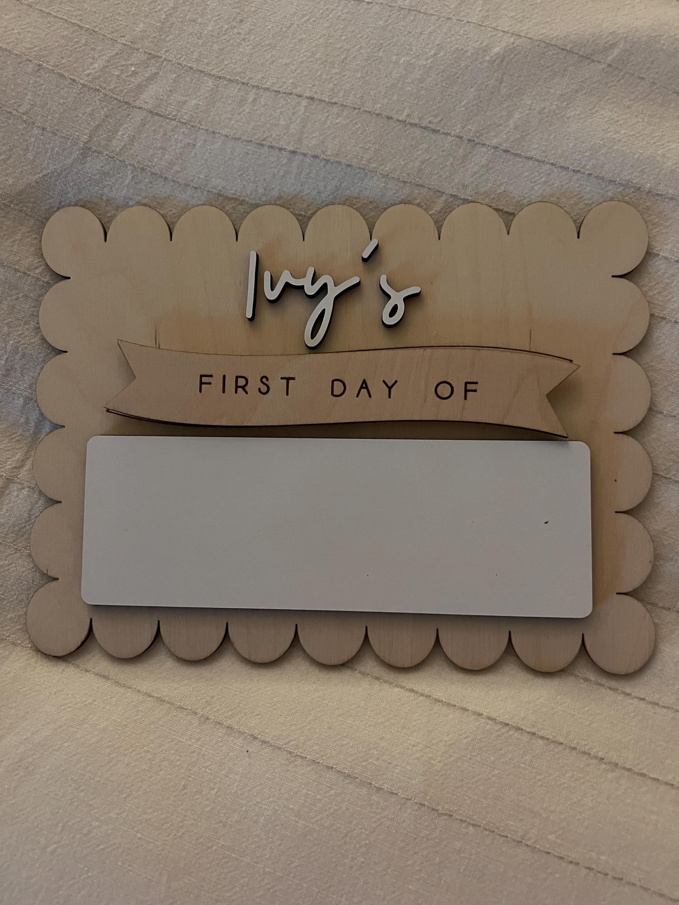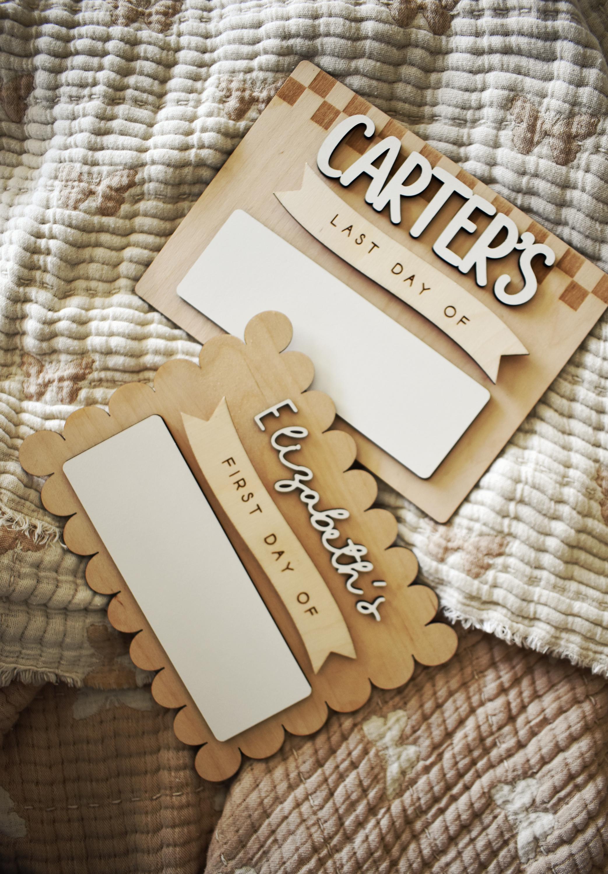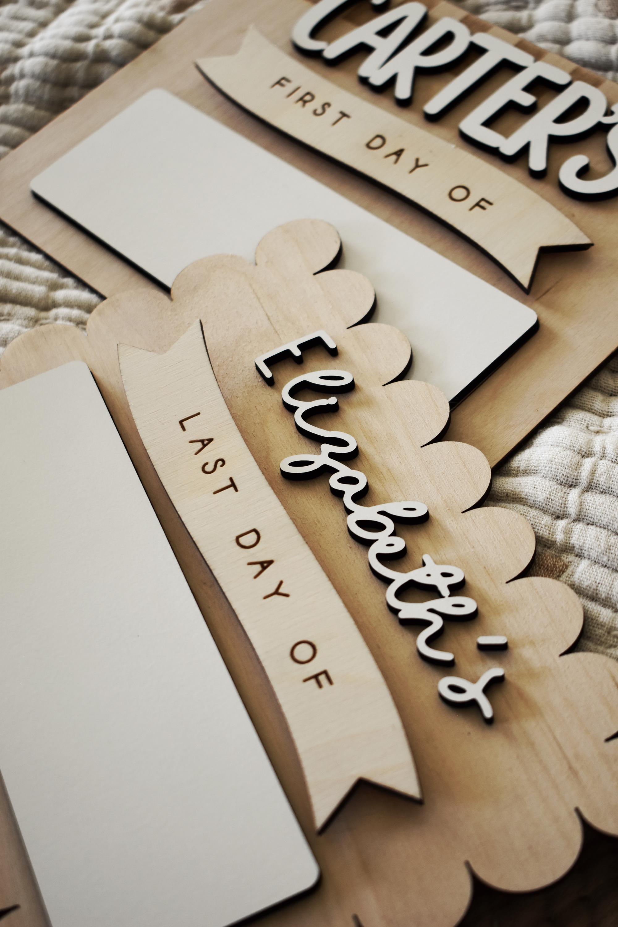 Includes TWO interchangeable wooden banners: “First Day Of” and “Last Day Of” (velcro-attached)