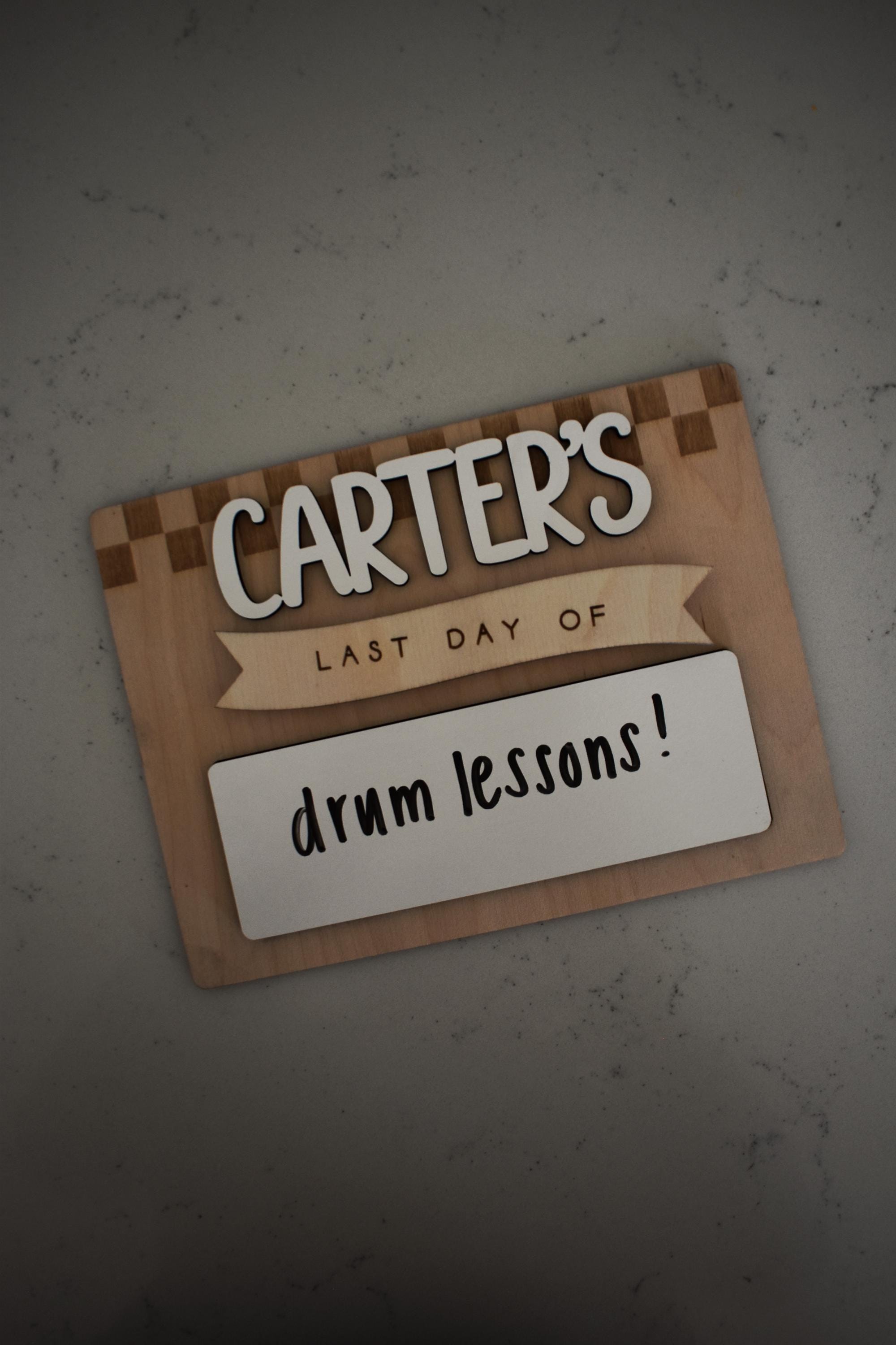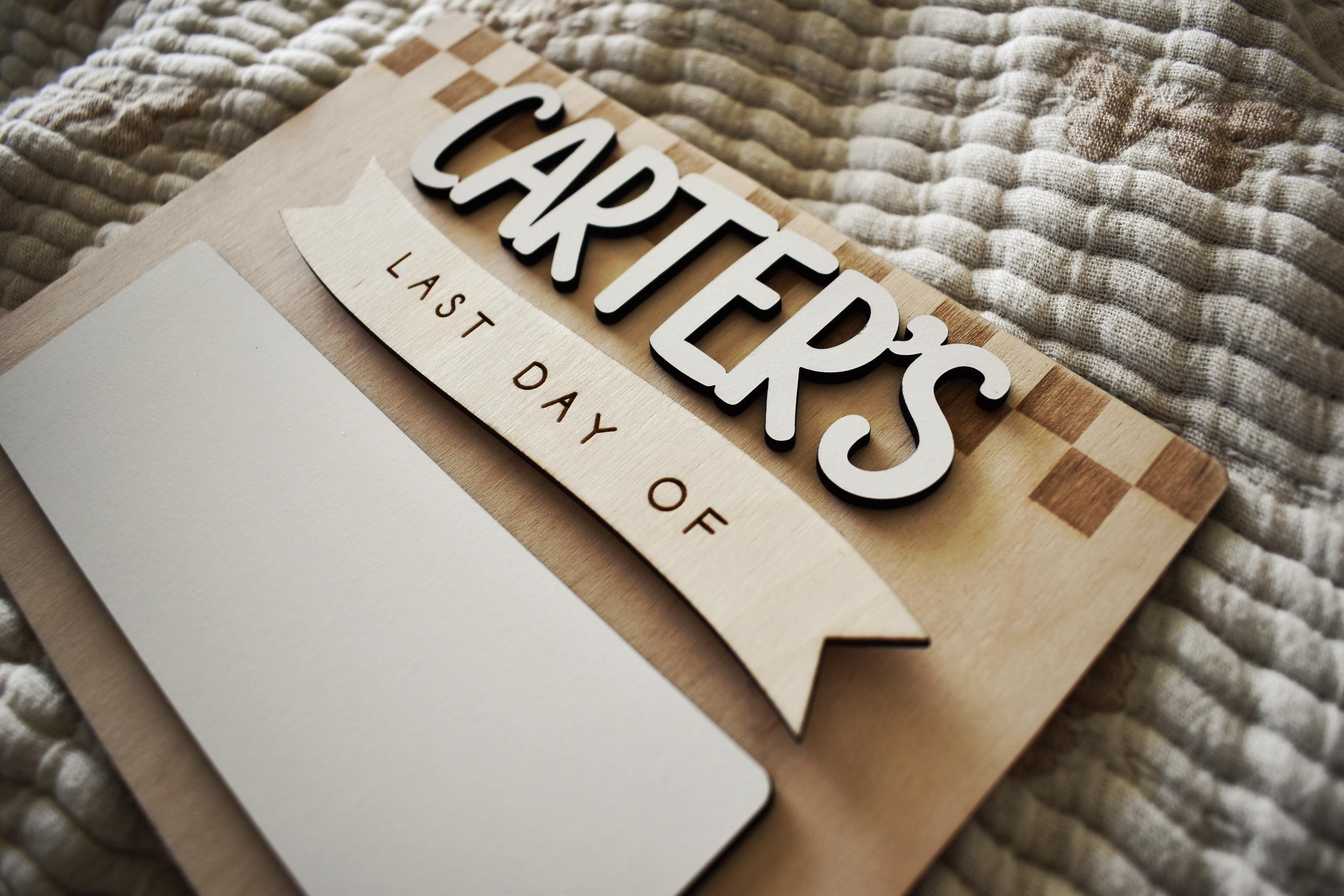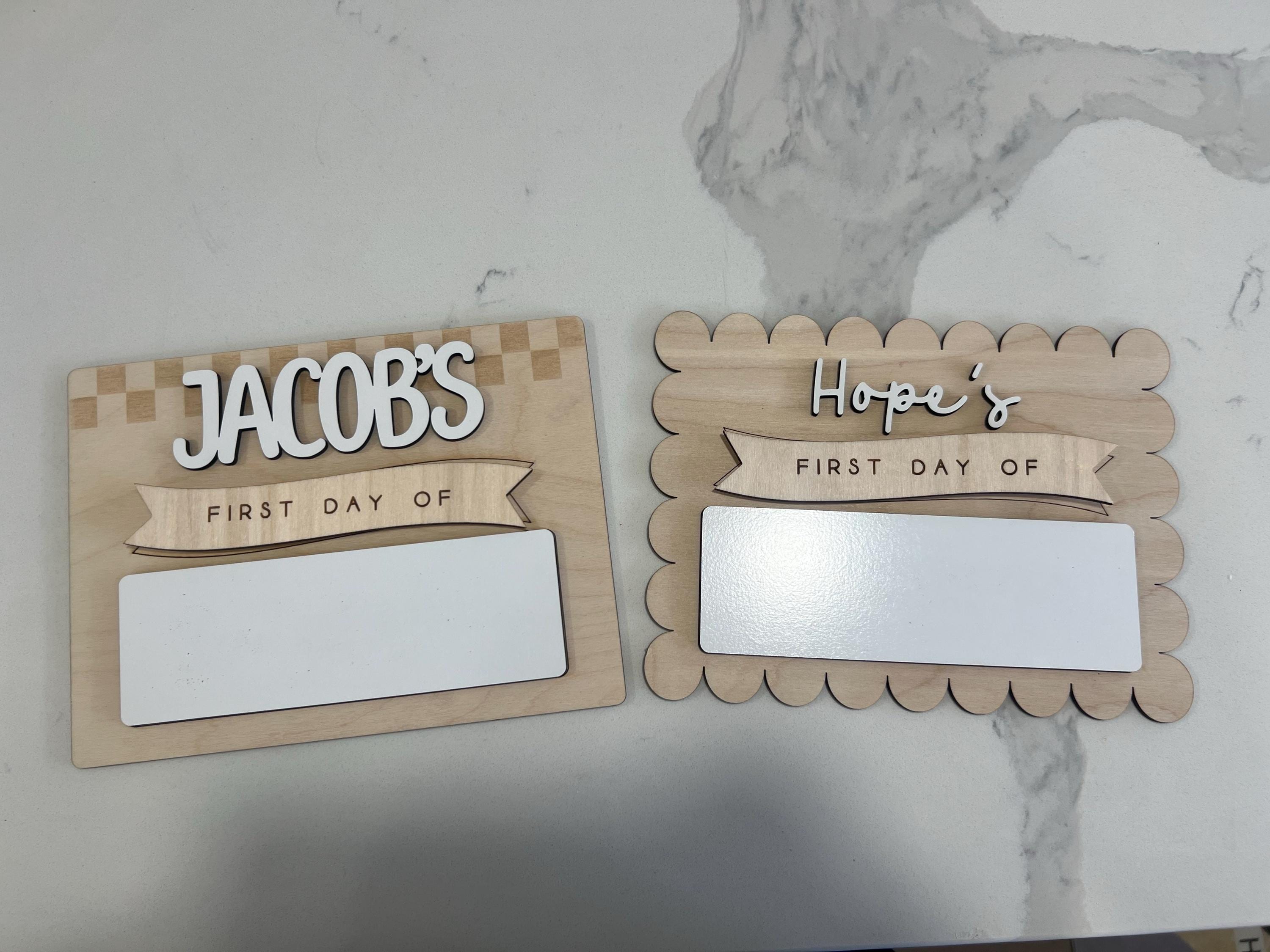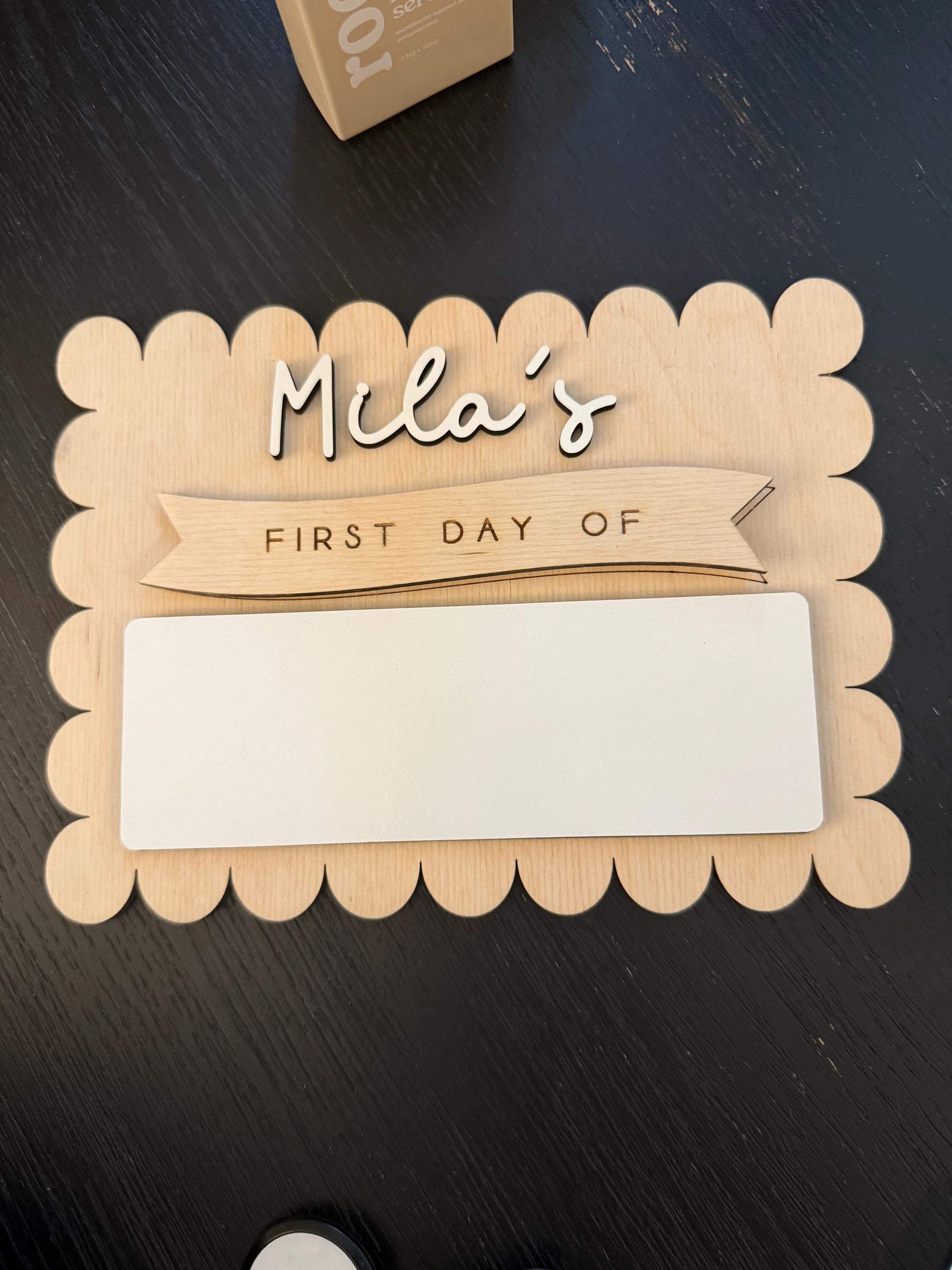 Includes TWO interchangeable wooden banners: “First Day Of” and “Last Day Of” (velcro-attached)