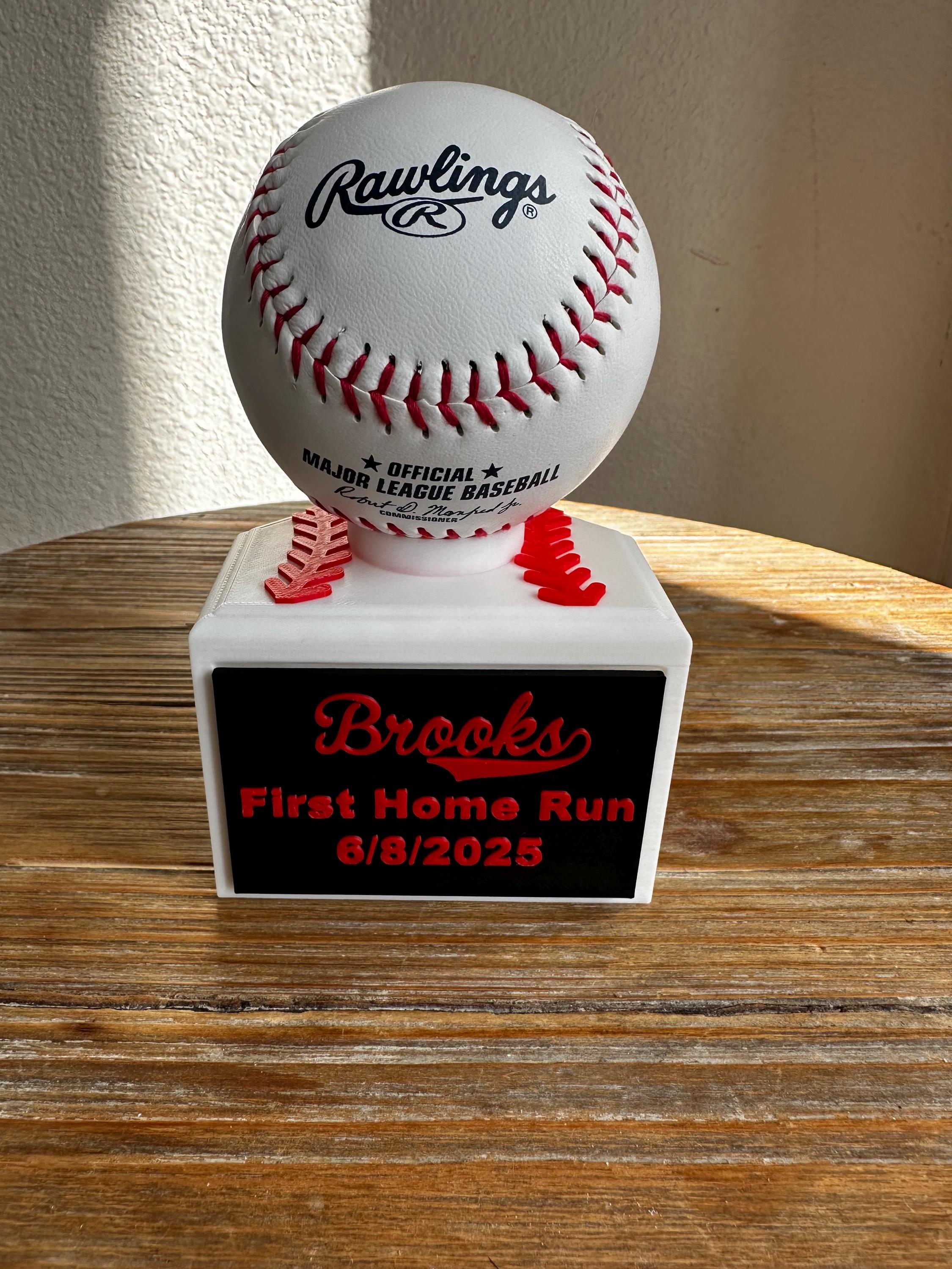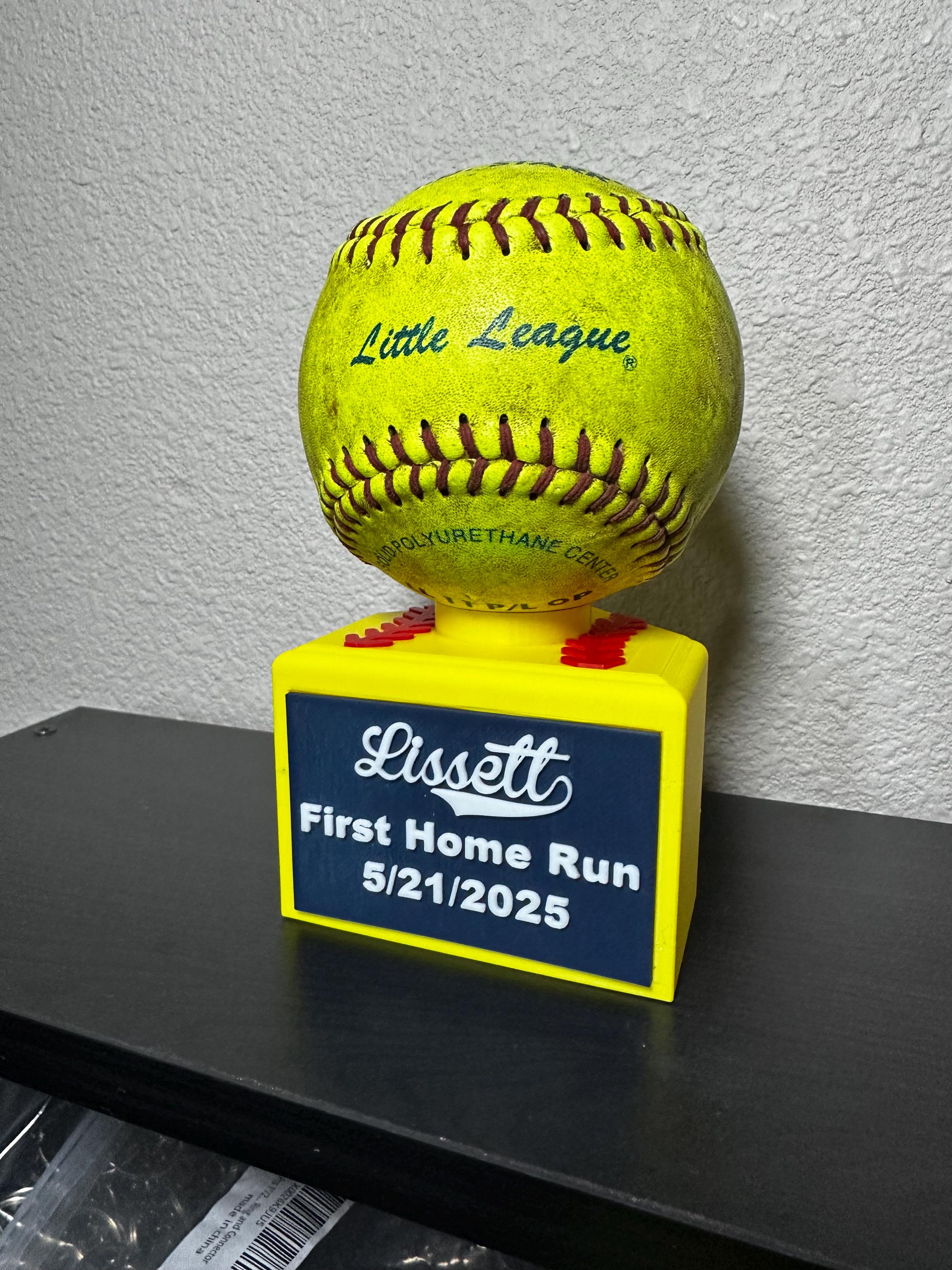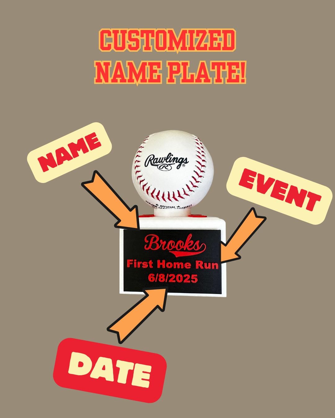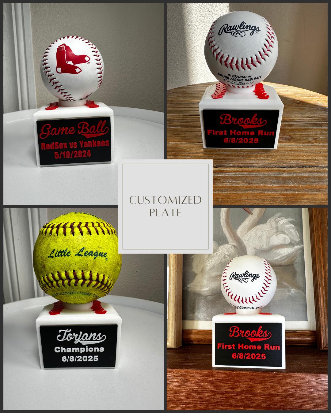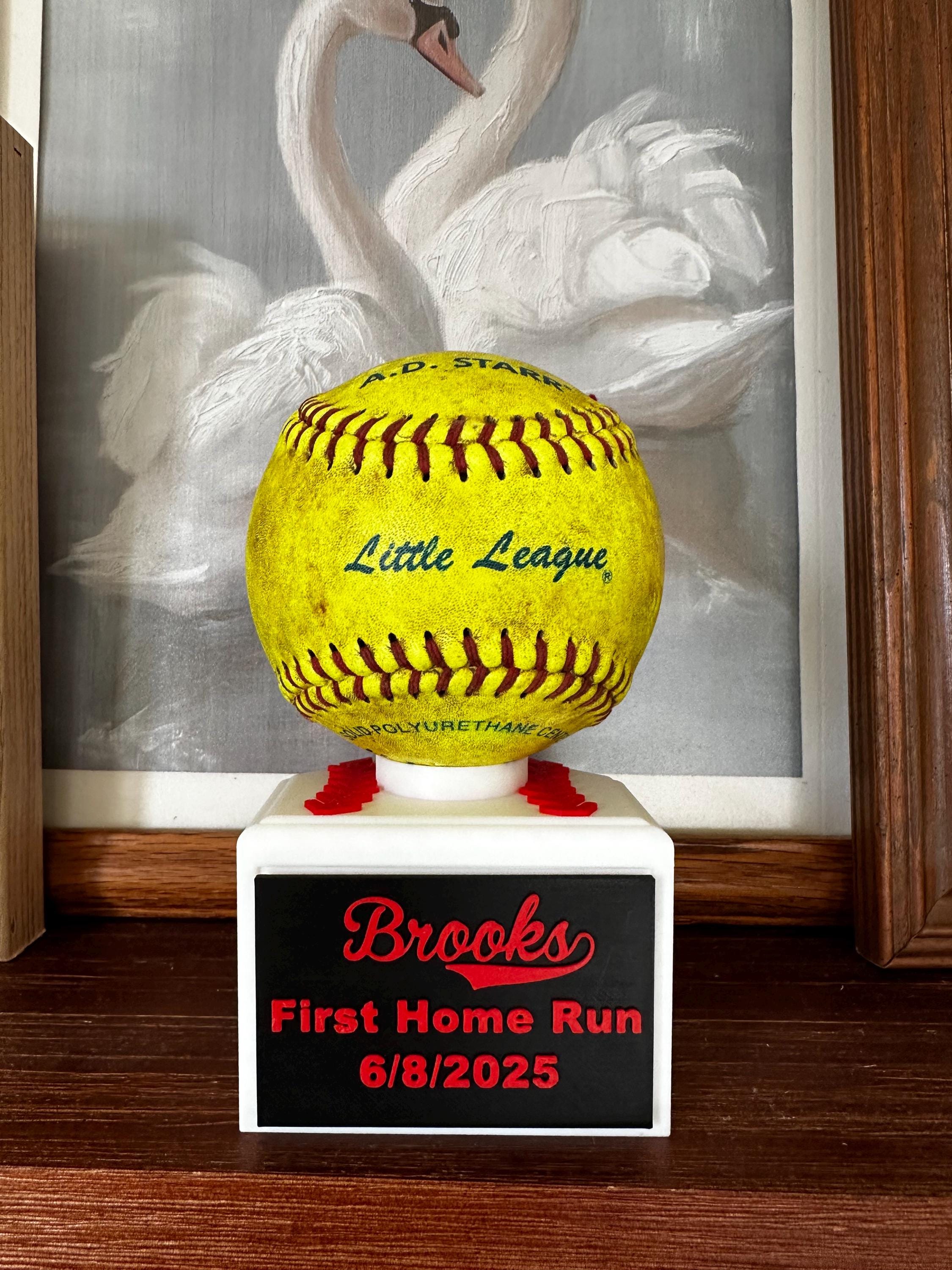 Showcase your baseball or softball milestones with our customizable trophy stand, the perfect way to display your first home run, no-hitter, championship game, or any unforgettable moment on the field! This sleek and sturdy stand is designed to securely hold your game ball while featuring a personalized nameplate, making it a meaningful keepsake for players, coaches, or proud parents.
