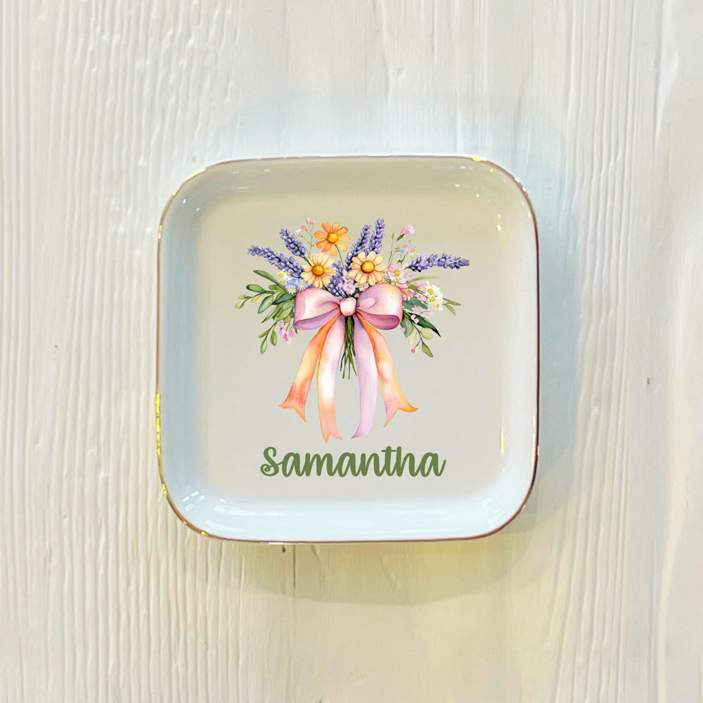 Discover a perfect blend of function and elegance with this personalized bow ring dish. Its delicate watercolor design features a beautifully rendered, fancy bow, creating a truly artistic piece.