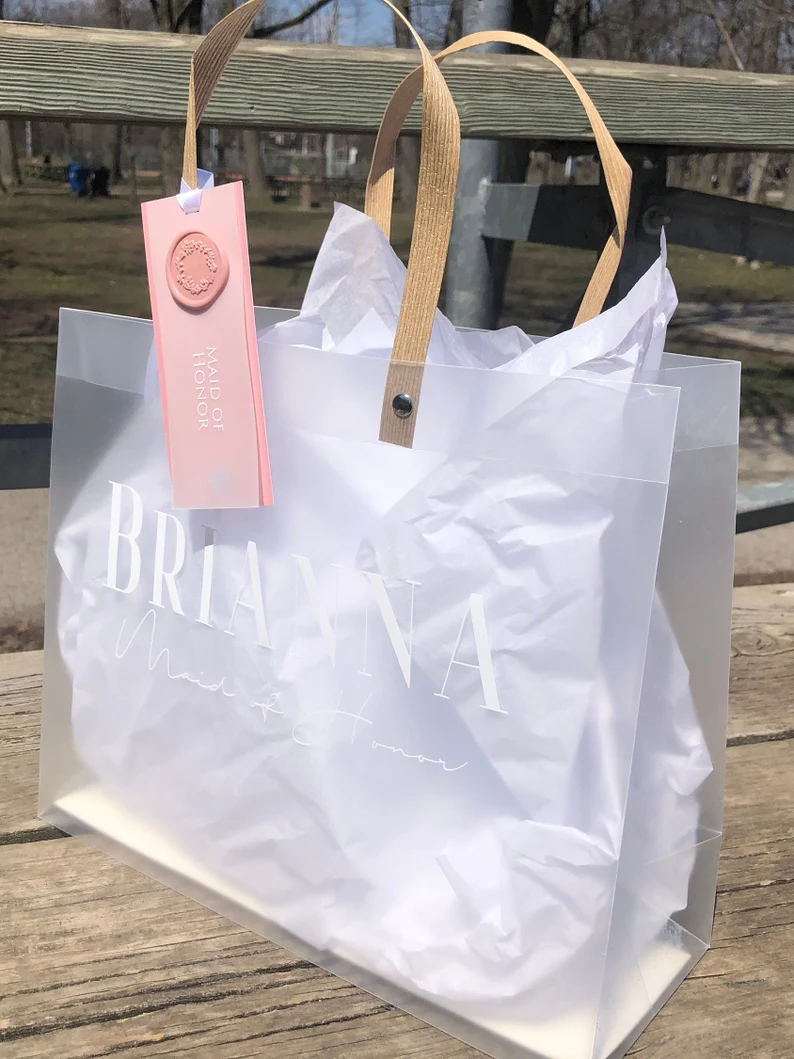 Customized bridesmaid proposal gift bags. These frosted gift bags can be used for bridesmaid thank you gifts, wedding favor bags, bachelorette party favor bags, wedding party thank you gift bags or even as a welcome package gift bag for your wedding guests. Made from a high quality, re-useable frosted gift bag. These gift bags are a great way to propose to your bridesmaids, give out bachelorette party favours or a special thank you for being in my wedding party gift. Each bag comes customized with your preferred design, either script or bold font. Available in a variety of font colours to match your wedding party colour scheme, check the name colour drop down menu for all available font colour options. Available with both white and baby pink tissue. Each bag comes with hand-made gift tags with their title in your wedding and wax seal on vellum with a beautiful pink pearlized card stock backing.