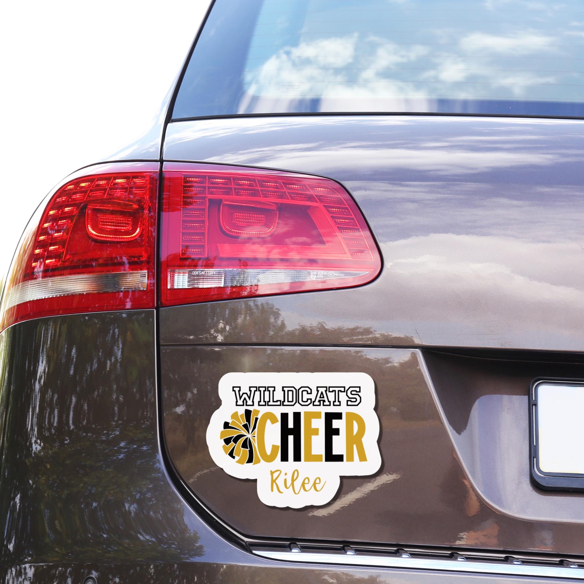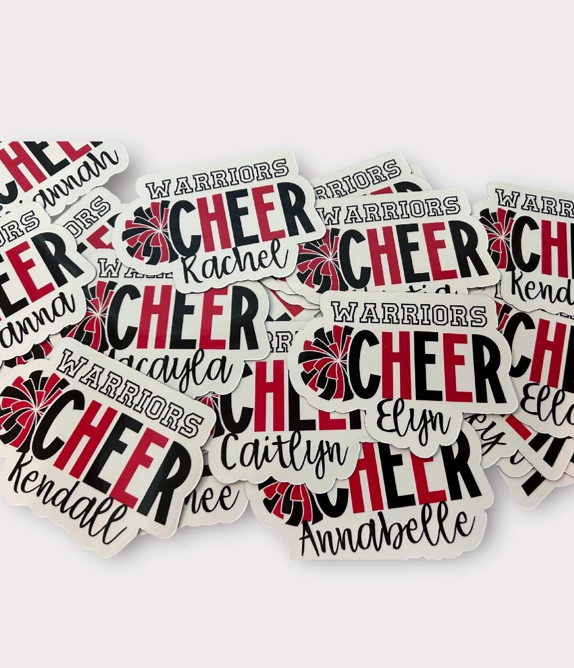 Personalized cheer sticker or locker magnet, customized with your team name and player name. Choose your colors to match high school cheer, competitive cheer, or any sports team. These waterproof stickers and waterproof magnets are great for athletes, a team mom, or fans who want to show support. They make a fun gift for cheer, a thoughtful sports team gift, or a special cheer team gift for a cheer comp decal. Use them as a cheer decal for your locker, a sports magnet for your fridge, or a cheer car magnet. Perfect for notebooks, laptops, water bottles, and more.