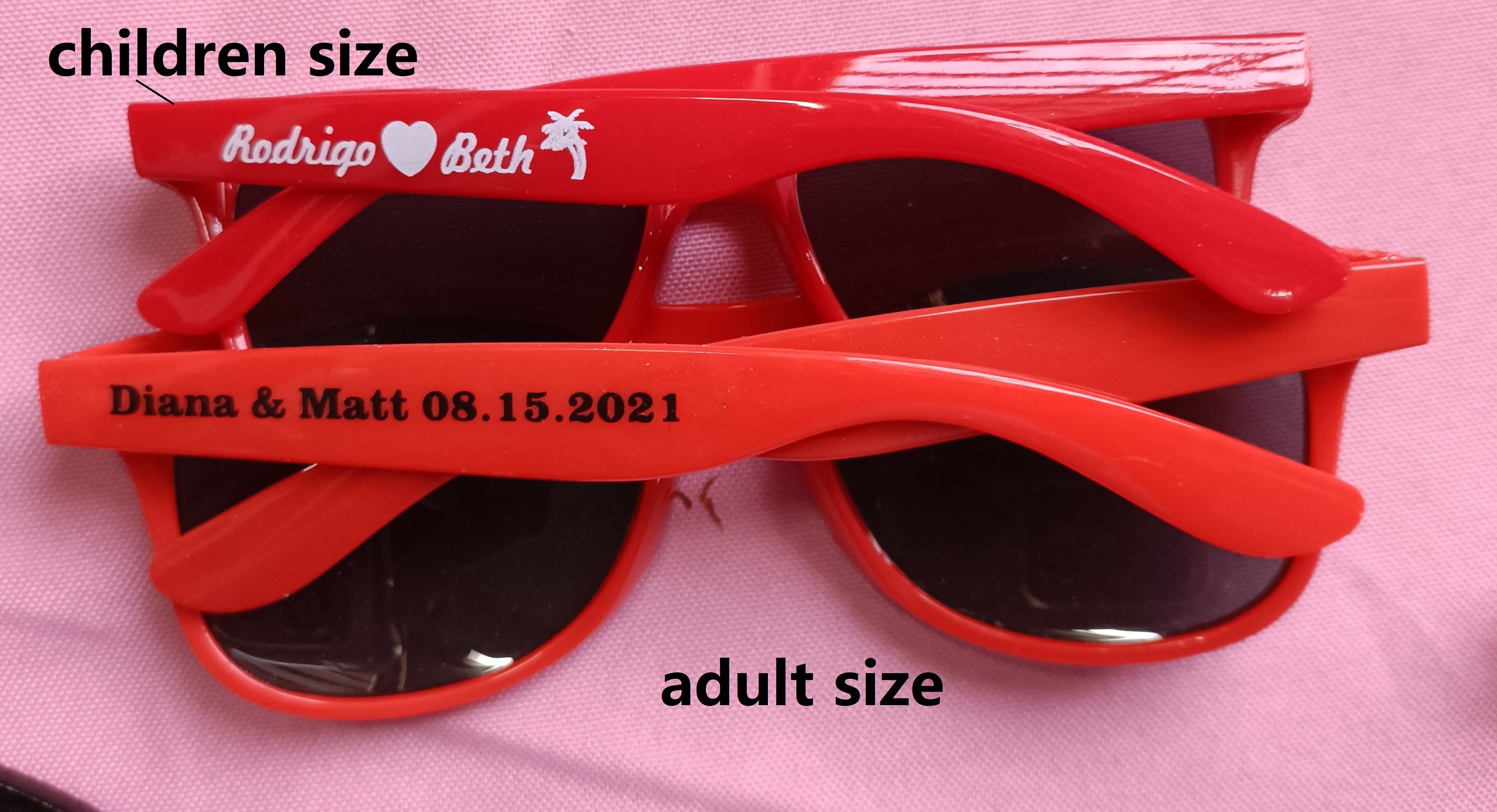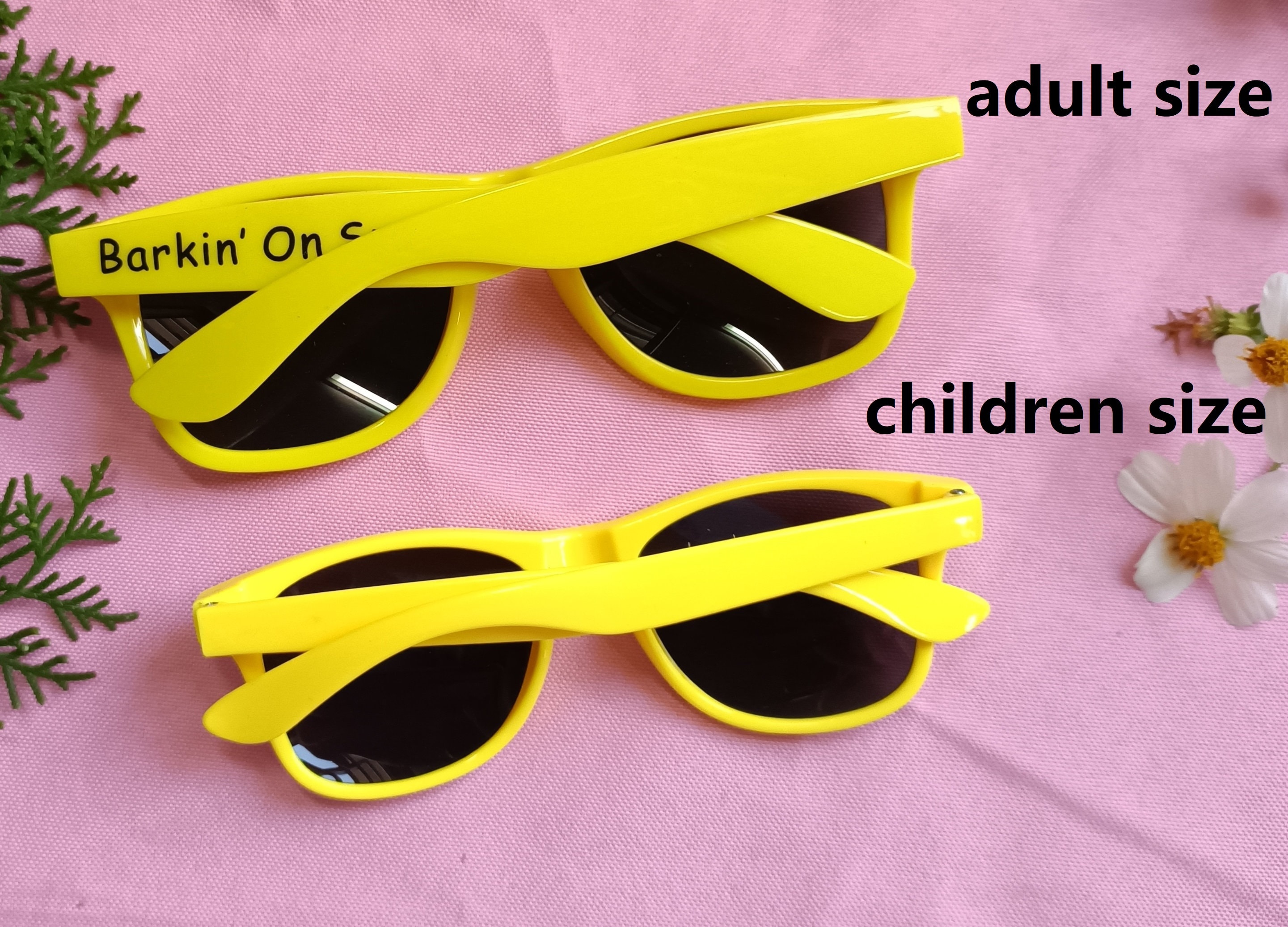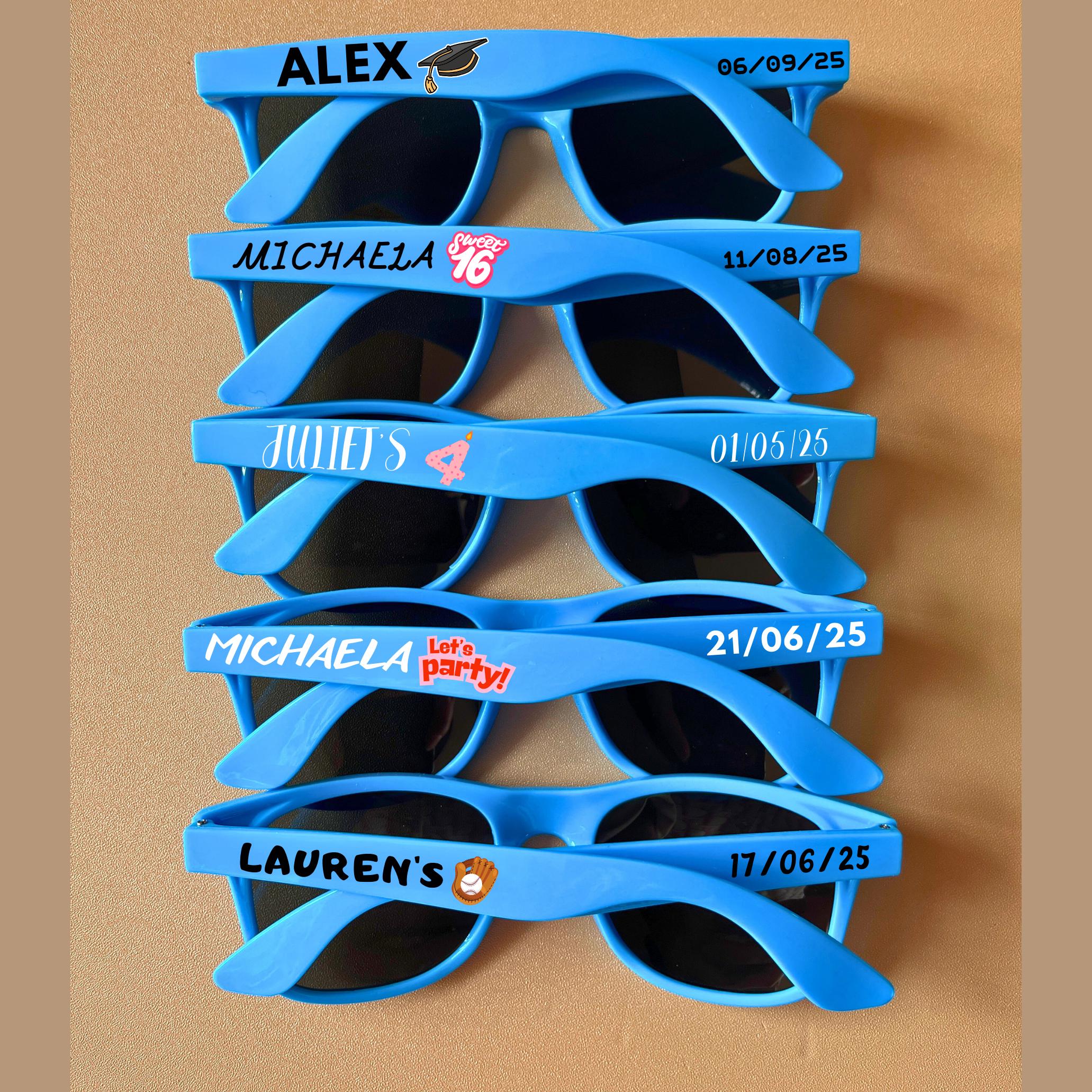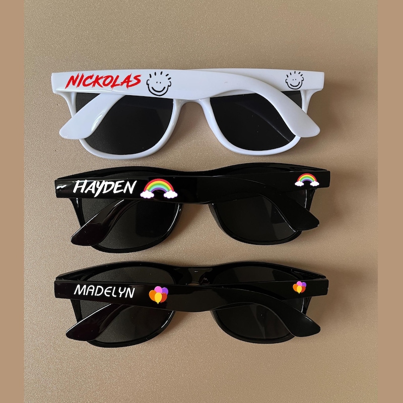 We print birthday party theme,boy scout,girl scout team theme, spring break hiking team for sunglasses favors.