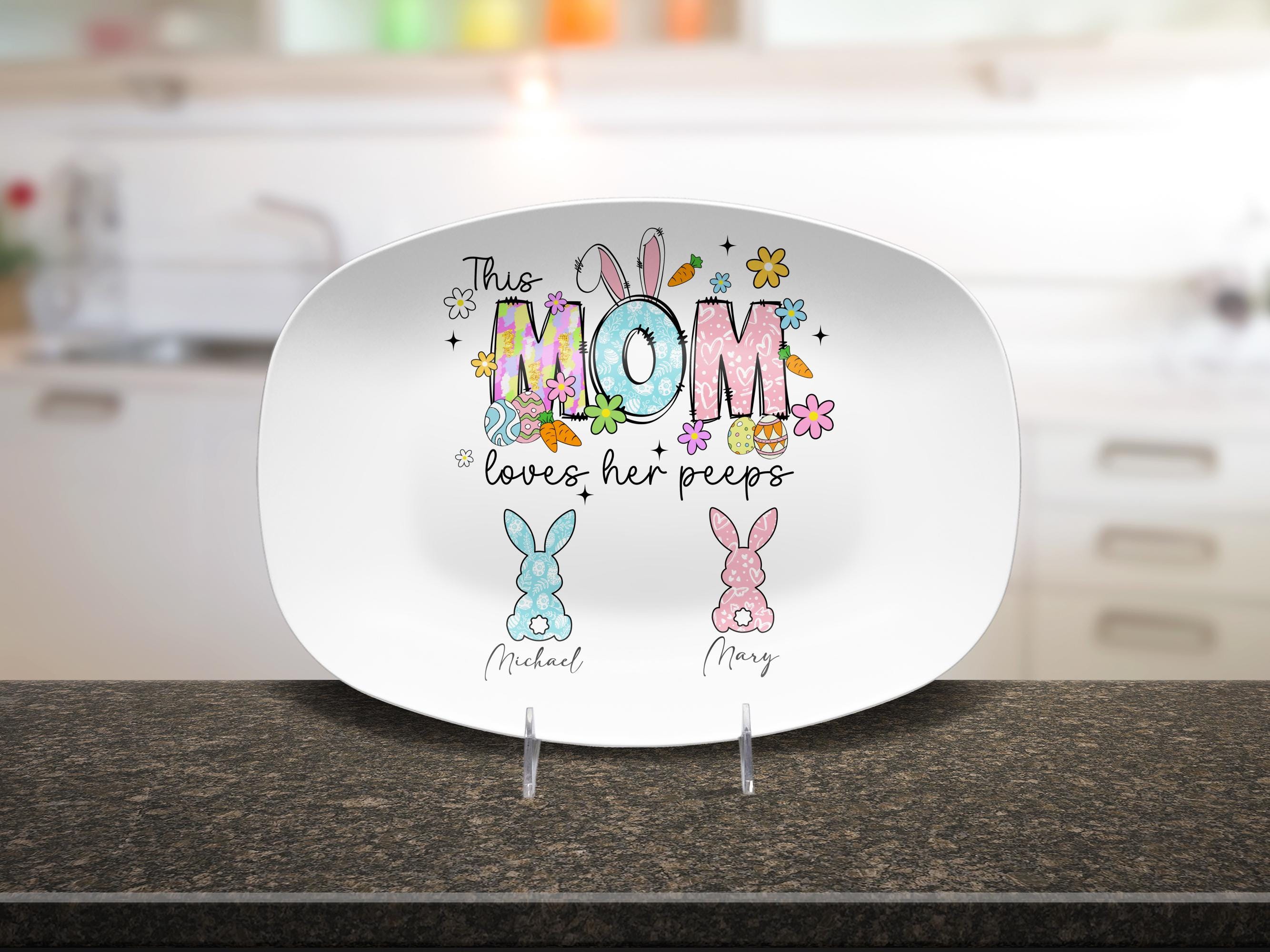 Celebrate Easter in style with this personalized Easter platter, perfect for moms, grandmas, and aunts who cherish their little peeps! Crafted from high-performance medical-grade polymer, this unbreakable 10" x 14" oval plate is microwave, dishwasher, and oven-safe (up to 250°F for 1 hour).