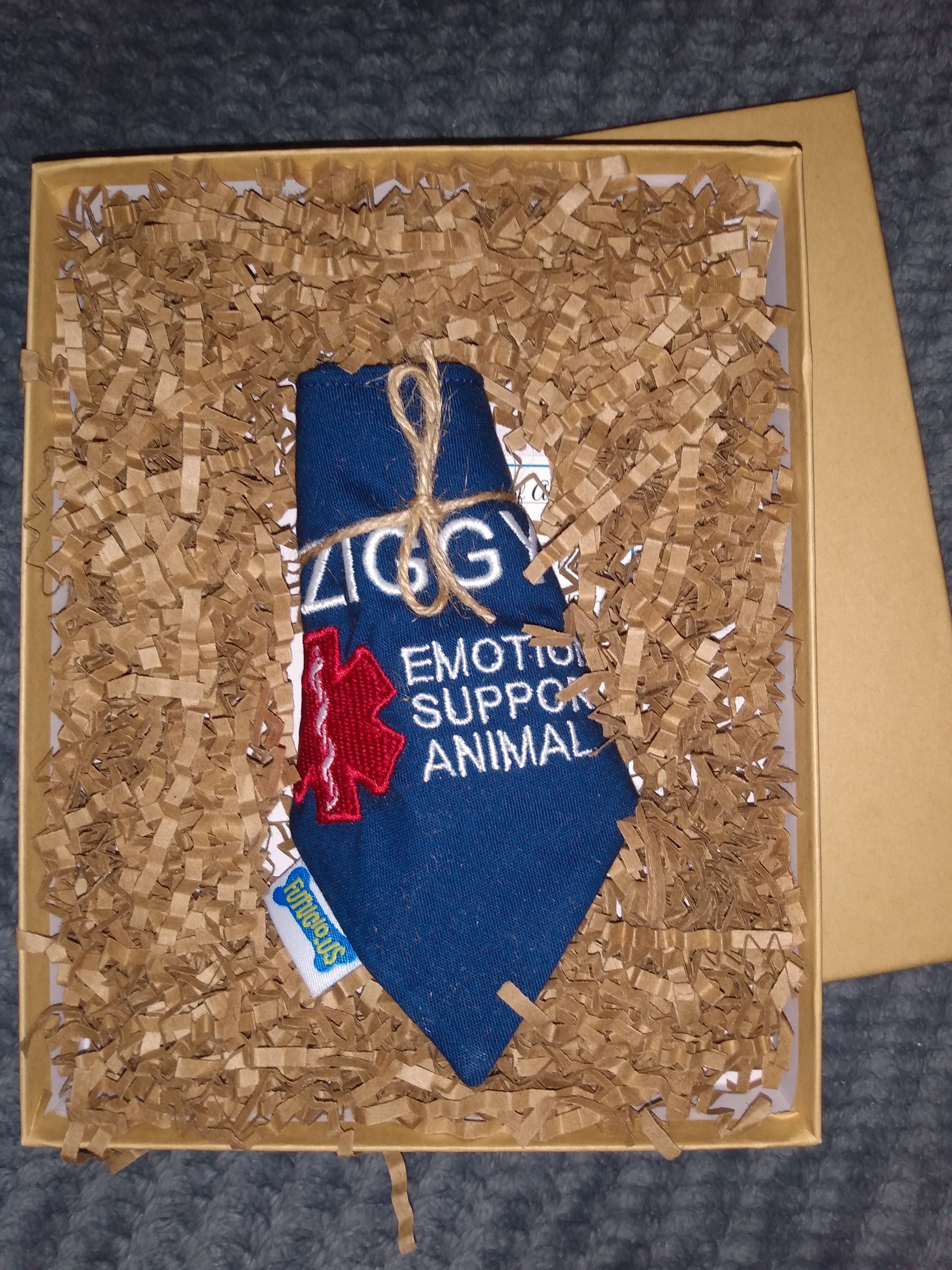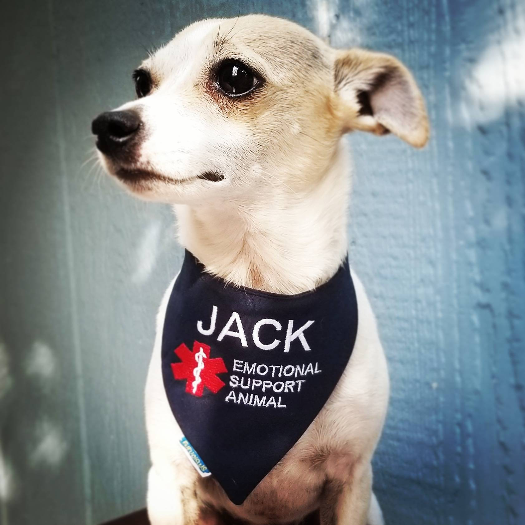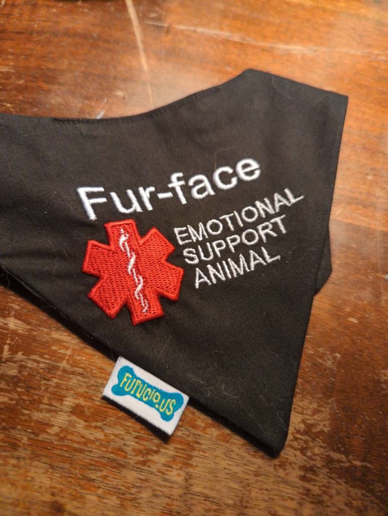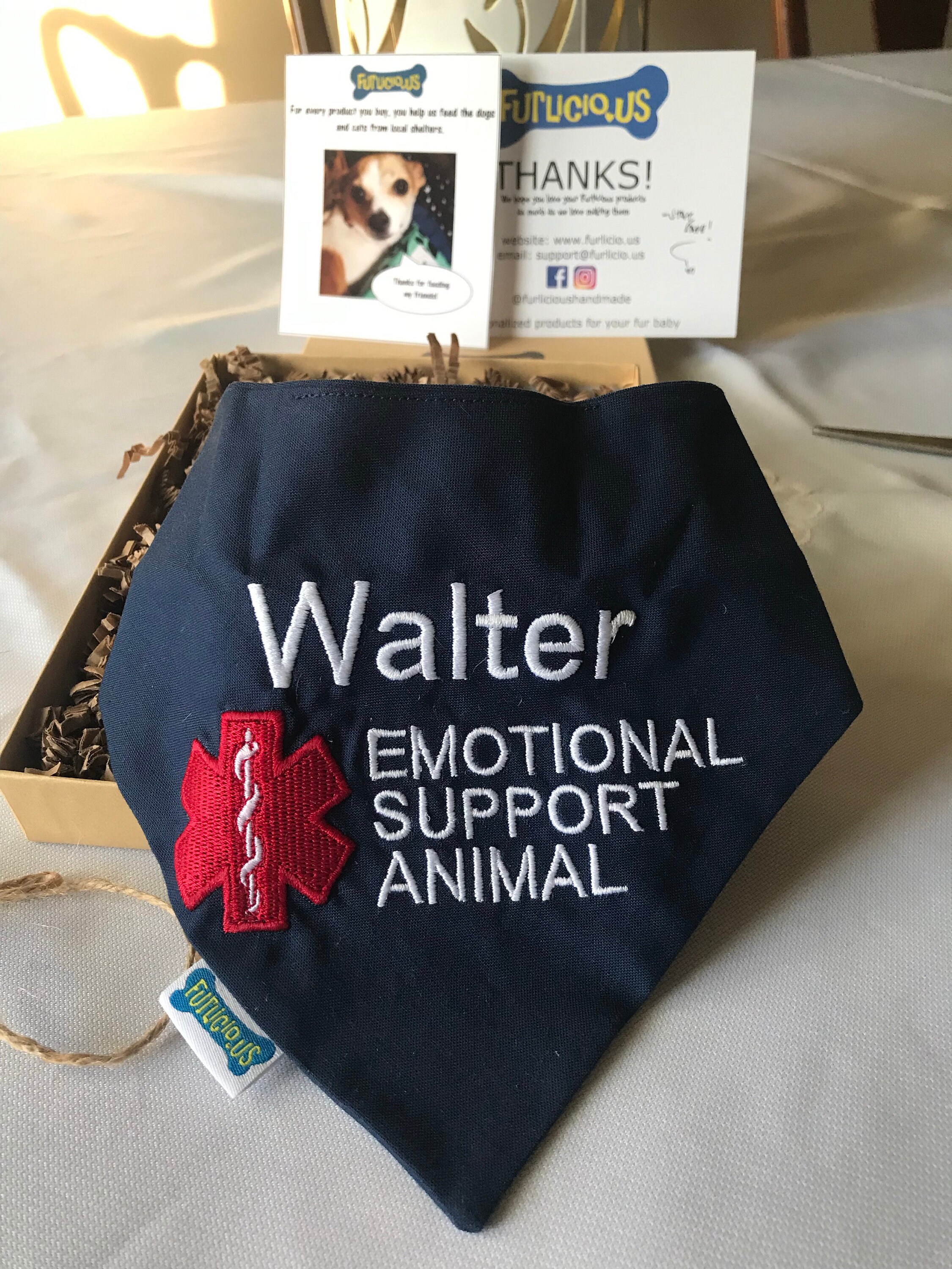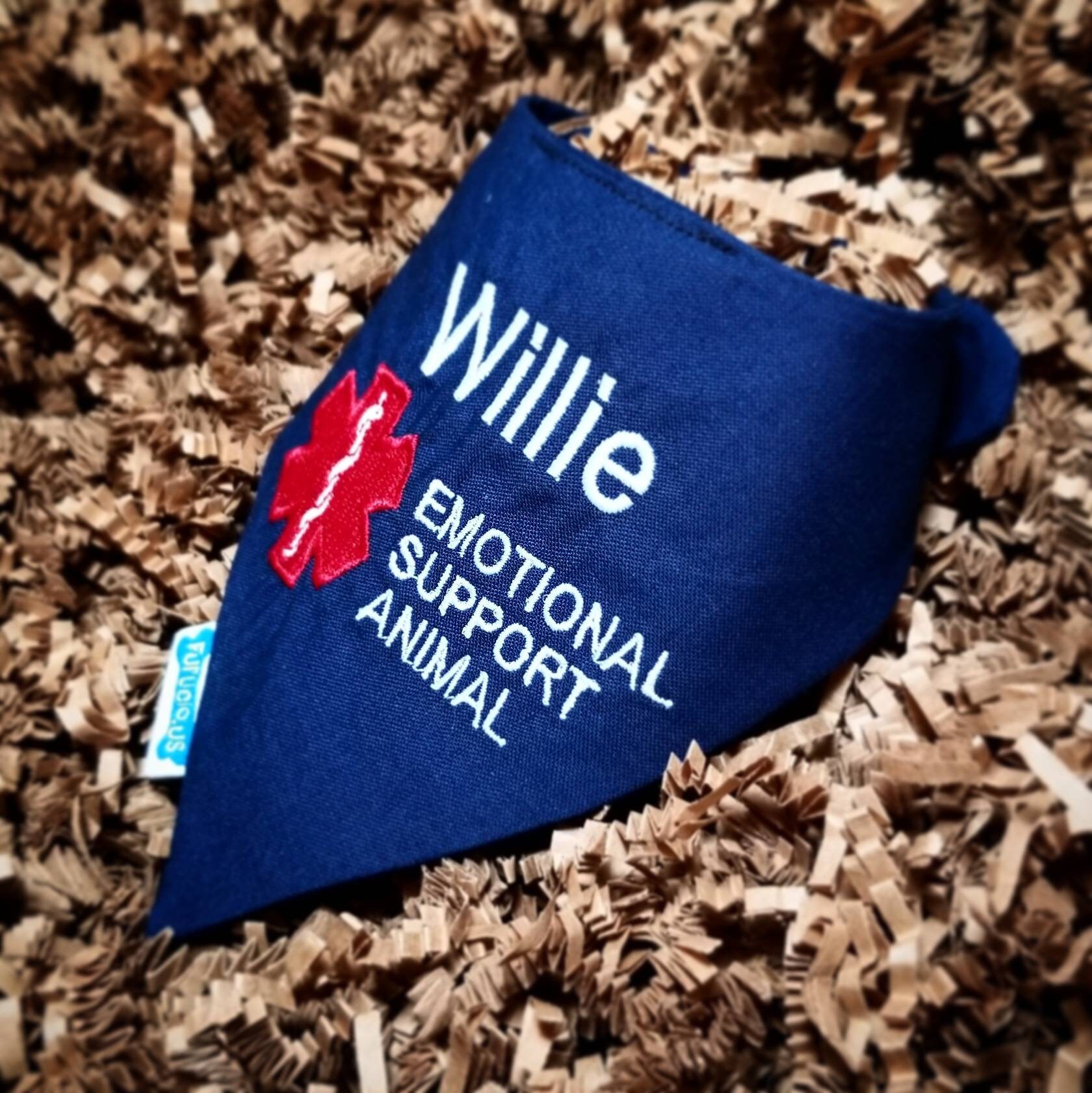 This pet bandana features a 100% cotton fabric front with an emotional support animal-themed print and a reversible 100% cotton back.