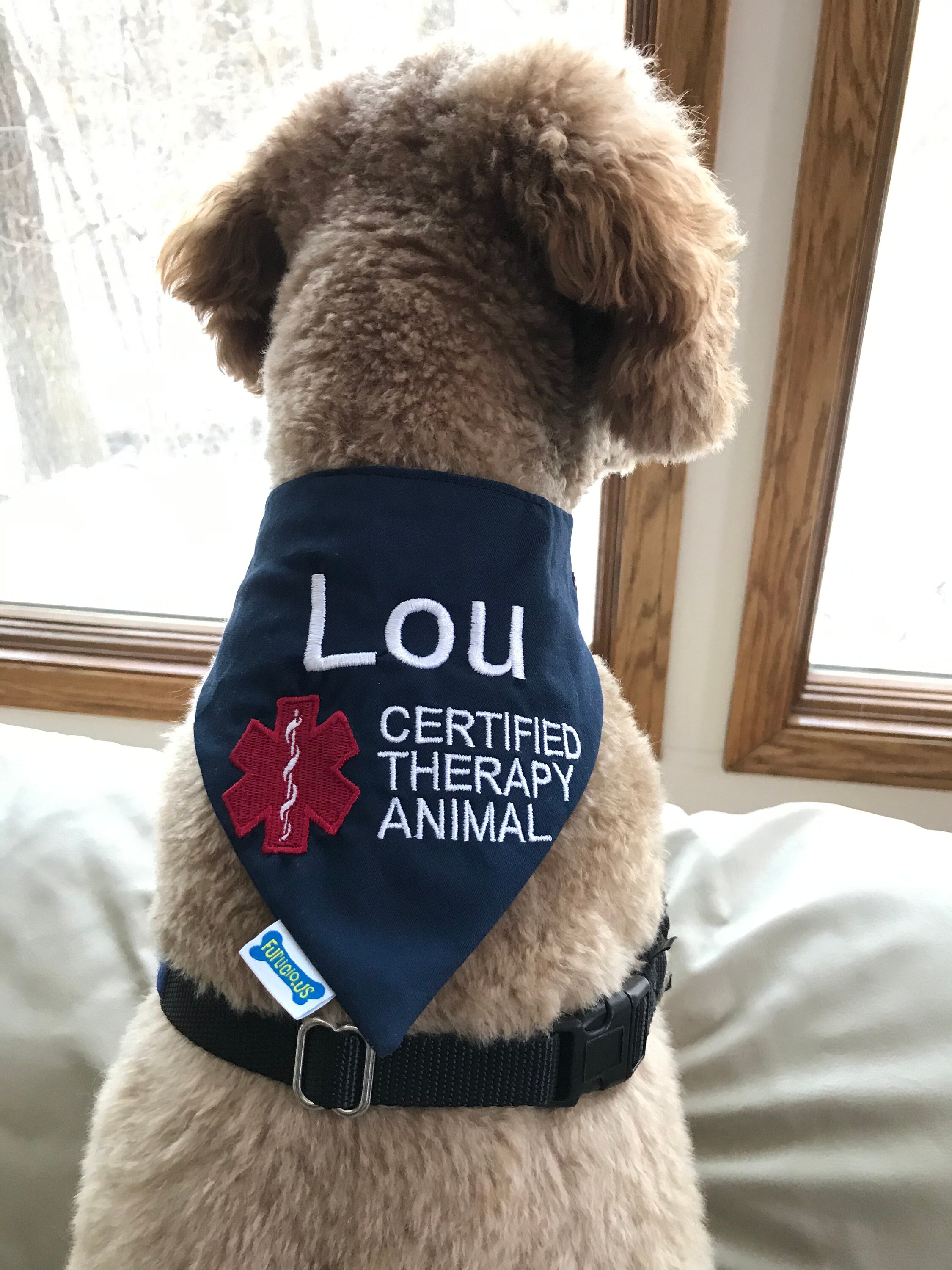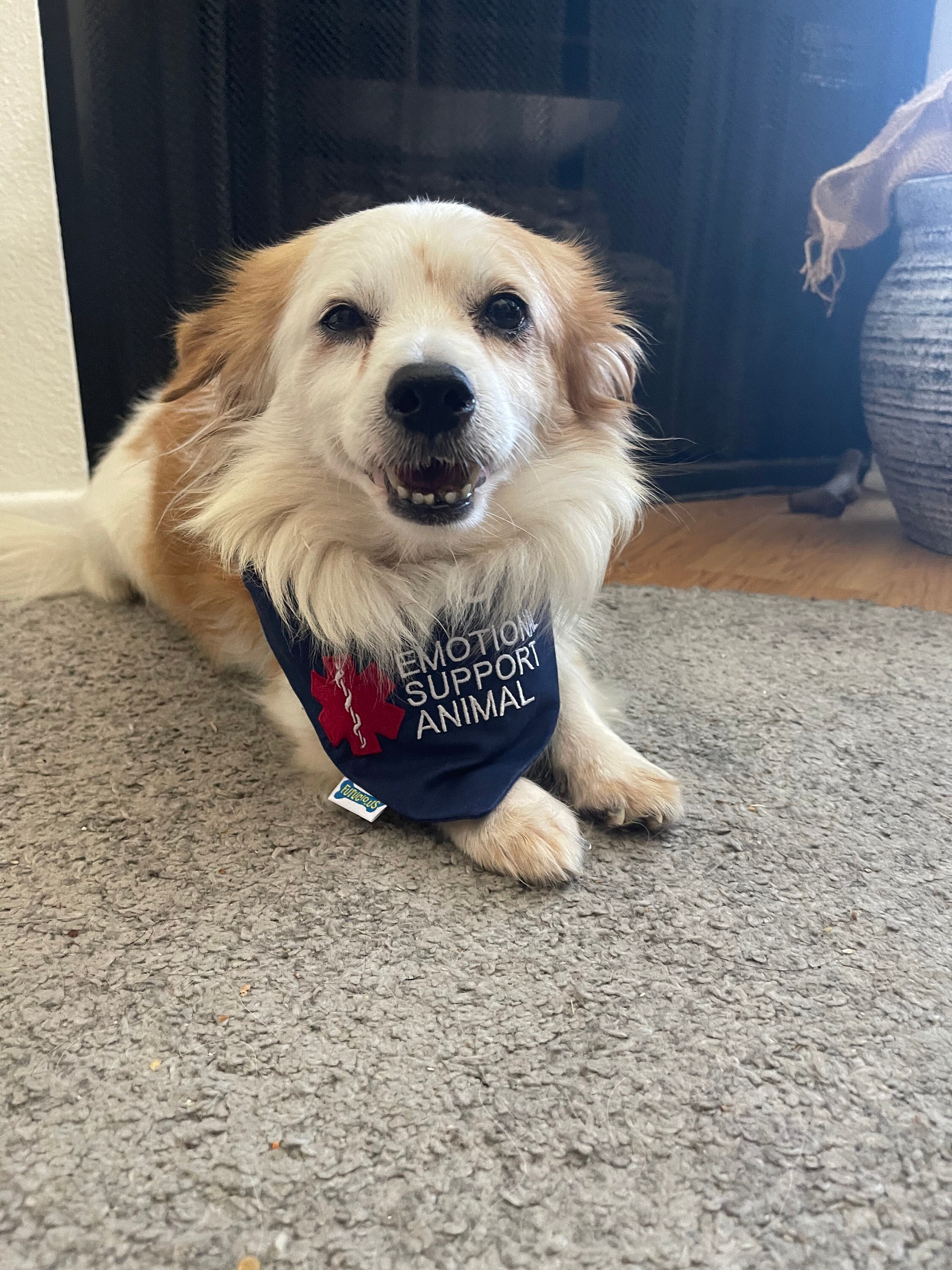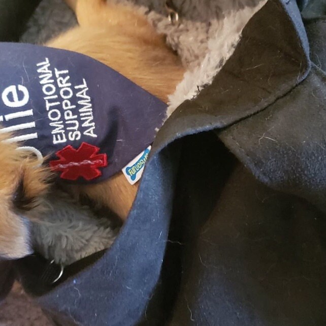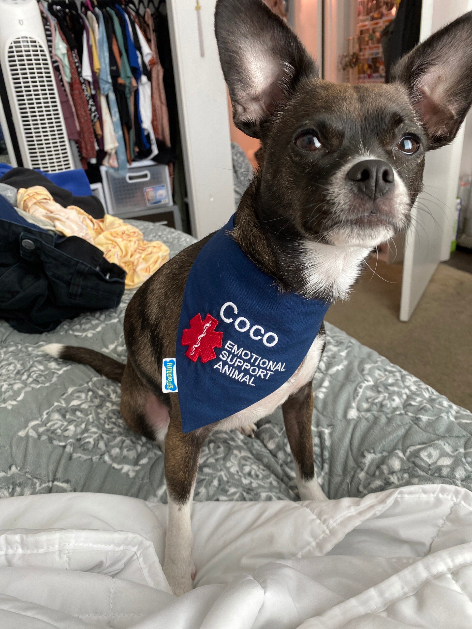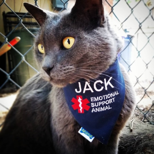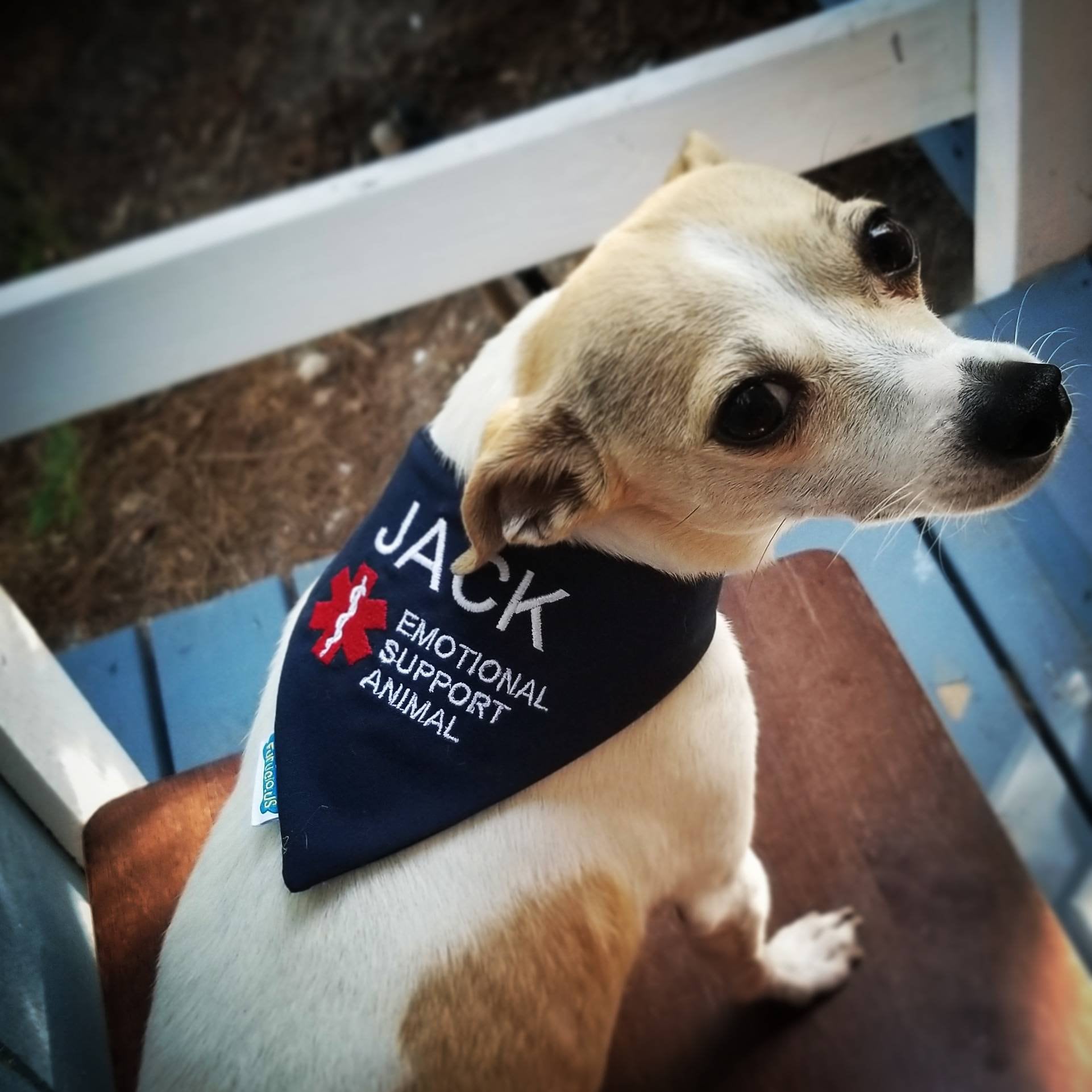 This pet bandana features a 100% cotton fabric front with an emotional support animal-themed print and a reversible 100% cotton back.