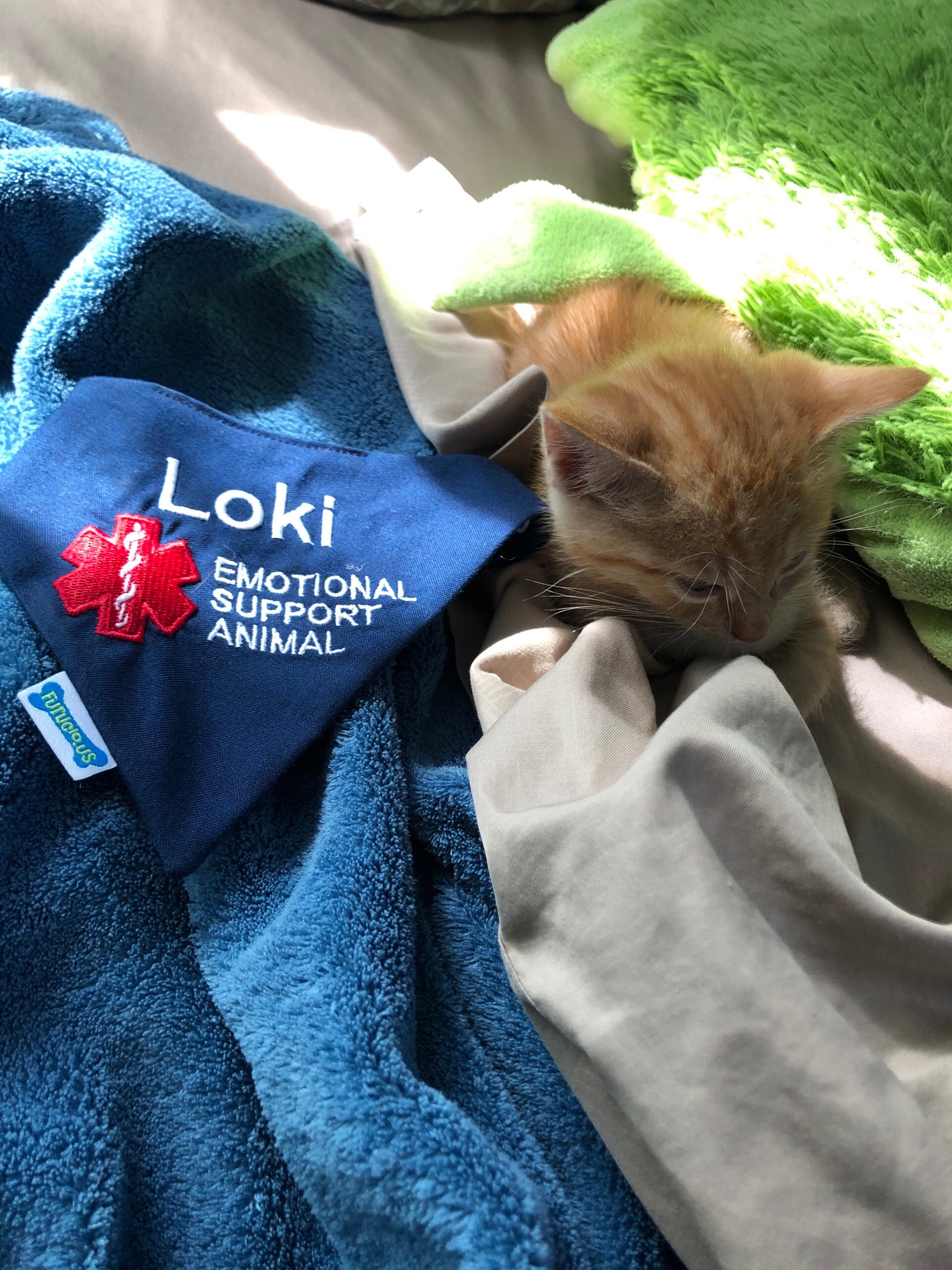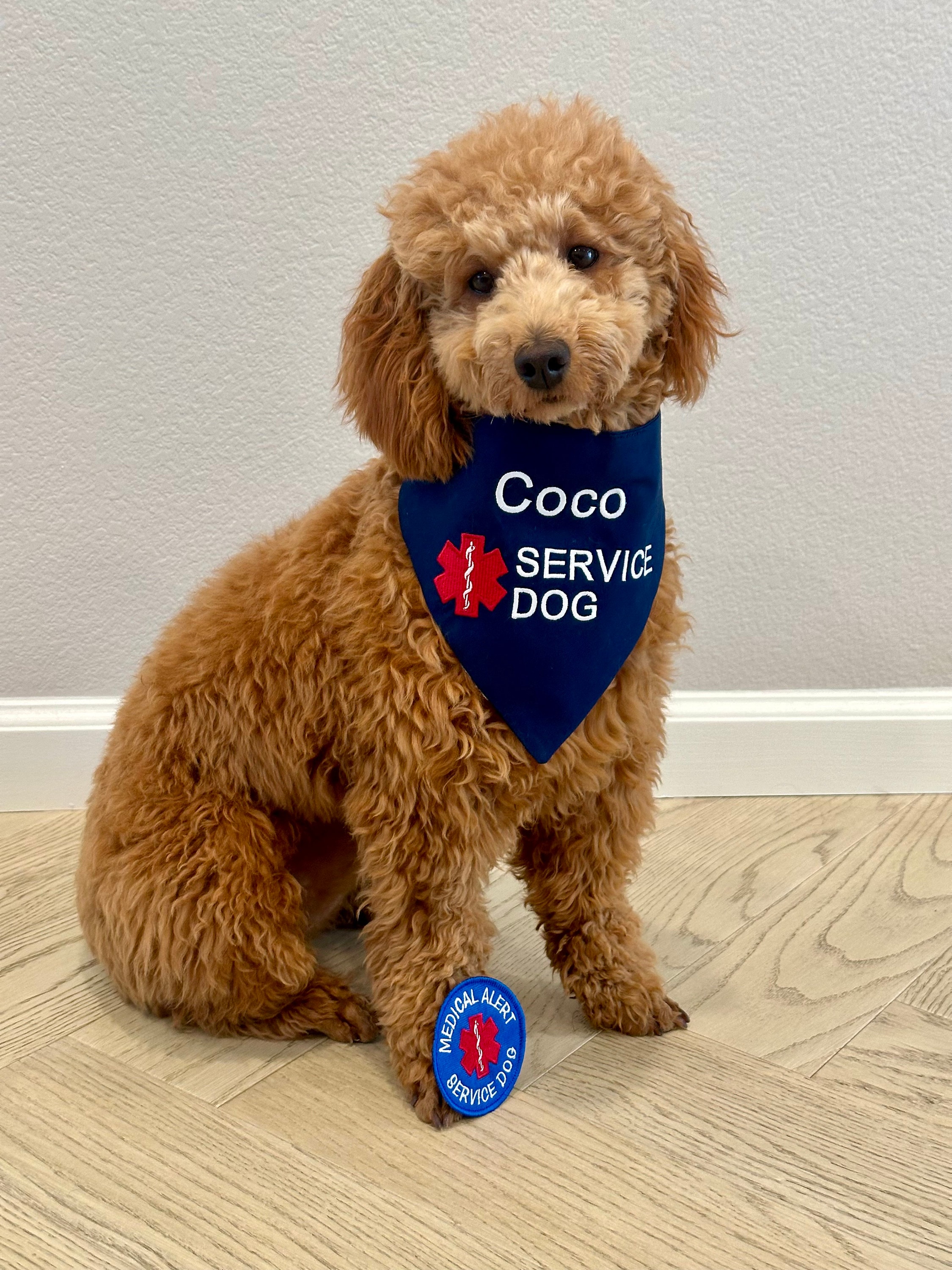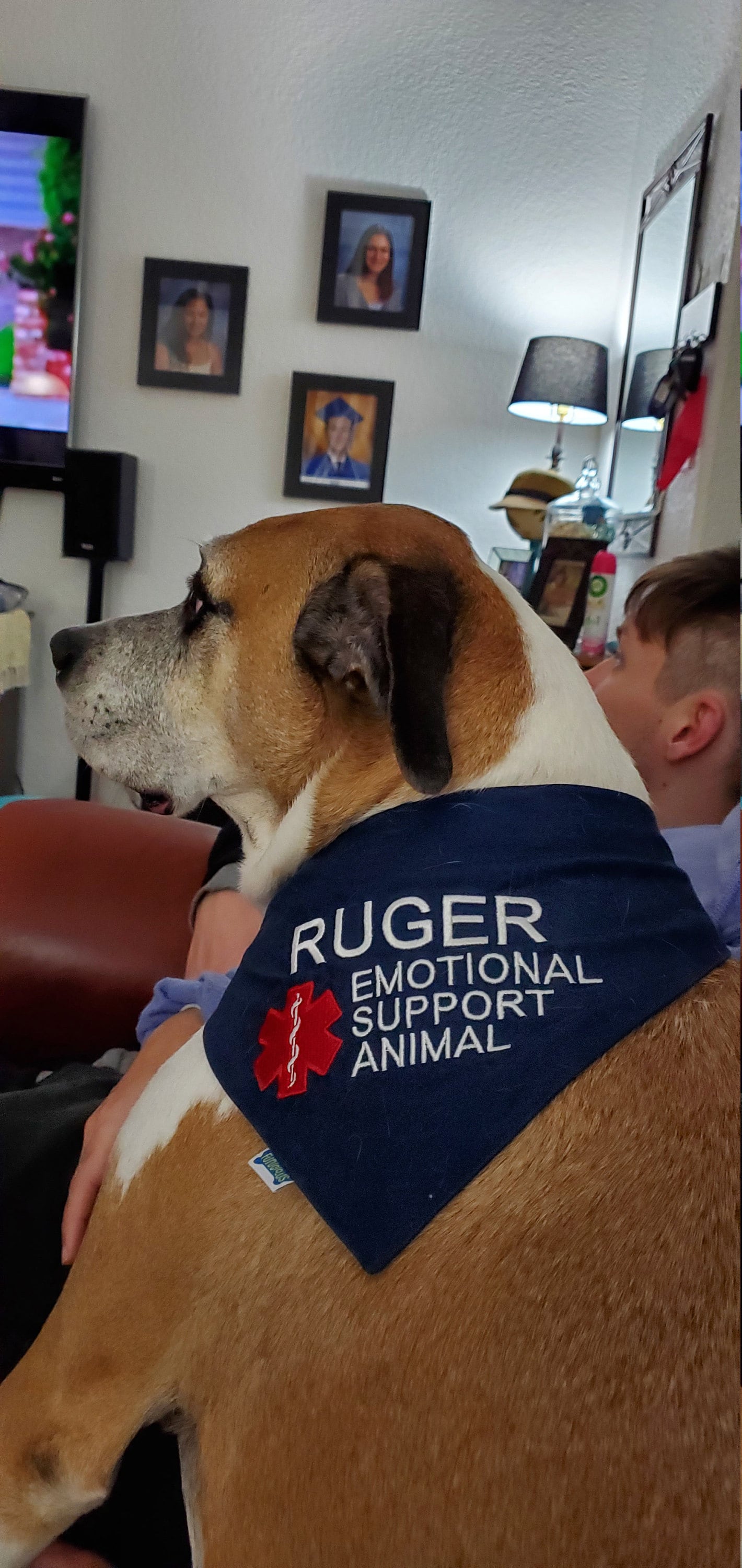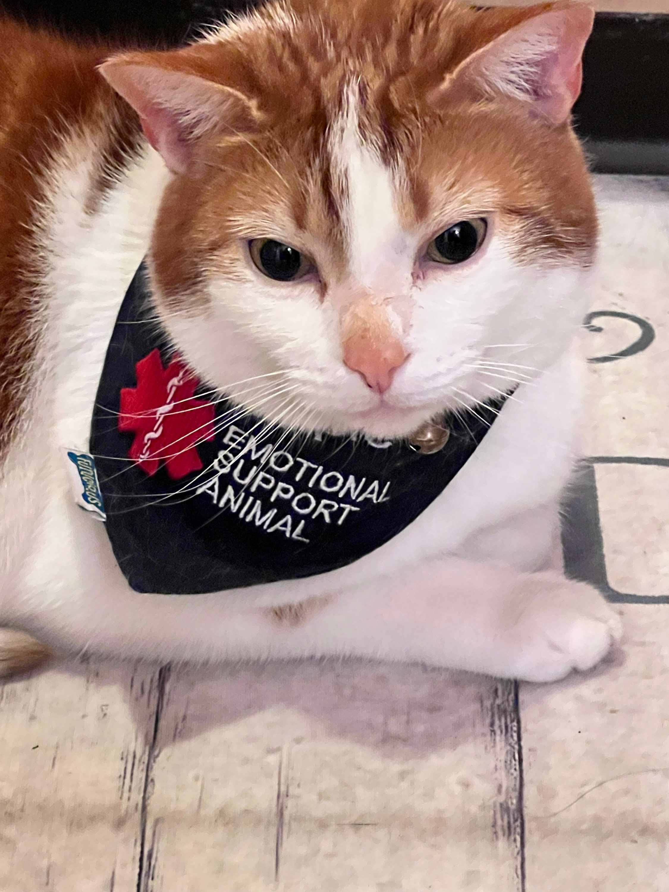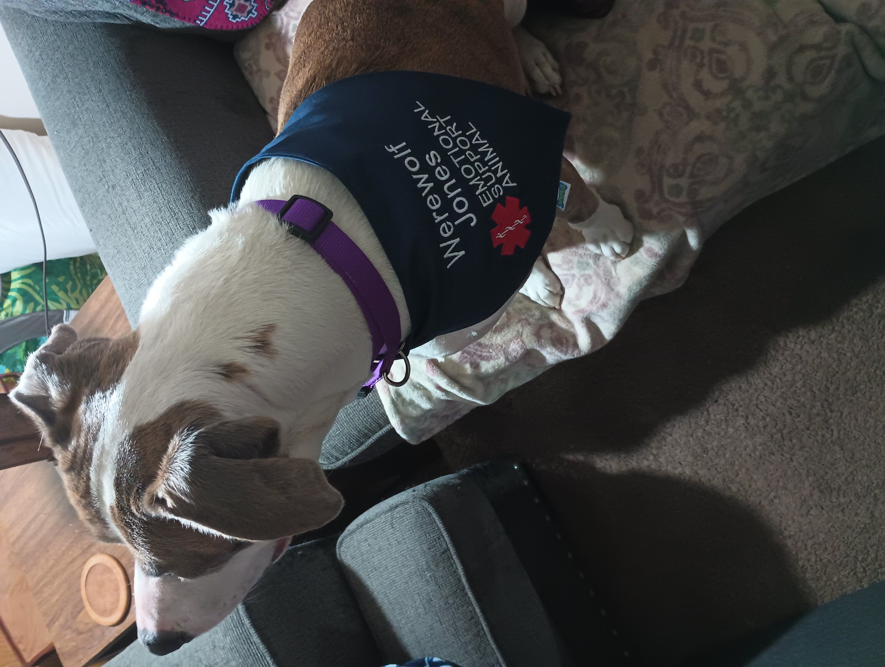 This pet bandana features a 100% cotton fabric front with an emotional support animal-themed print and a reversible 100% cotton back.